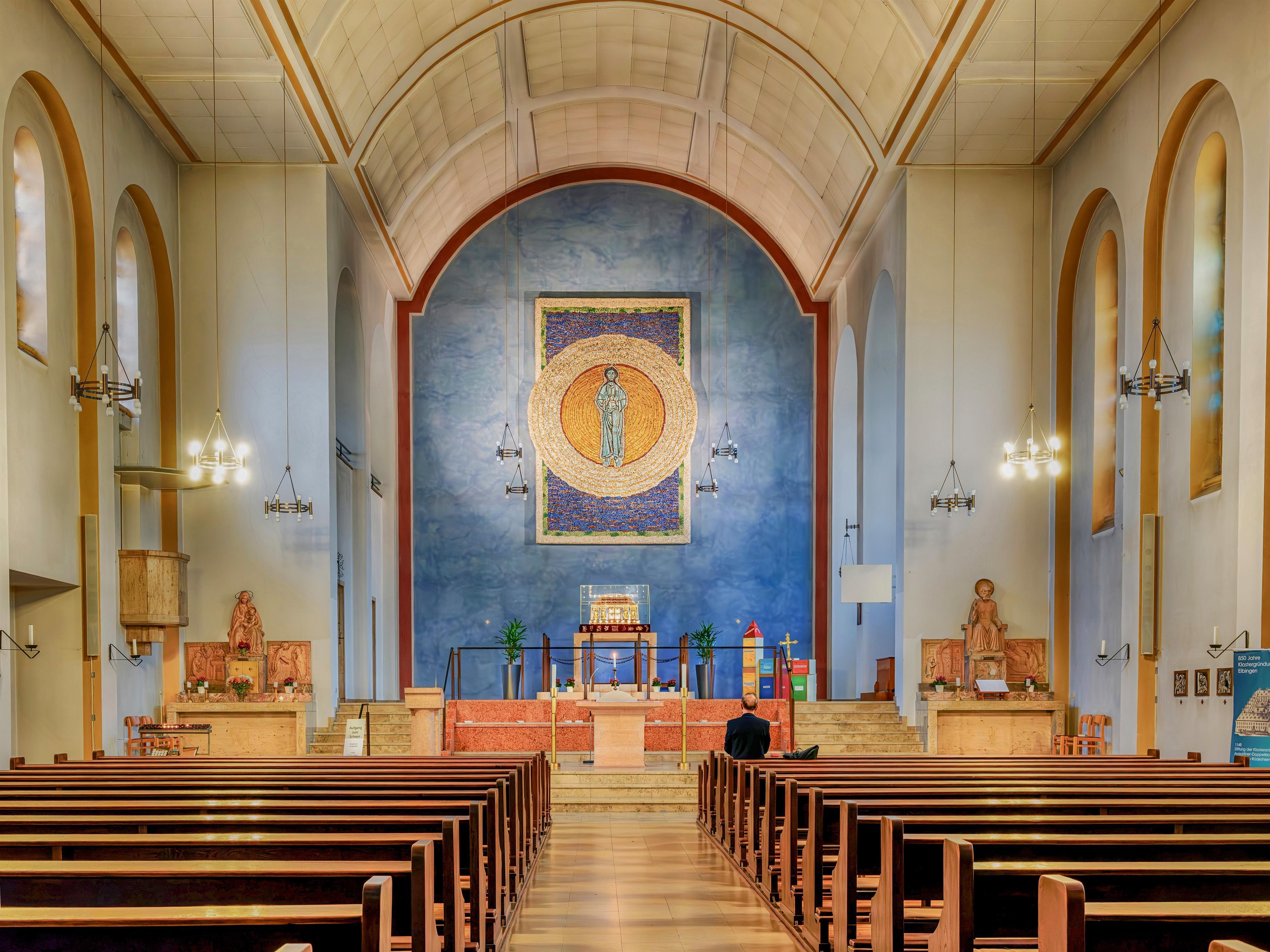 Die Benediktinerabtei St. Hildegard oberhalb der Stadt Rüdesheim am Rhein wurde zu Beginn des letzten Jahrhunderts erbaut. Sie geht unmittelbar auf die Zeit der Heiligen Hildegard von Bingen zurück, die das 1165 neubesiedelte und 1803 säkularisierte „Vorläuferkloster“ Eibingen begründet hatte. Bis heute leben die Benediktinerinnen in St. Hildegard nach über 1400 Jahre alten Ordensregeln, die auf den Heiligen Benedikt zurückgehen –Liebe zu Gott, Menschlichkeit, Freude am Glaubenund ein realistisches, pragmatisches Menschenbild. Ein großer Klosterladen, ein Weingut, ein Dinkelprodukte-Vertrieb, eine Goldschmiede, eine Keramikwerkstatt und eine Restaurierungswerkstatt für kirchliche Archivalien bilden die wirtschaftlichen Grundlagen des weltberühmten Klosters. Die Abtei bietet zudem Gästezimmer an, in denen Menschen für eine begrenzte Zeit hinter den Mauern von St. Hildegard Stille und Einkehr suchen oder an Kursen und Seminaren der Benediktinerinnen teilnehmen können.