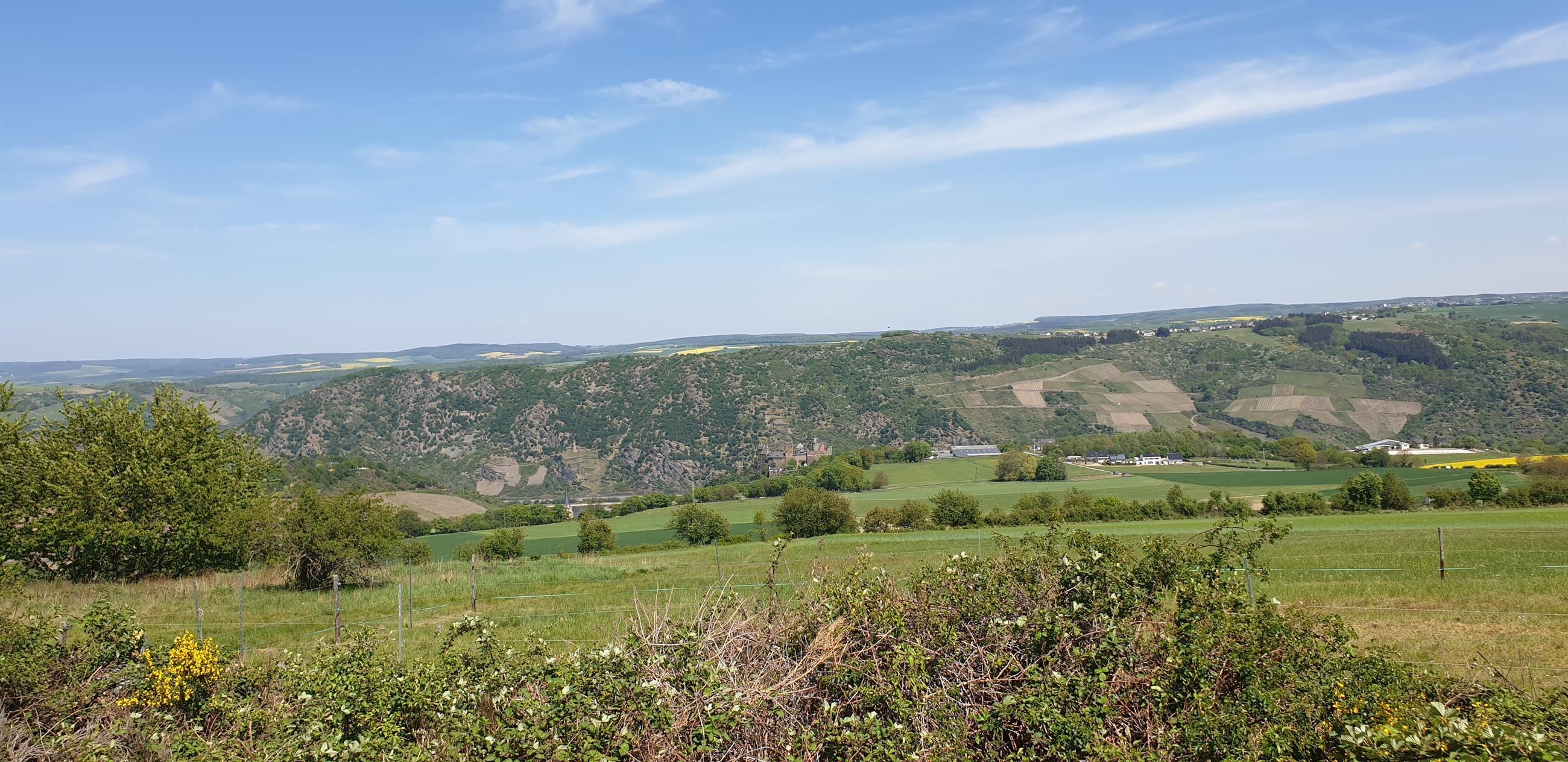 Ein schöner Fernblick bis in den Taunus. Man sieht die Burg Schönburg und auch die Turmspitze der Liebfrauenkirche Oberwesel.