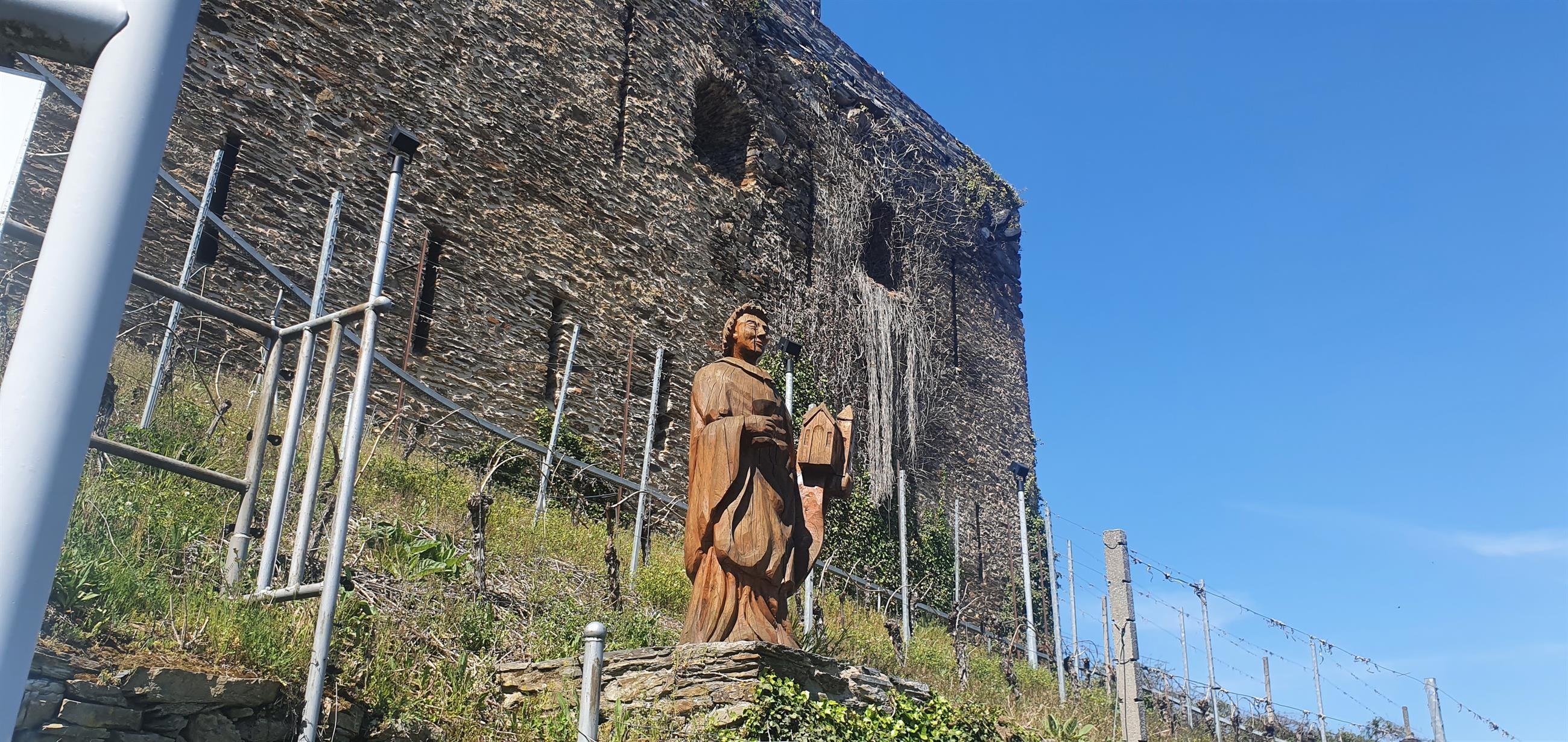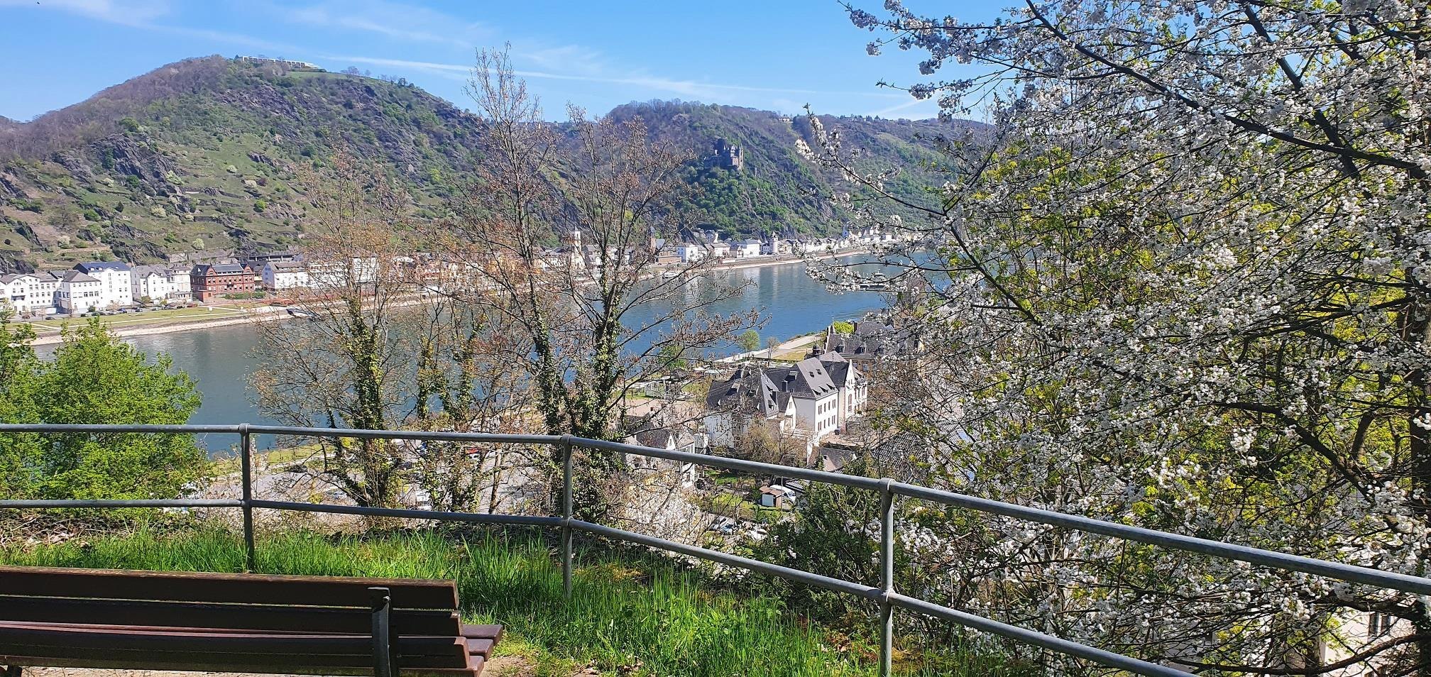Aussichtspunkt mit Ruhebank und Rheinblick am Landgräfin Anna-Elisabeth-Weg. Am Pfad von der Jugendherberge zur Burg Rheinfels.
