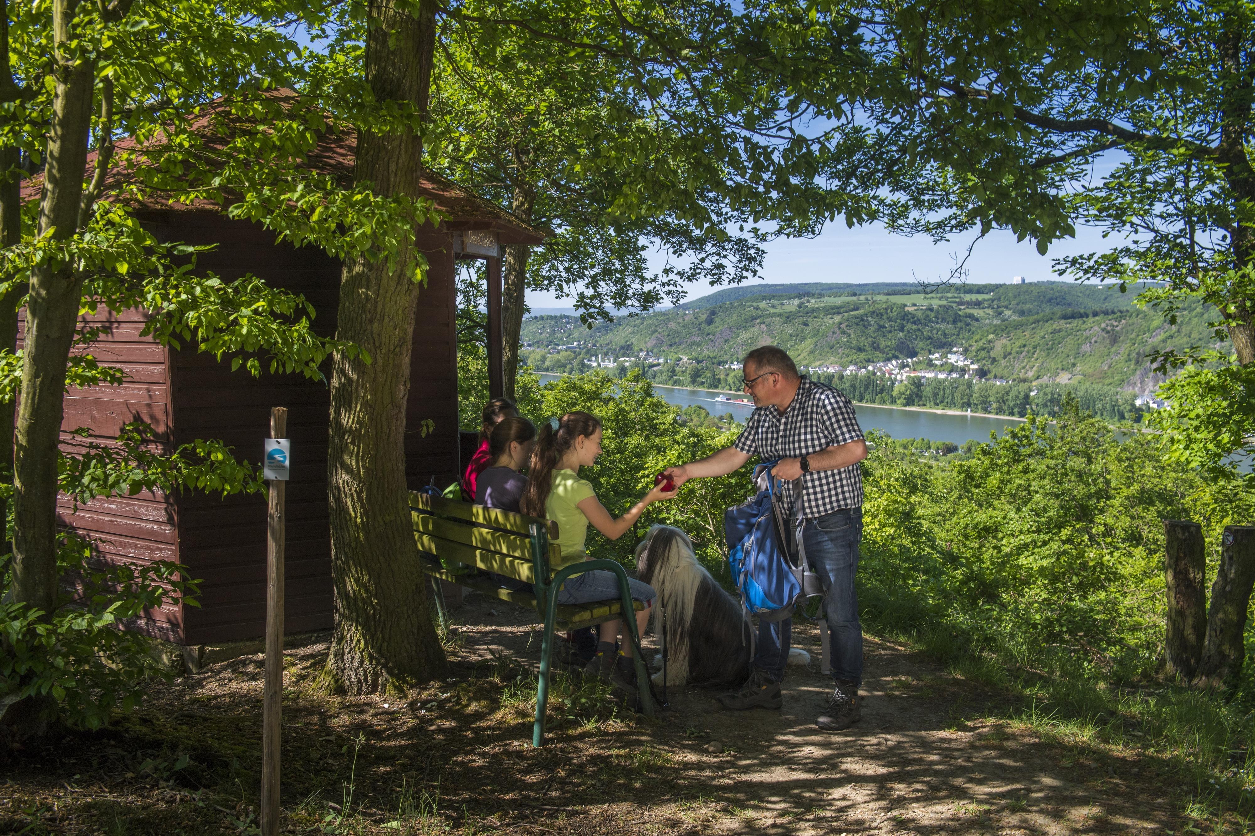 Wanderschutzschütte oberhalb der Gemeinde Spay mit Blick in das Rheintal und auf die Marksburg.