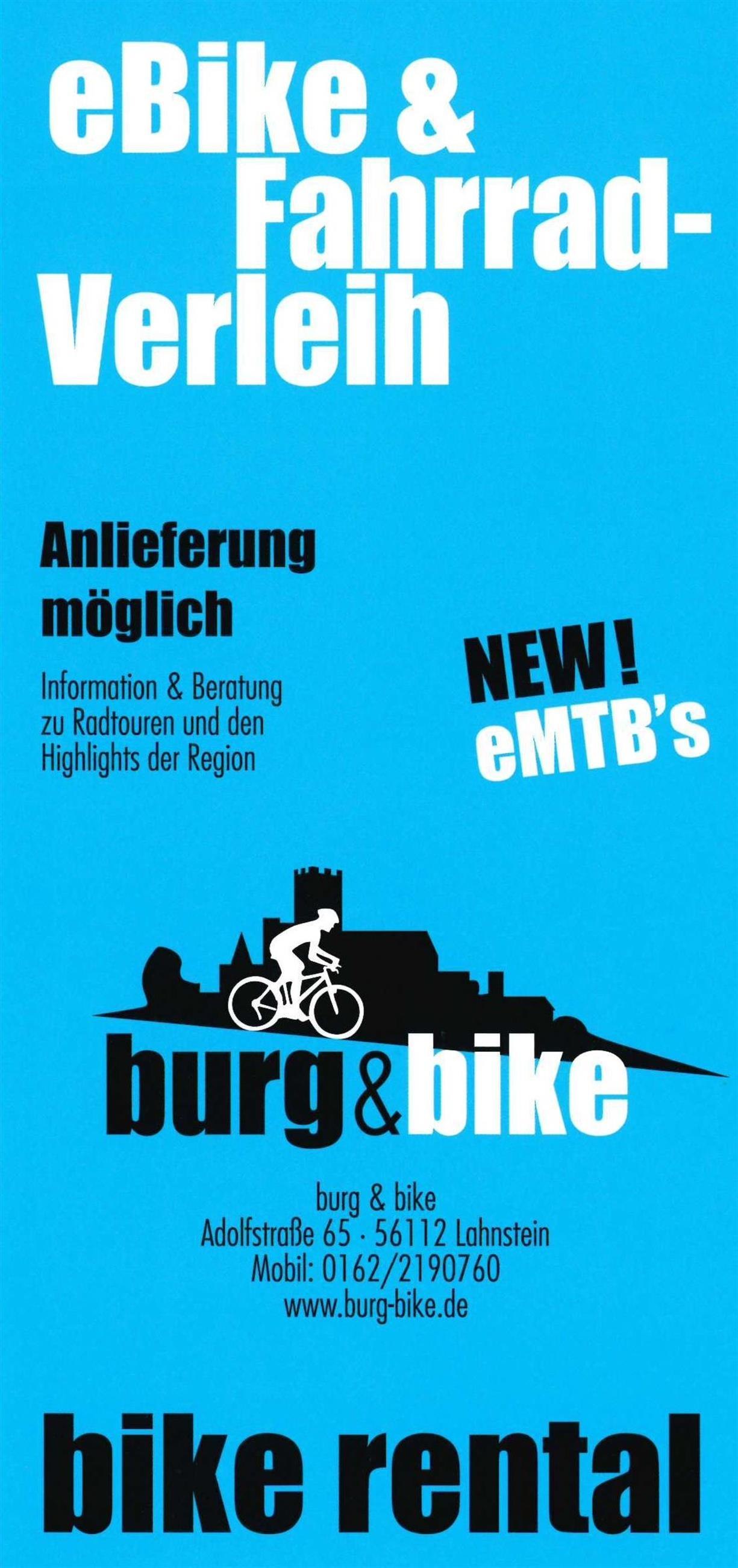 Burg und Bike ist Spezialist in Koblenz / Lahnstein für Fahrradverleih, eBikes und Radreisen an Rhein, Lahn und Mosel. Gerne bieten sie Ihnen auch Ferienwohnungen und Apartments an.