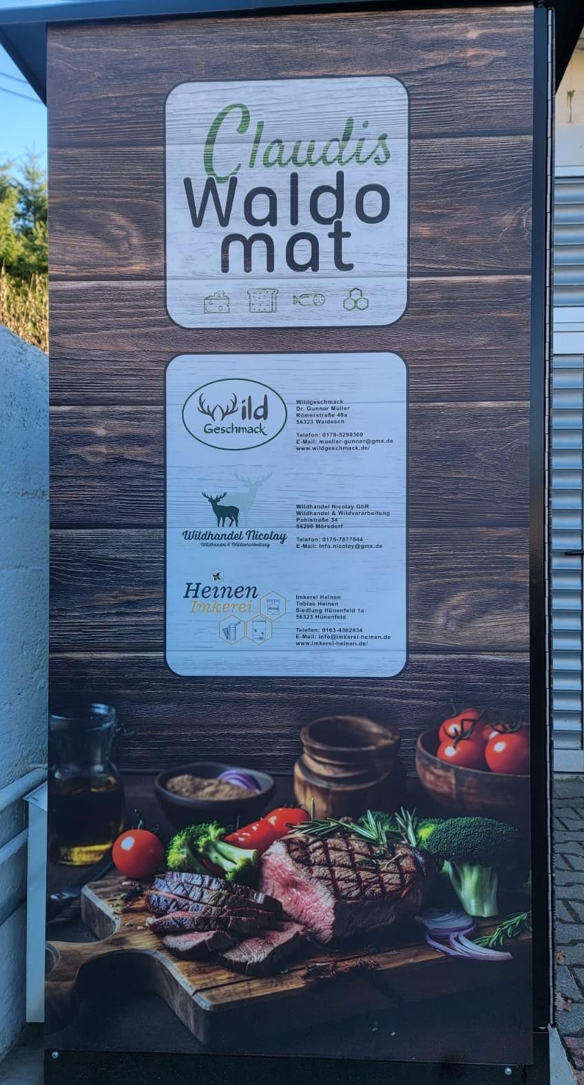 Claudis Waldomat ist ein Verkaufsautomat in Waldesch, der rund um die Uhr frisches, regionales Wildfleisch, hochwertiges Rindfleisch sowie verschiedene Honigprodukte anbietet. Wir, die Familie Müller, möchten so umwelt- und tierwohlbewussten Mitmenschen diese hochwertigen Lebensmittel zugänglich machen und sie dafür begeistern. Das Sortiment umfasst je nach Saison Produkte vom Reh, Rotwild und Wildschwein, darunter Bratwürste, Pfefferbeißer, Schinken, Salami, Steaks und weitere Spezialitäten. Die Bezahlung erfolgt ausschließlich bargeldlos.