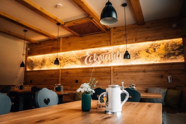 Die Eckmühle wurde Anfang 2021 komplett neu geplant und umgebaut. Ein gemütliches Wanderlokal mit einem urigen Biergarten sind entstanden. Hier inmitten der Natur kann jeder einmal die Seele baumeln lassen und sich vom stressigen Alltag erholen.