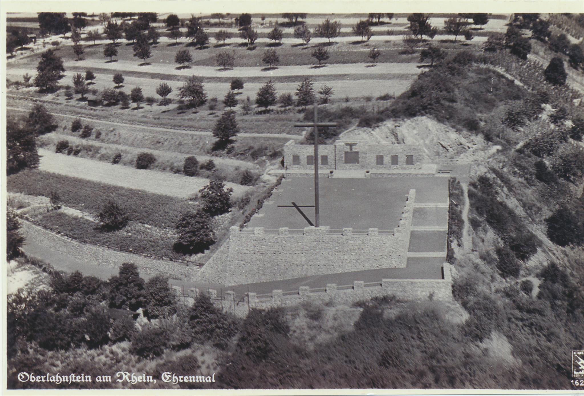 Über dem Schützenplatz (Rheinhöhenweg) in Oberlahnstein führt heute ein Fußpfad zum Ehrenmal für die Gefallenen des Ersten Weltkriegs. Das weithin sichtbare Kreuz wurde auf einer Bergkuppe unter den Nationalsozialisten im Stil der Zeit geplant und ausgeführt. Typisch für die Zeit war die Anlage eines Aufmarschplatzes (26x16 Meter ) und die Hinzufügung der Herrschaftssymbole des Nationalsozialismus. Beides wurde mit „Adler“ und „Flammenschale“ verwirklicht. In der zweijährigen Bauphase vom 1. Spatenstich bis zur Einweihung wurden „17.500 cm³ Erd- und Felsmassen bewältigt, 932 cm³ Mauerwerk aus Bruchsteinen aufgeschichtet und 108 cm³ Eisenbeton zu tragbaren Fundamenten gestampft“, heißt es in den Unterlagen. Auf den sieben gusseisernen Tafeln stehen die Namen von 194 gefallenen oder vermissten Soldaten des Ersten Weltkriegs 1914/18. An der zinnengekrönten Rheinfront wurde das 19,80 m hohe Eisenkreuz errichtet.