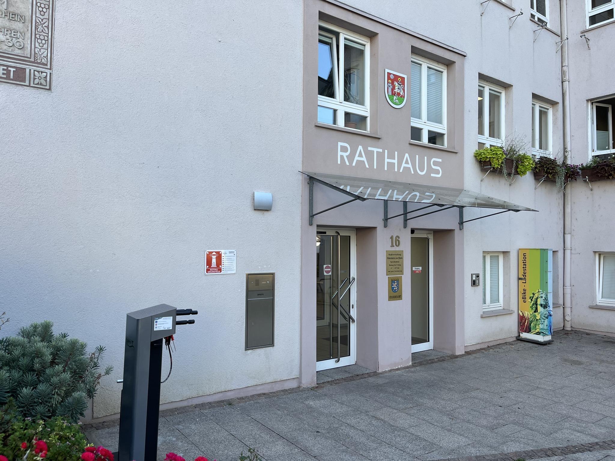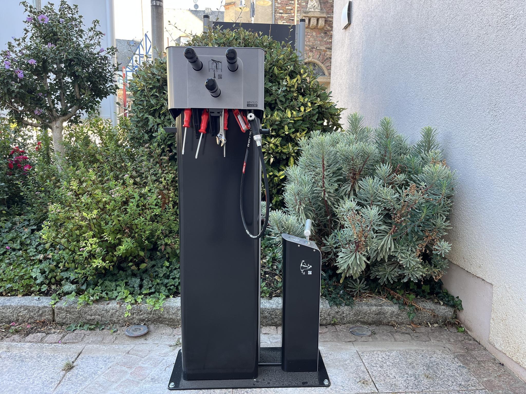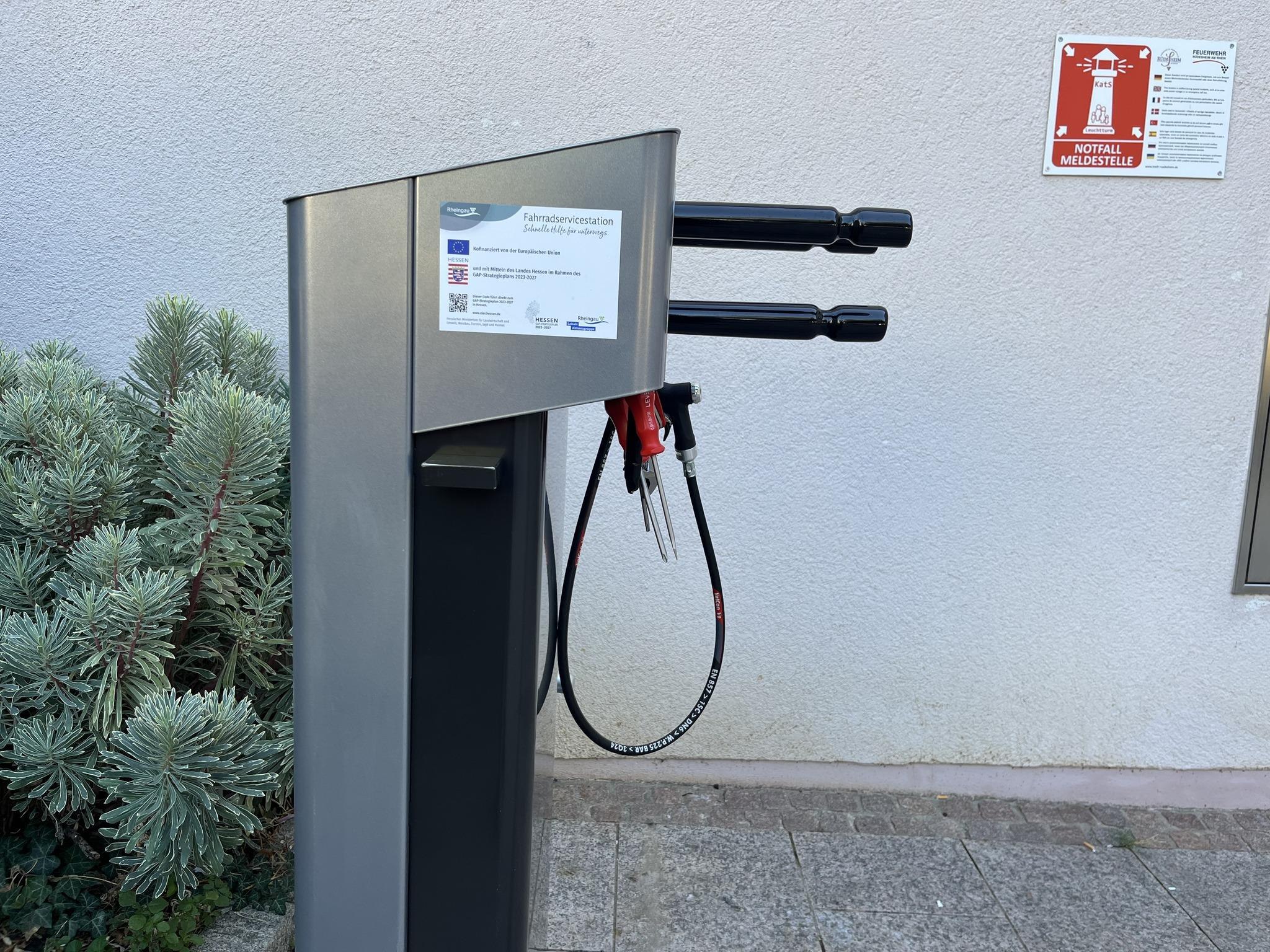 Eine Fahrrad-Servicestation steht nun direkt vor dem Rüdesheimer Rathaus und kann dort von Radfahrerinnen und Radfahrern kostenlos genutzt werden.