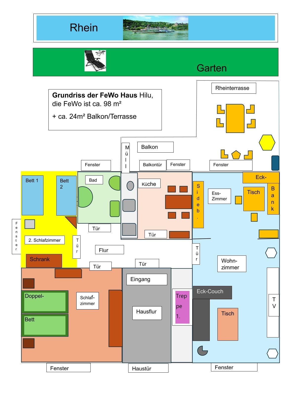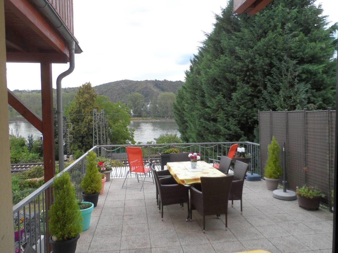 Schöne, großzügig und gemütliche Ferienwohnung, zentral gelegen im Weltkulturerbe Oberes Mittelrheintal, direkt am Rhein mit großer Rheinterrasse und gehobener Ausstattung. Genießen Sie von der großen Rheinterrasse oder im Garten zur Mitbenutzung, ausgestattet mit Sitzmöbeln und Sonnenliegen, den direkten Blick auf den Rhein. Die Wohnung befindet sich im Erdgeschoss unseres Hauses, ist 98 m² groß und aufgeteilt in einen großzügigen Wohnraum mit Esszimmer, Küche mit Zugang zum Balkon, zwei Schlafzimmer sowie ein Badezimmer. Sie ist für vier Erwachsene oder zwei Erwachsene und Kinder geeignet. Die Wohnung ist nicht barrierefrei! Die kleine Stadt Rhens bietet neben Bäckereien, Restaurants auch Einkaufsmöglichkeiten an. Zahlreiche Wander- und Radwege starten in unmittelbarer Nähe zur Ferienwohnung. Auch ein Schiffsanleger erreichen Sie in 10 Gehminuten.