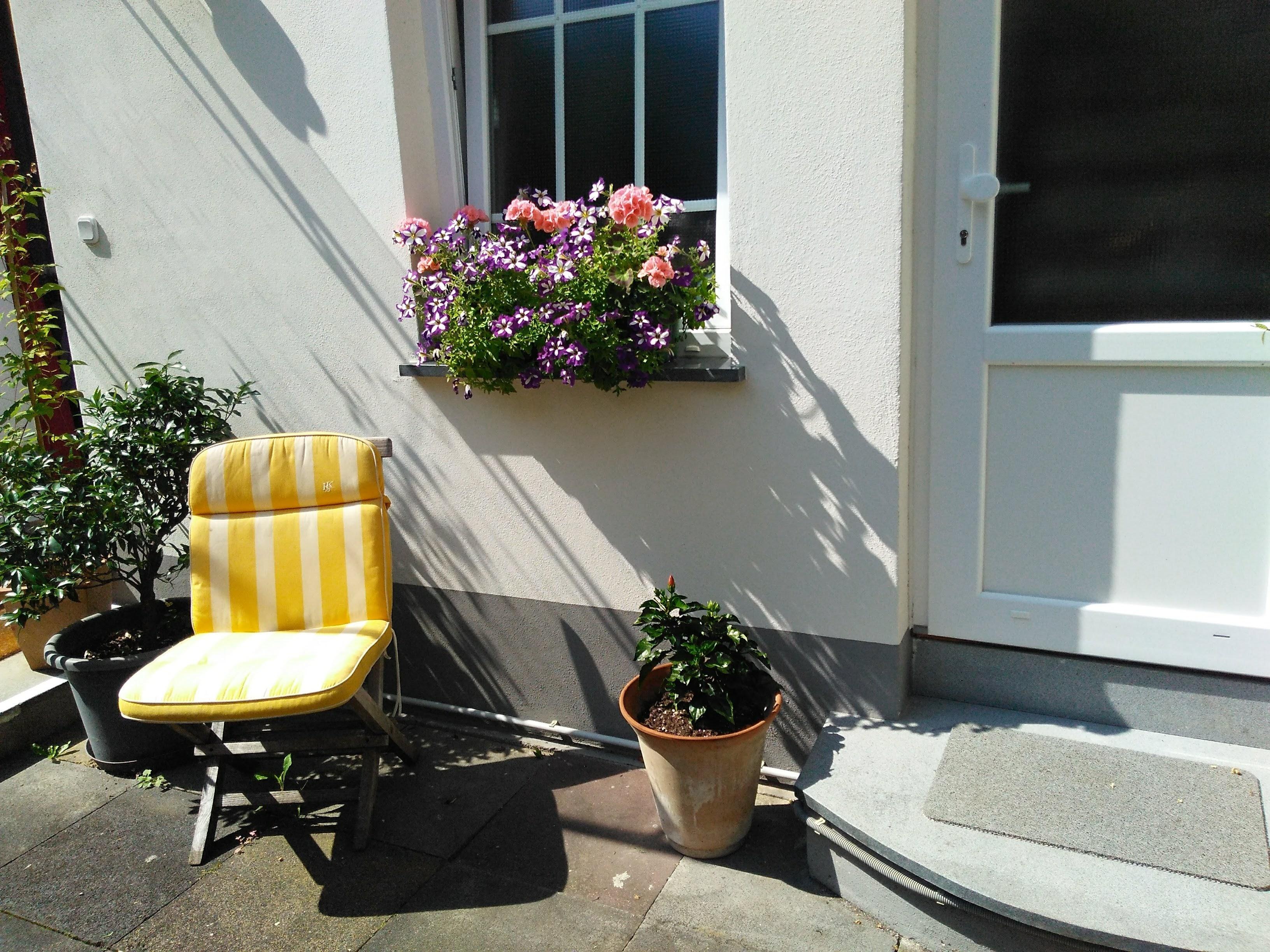 Vom sonnigen Innenhof führt eine Treppe in den 1.Stock. Rechts von der Diele ist die großzügige, modere Dusche. Geradeaus befindet sich die Küche mit einem gemütlichen Essplatz. Vom Schlafzimmer aus geht es auf die große Terrasse, wo es sich gut frühstücken lässt und die Liegen zum Entspannen einladen, umrahmt von schönen Blumen und Pflanzen.