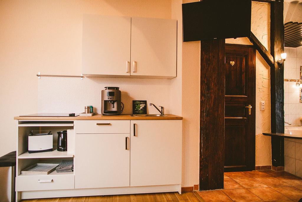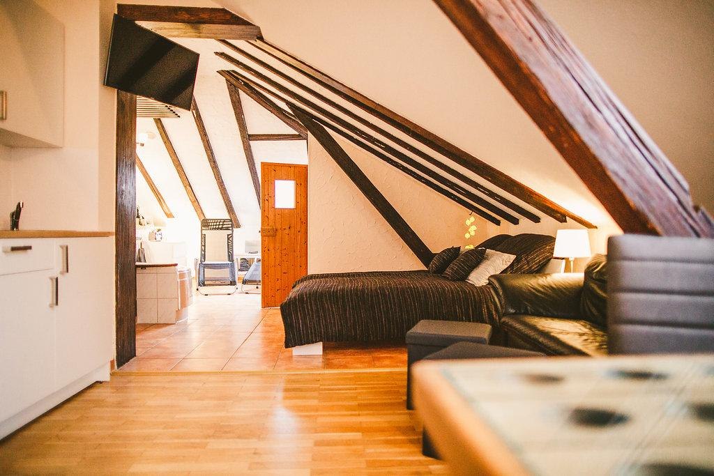 Komfortable Möblierung und eine moderne, liebevolle Ausstattung erwarten Sie in unseren klimatisierten Ferienwohnungen im Dachgeschoss des historischen Hauses. Die Küchen sind mit Kaffevollautomat, Geschirr, Wasserkocher, Toaster usw. ausgestattet.