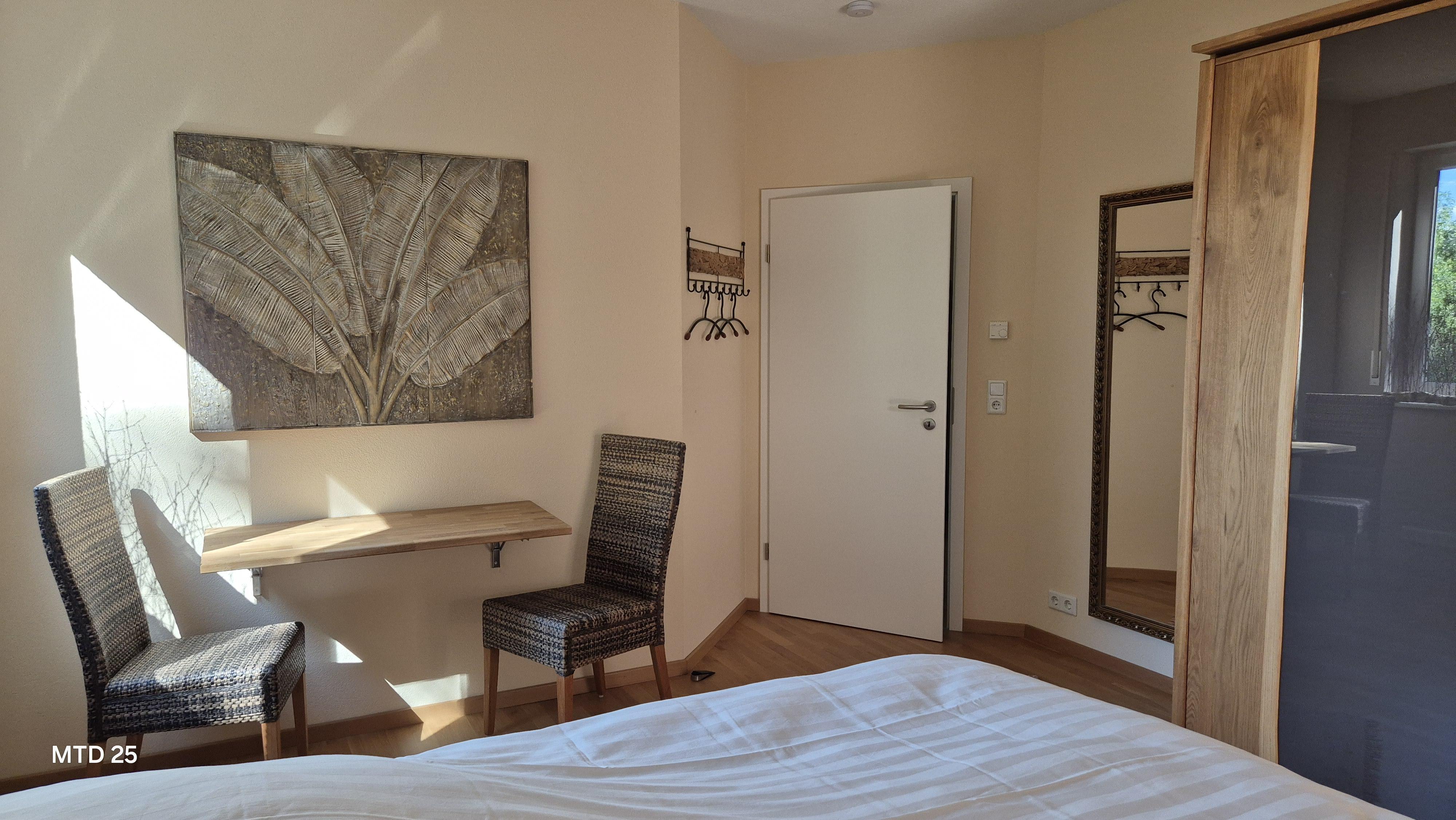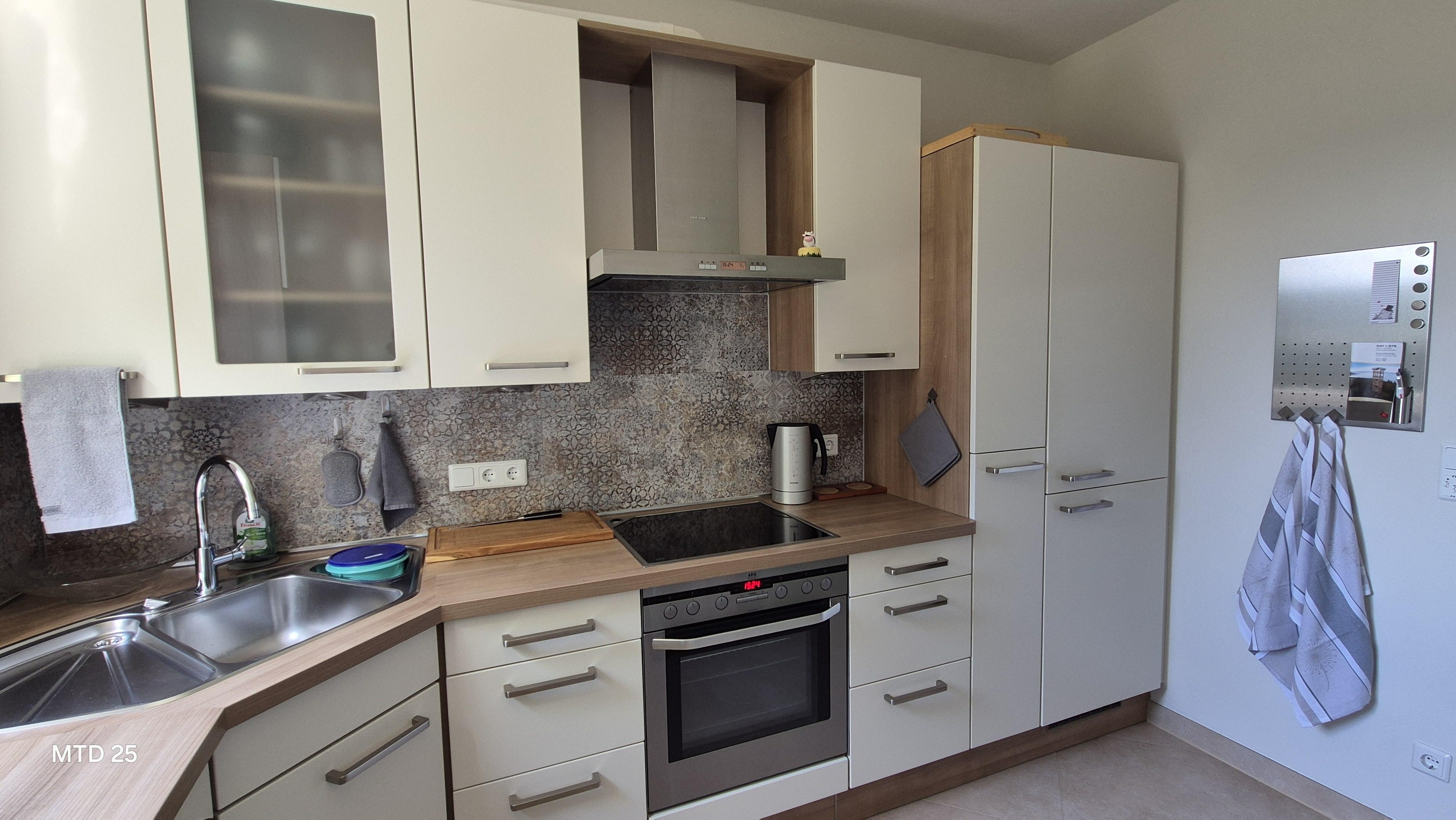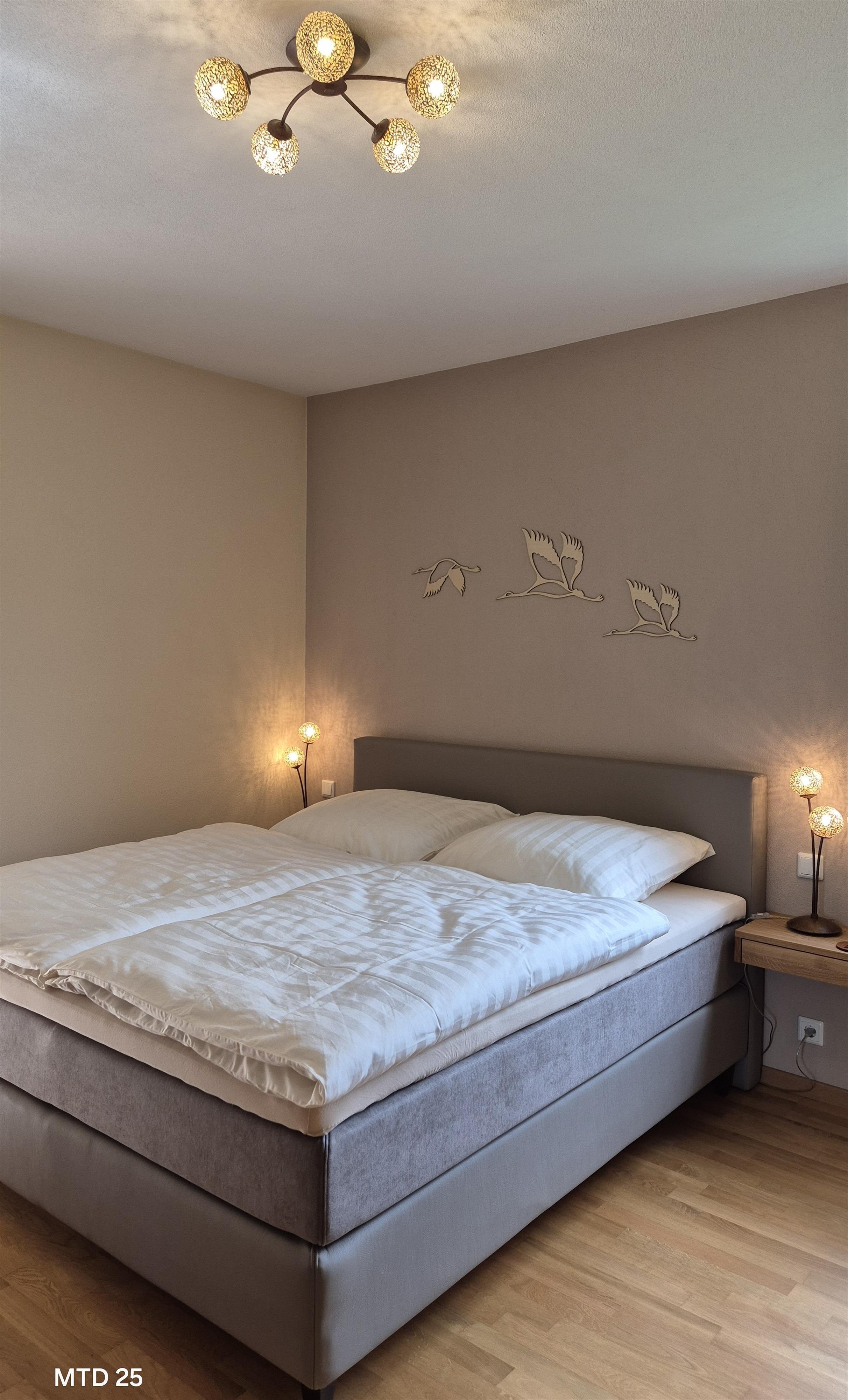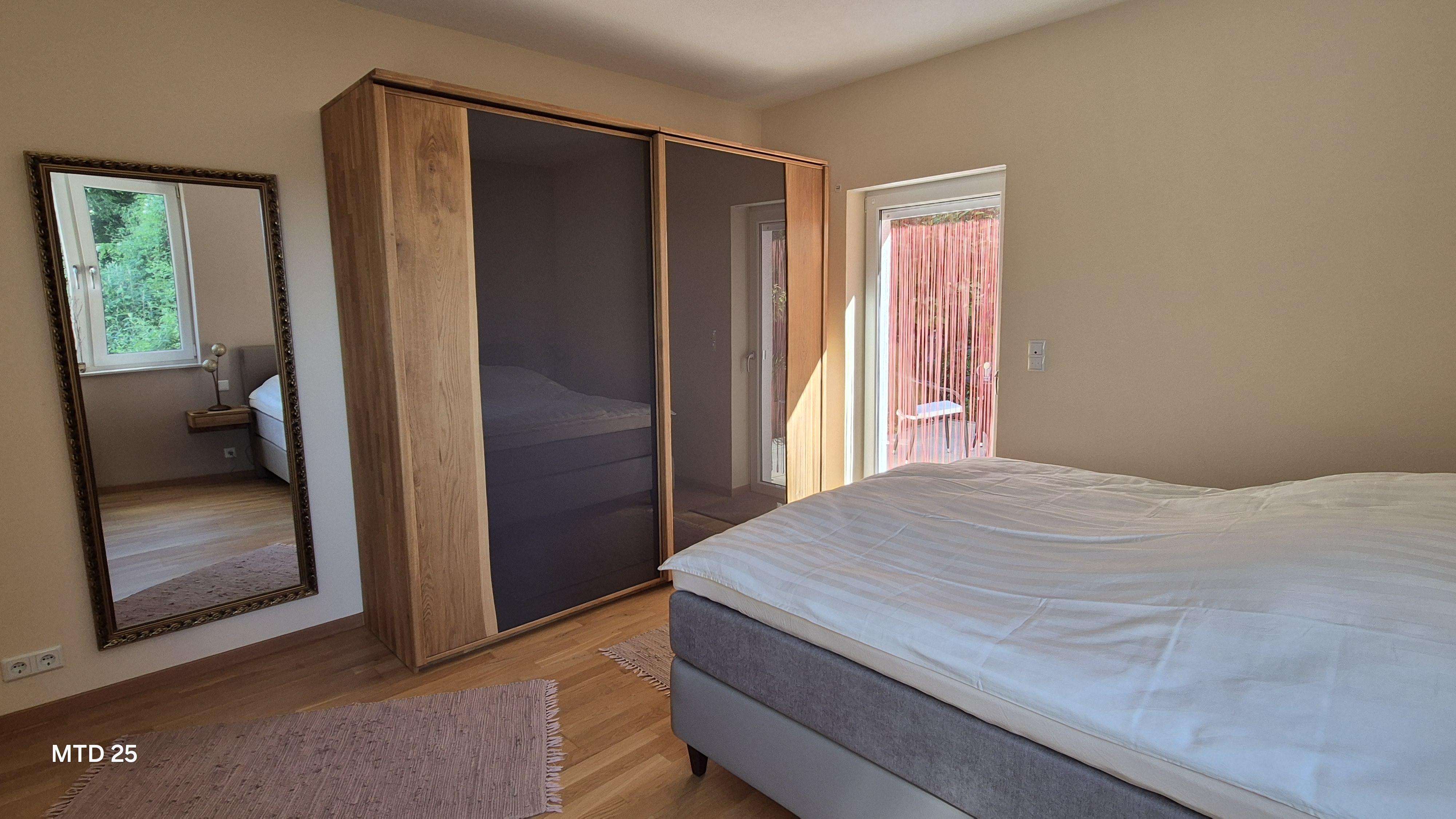 Zur Einrichtung gehören eine schicke Einbauküche, Massivholzmöbel, ein Boxspringdoppelbett und eine komfortable Ledereckcouch. Für eine dritte mitreisende Person steht ein separates Schlafzimmer mit einem bequemen Einzelbett zur Verfügung. Im Apartment sind Echtholzparkett sowie Fliesenböden verlegt. Die Räume sind über eine Fußbodenheizung beheizbar und sehr gut isoliert. Alle Fenster und Außentüren haben Rollläden. Stabiles und kostenfreies WLAN ist in der gesamten Wohnung einschließlich Terrasse und Balkon vorhanden.