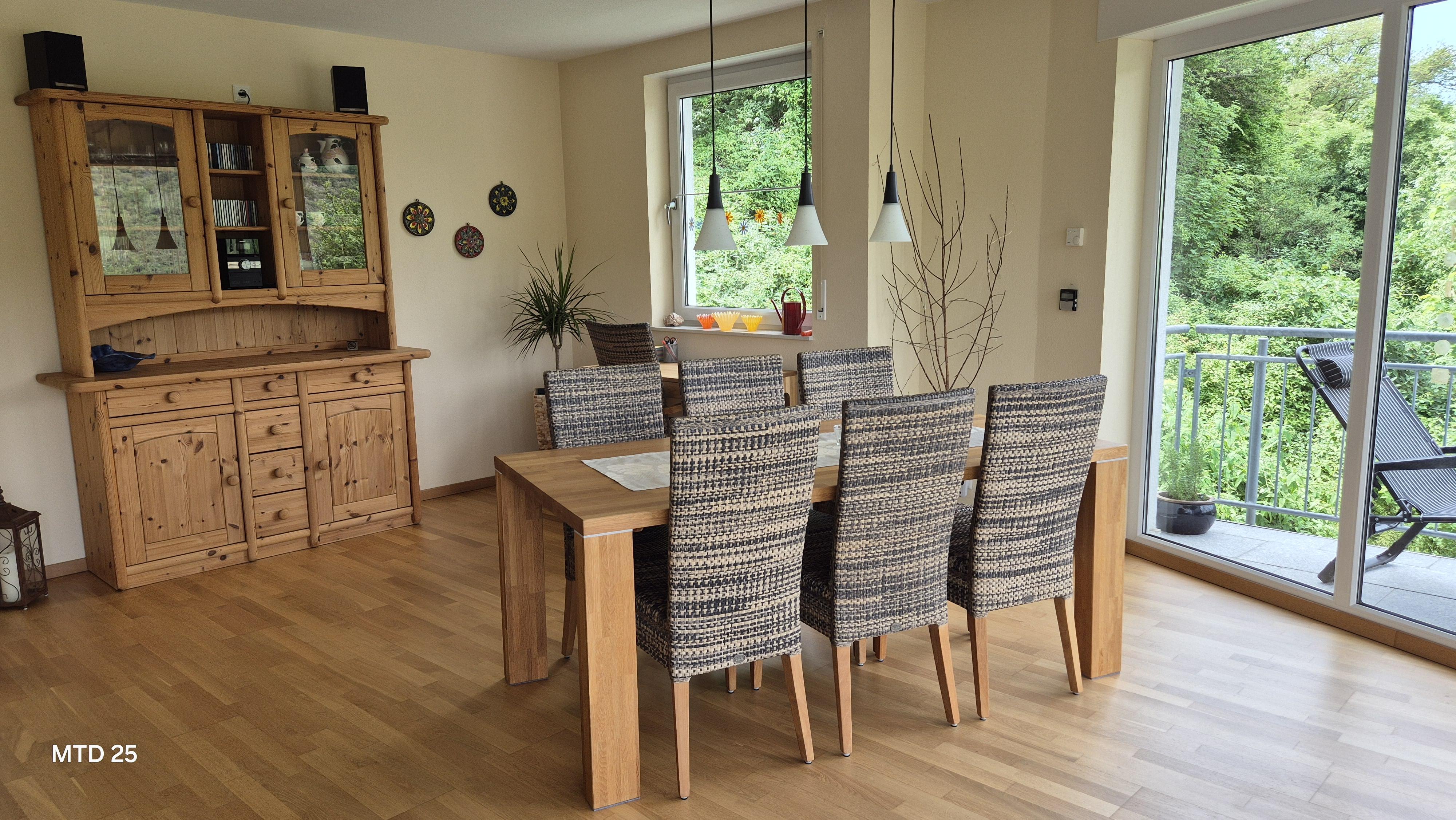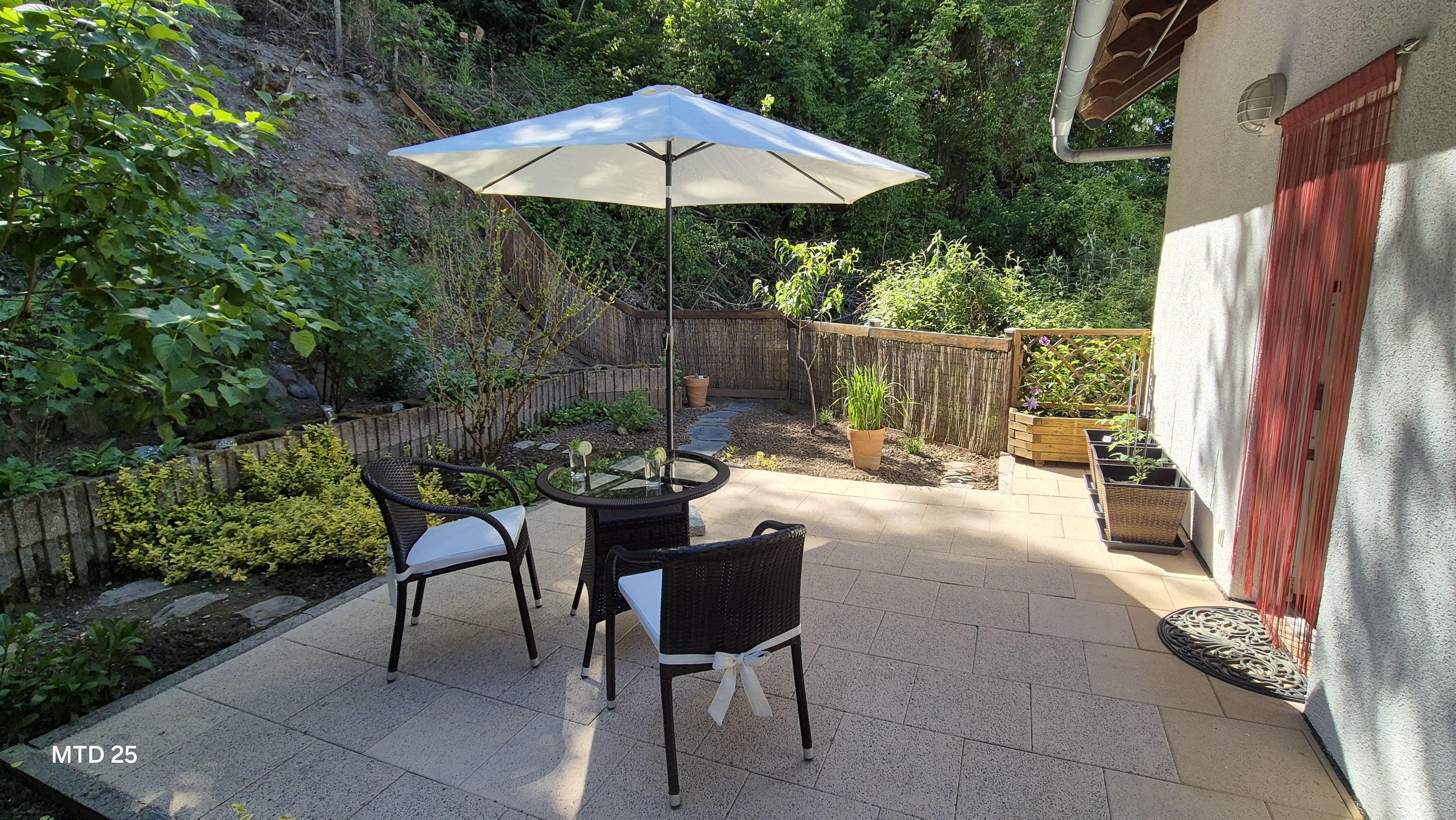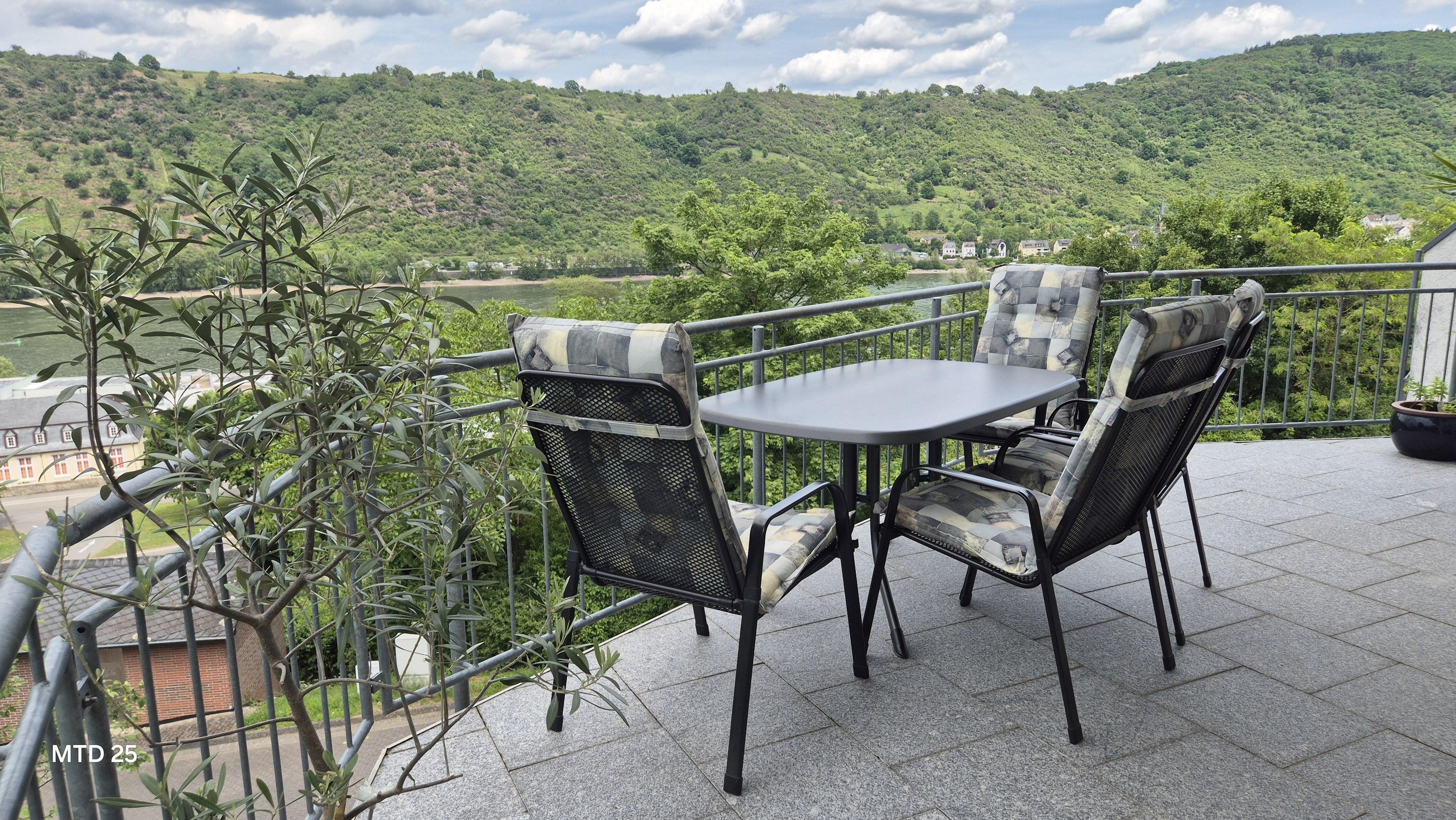 Rheinseits ist dem offenen Wohn-/ Essbereich ein umlaufender Balkon vorgelagert, von dem Sie dem Treiben auf dem Fluss zuschauen und das morgendliche Sonnenlicht genießen können. Auf der Rückseite des Apartments befindet sich eine Terrasse direkt am Waldrand mit einem kleinen, liebevoll gestalteten Garten. Hier finden Sie entspannende Ruhe und können der Natur lauschen. Vielleicht werden Sie auch das ein oder andere Wildtier bei seinen Streifzügen beobachten. Auf Balkon und Terrasse stehen bequeme, gepolsterte Gartenmöbel zur Verfügung.