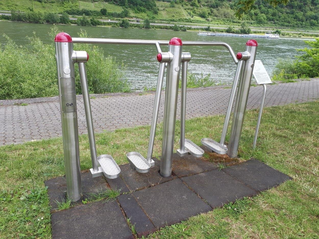 Fitnessparcour mit vier Fitnessgeräten am Rheinufer.