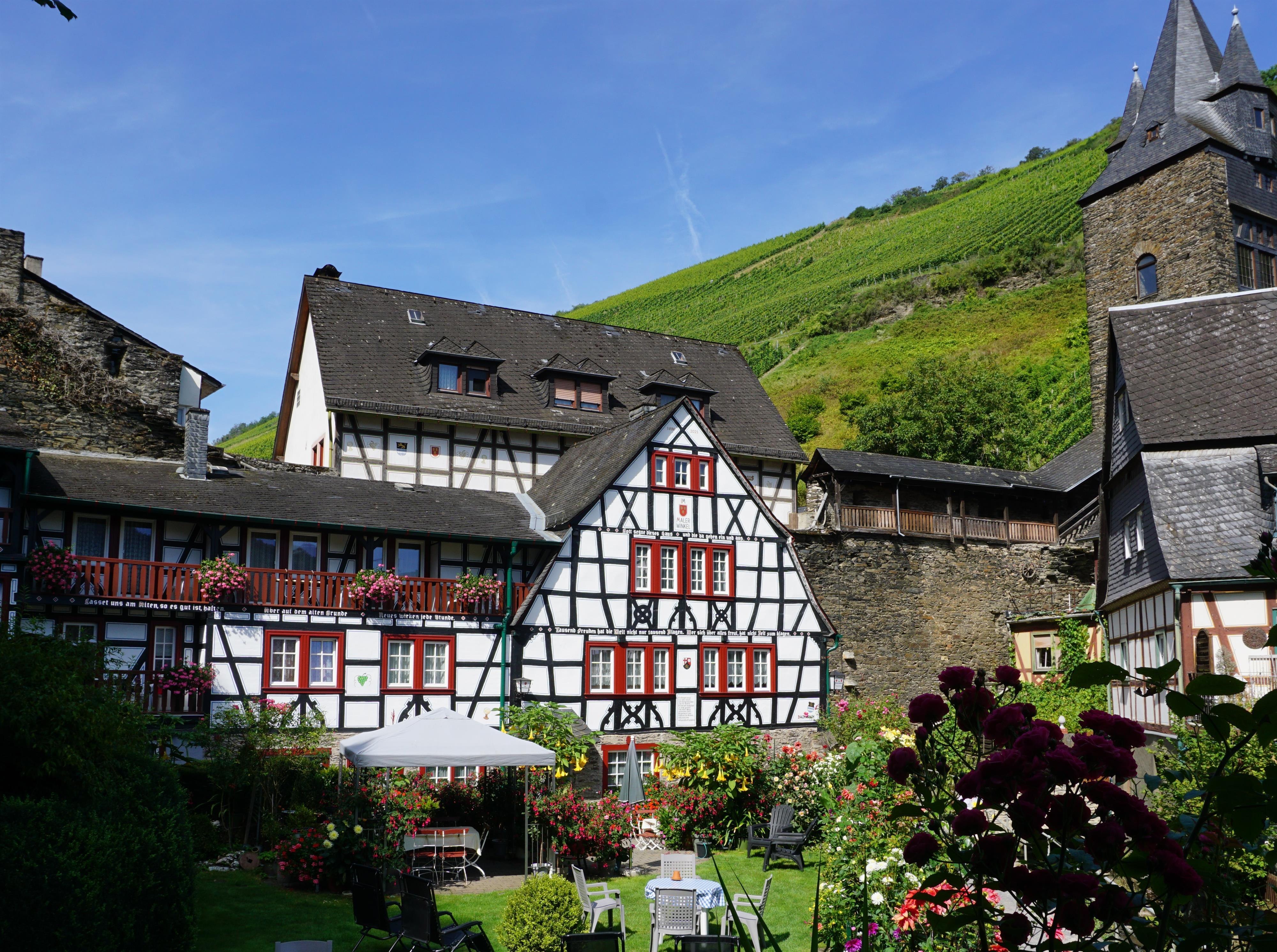 Unser familiengeführtes Haus finden Sie in ruhiger Lage in einem idyllisch, malerisch gelegenen Winkel, direkt am RheinBurgenWeg der Rhein-/Weinstadt Bacharach. Genießen Sie Ihren Urlaub zwischen Wehrtürmen und der historischen Stadtmauer unterhalb der Burg Stahleck, mit traumhaftem Blick auf die Weinberge und Gärten. Unsere Zimmer, Appartements und Ferienwohnung sind modern eingerichtet. Zum Entspannen lädt eine große Gartenterrasse mit Liegewiese ein. Großer hauseigener Parkplatz. Zentral gelegen in 2 Gehminuten sind Sie am Marktplatz, in 5 Gehminuten in den Rheinanlagen mit Schiffsanlegestellen. Empfehlenswerte Weinstuben und Speisegaststätten liegen in der Nähe.