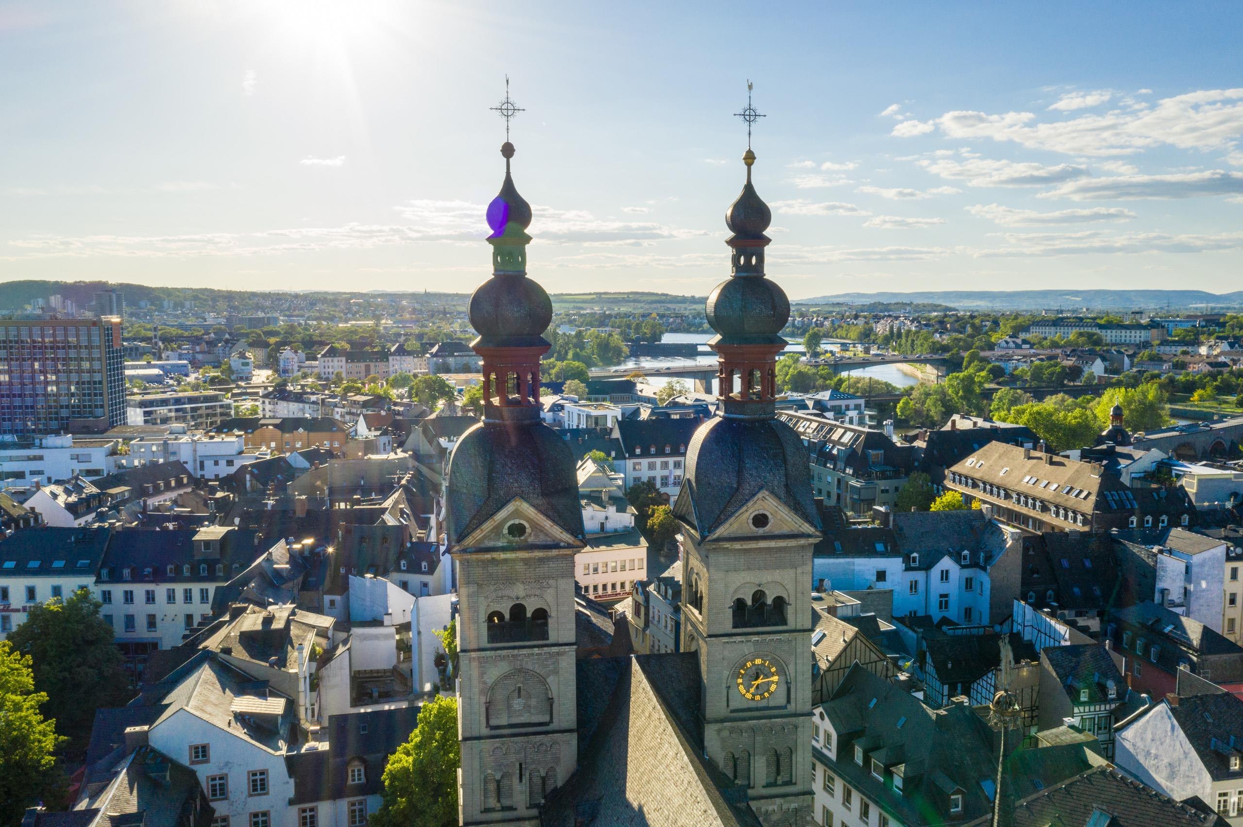 Die Liebfrauenkirche ist immer schon (neben St. Kastor) die Stadtpfarrkirche von Koblenz gewesen. Ihre Anfänge reichen ins 5. Jahrhundert zurück, als die Franken in dem römischen Gemäuer ein Gotteshaus errichteten. Unter Verwendung der Fundamente wurde sie mehrmals um- und ausgebaut.Die im 17. Jahrhundert erbauten, 1944 zerstörten und 1955 wiederhergestellten Zwiebeltürme prägen die Silhouette der Koblenzer Altstadt. Die Doppelturmfassade im Westen korrespondiert in ihrer repräsentativen Wirkung mit den Westfassaden der ehemaligen Koblenzer Stiftskirchen St. Kastor und St. Florin. Die Liebfrauenkirche hat 4 Glocken in ihrem Glockenturm. In Erinnerung an die Schließung der Stadttore und den damit verbundenen Zapfenstreich wurde das Läuten der Barbaraglocke, der so genannten "Lumpenglocke", über die Jahre beibehalten. Jeden Abend um 22 Uhr läutet auch heute noch die "Lumpenglocke". Danach schweigen Geläut und Stundenschlag bis zum frühen Morgen. Der alte Pfarrhof der Liebfrauenkirche befindet sich unmittelbar südlich der Florinskirche.