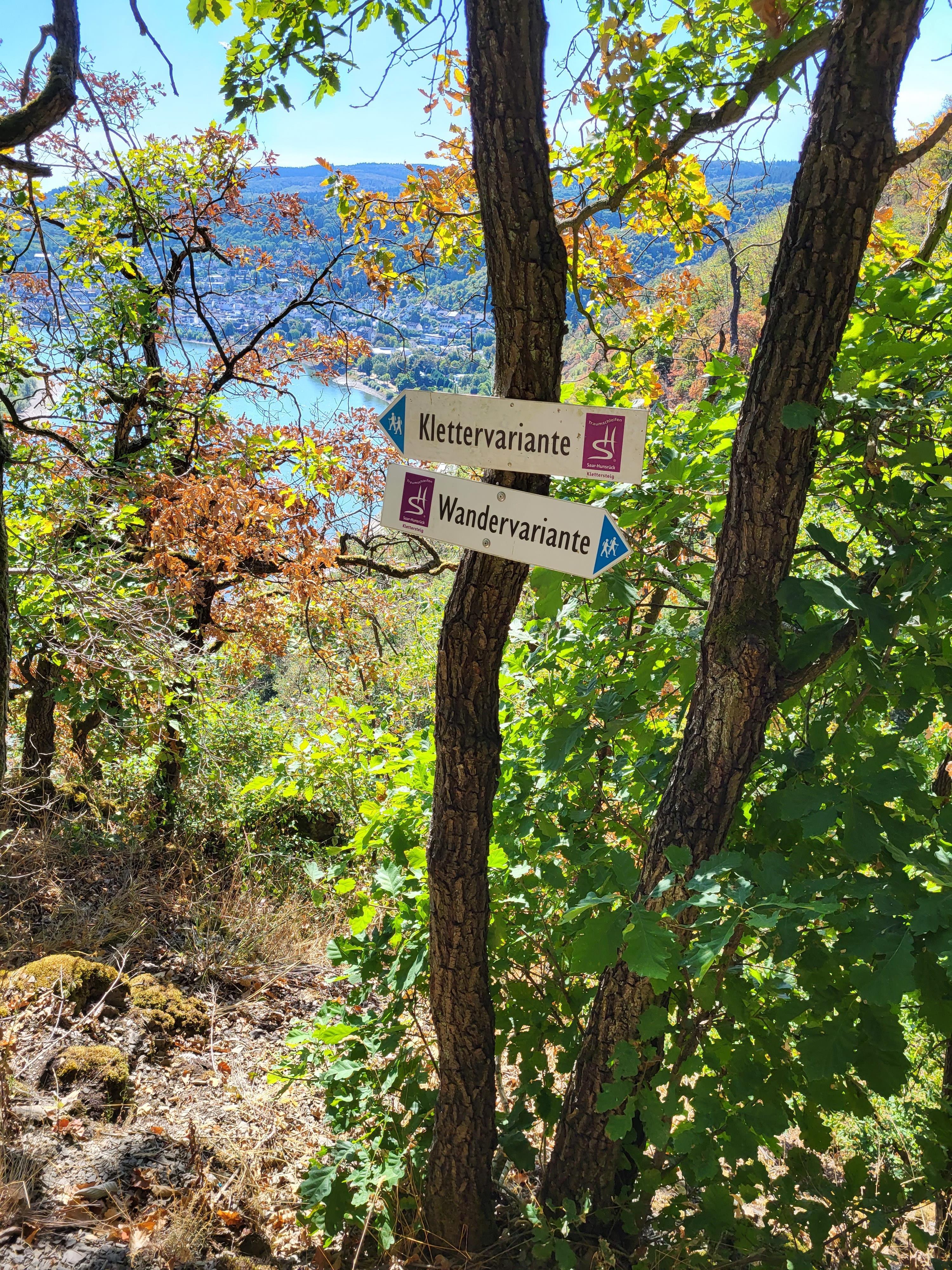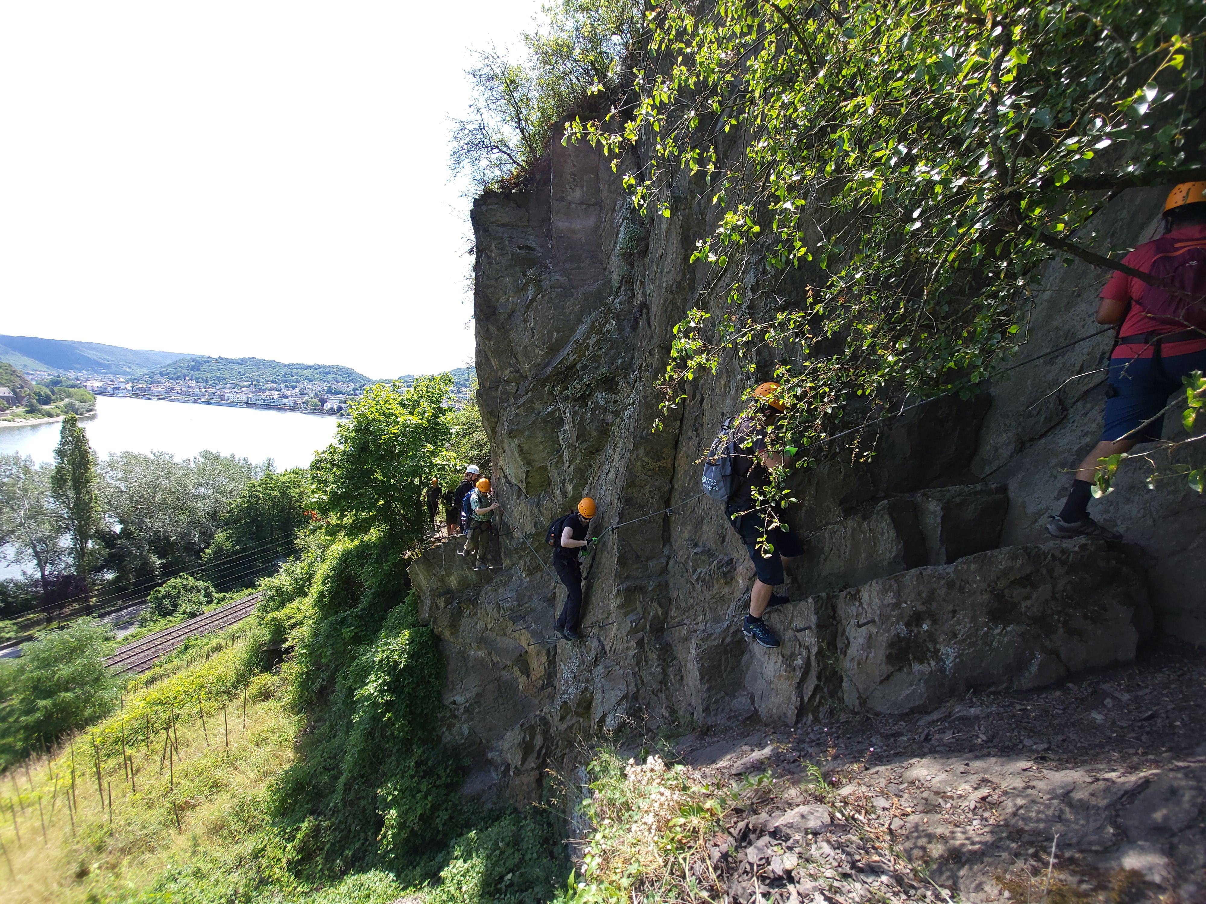 Der Blick wandert über die Weinterrassen des Bopparder Hamms, fährt die große Schleife des Rheins mit dem Auge nach und schaut mit Respekt und einem gewissen Kribbeln in den Gliedern hinunter ins Tal. Der Mittelrhein-Klettersteig führt seit 2006 in luftige Höhen und bietet ganz außergewöhnliches Rheinerlebnis mit dem gewissen Schuss Adrenalin. Er ist die sportliche Variante des linksrheinischen Rhein-Burgenwanderweges und fordert neben Kondition, Trittsicherheit und gutem Schuhwerk auch schwindelfreie Wanderer. Wer die Voraussetzungen erfüllt, den belohnt der Klettersteig mit einem unvergesslichen Erlebnis. Die Montage von 10 Leitern, 130 Trittbügeln und ca. 180 Meter Drahtseil war notwendig, um dem Wanderer dieses besondere Klettererlebnis im Rheintal zu ermöglichen. Steile Felswände wechseln sich mit gesicherten Stellen ab und münden nicht selten in schmalen Pfaden, vor denen sich Abgründe öffnen. Anspruchsvolles Rheinerlebnis aus der Vogelperspektive vor den Toren der Stadt.