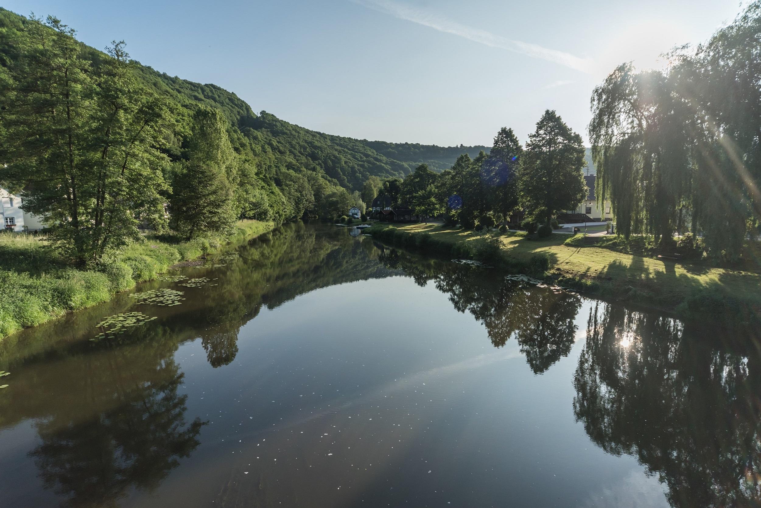 In östlicher Richtung bildet die windungsreiche Wied mit ihren Prall- und Gleithängen ein abwechslungsreiches, reizvolles Erholungsgebiet. Neben dem Rhein und der Wied sind die Täler verschiedener Bachläufe landschaftsprägend und bergen, wie z.B. das als Kernzone des Naturparks ausgewiesene Fockenbachtal, manche botanische Rarität.“