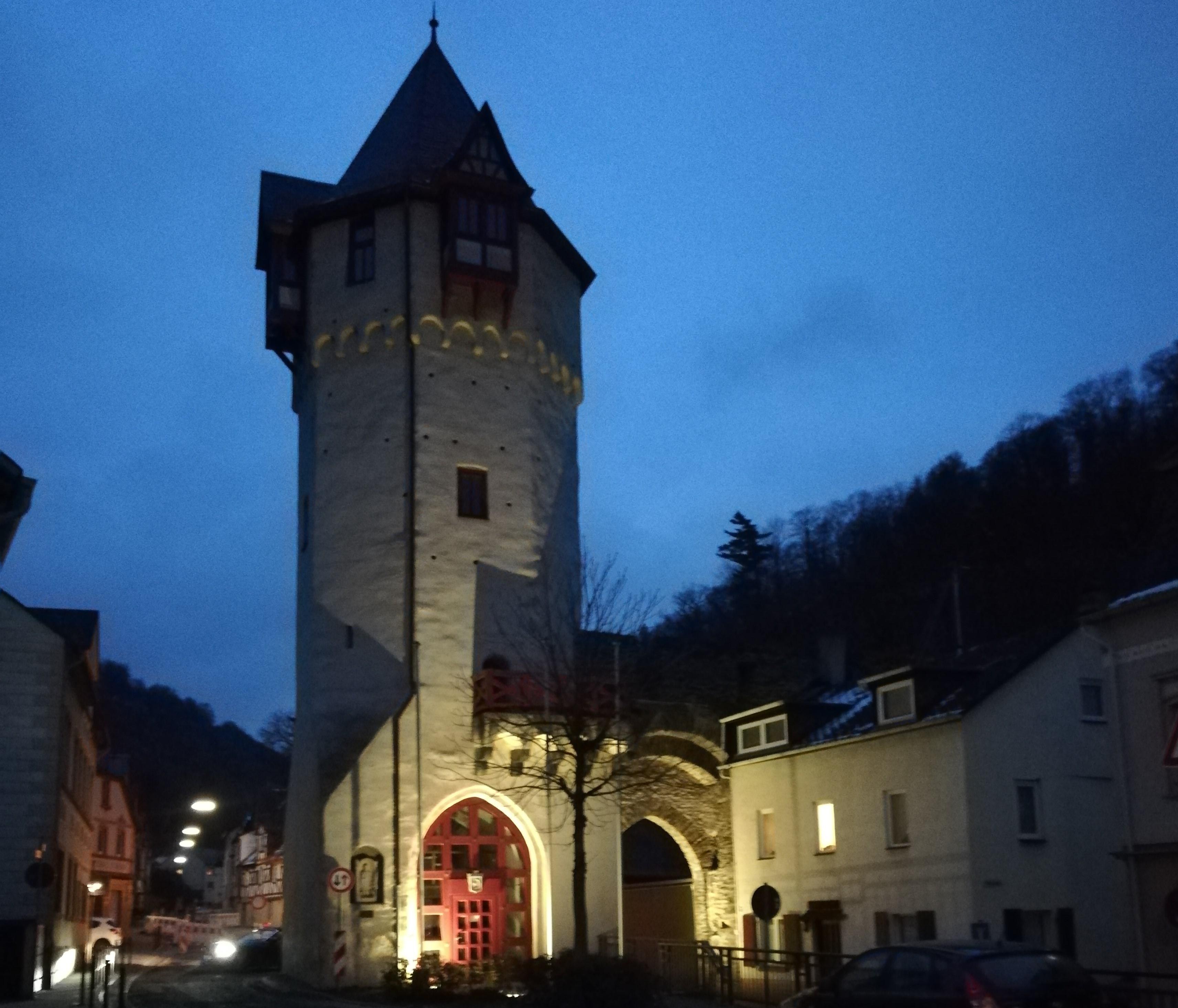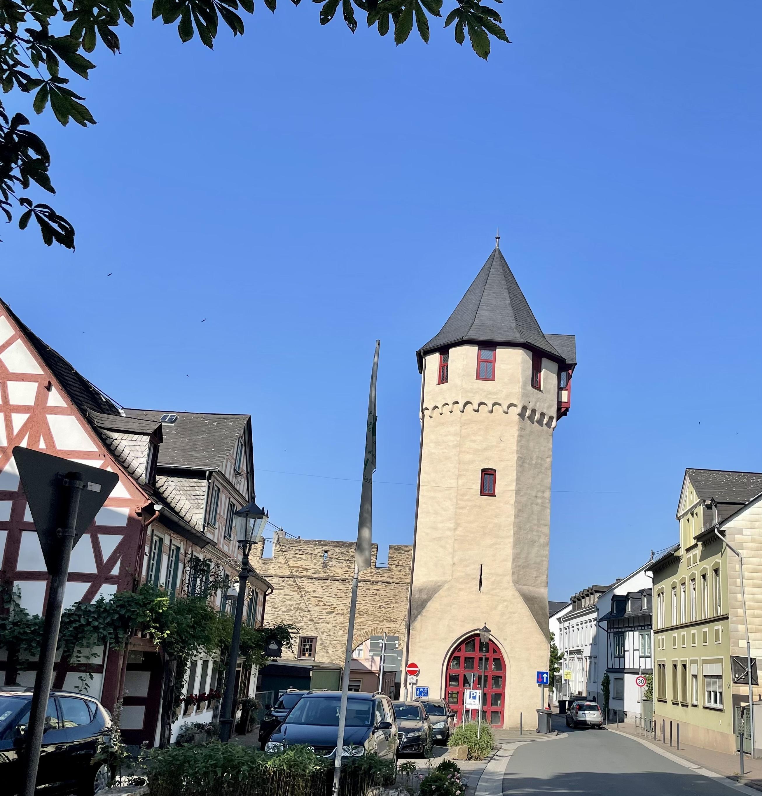 Von diesem Torturm in der Unteralleestraße 28 führte die Stadtmauer, die um 1200 den ältesten Teil der Stadt umschloss, hinauf zum Schlossberg. Das Obere Tor war das östlichste Tor der Stadtmauer und ein wichtiger Kontrollpunkt für den Handelsweg nach Wiesbaden. Teile der Stadtmauer sind zwischen Oberalleestraße und Unteralleestraße zu sehen. Der Obertorturm ist einer von zwei ehemaligen Türmen in diesem Bereich. Veränderungen erfuhr der Turm um 1900, als beim Bau der Nassauischen Kleinbahn ein Durchgang in den Turm gebrochen wurde. Nachdem die Blei- und Silberhütte den Transport auf Lastwagen umstellte, wurde die Kleinbahn in die Schweiz verkauft und das Obertor wieder aufgebaut. Heute fließt der Verkehr um dieses Tor herum. In der Spitze des Turms befindet sich ein Versammlungsraum, der gemietet werden kann. http://www.landesdenkmalpflege.de/fileadmin/bilder/landesdenkmalpflege/tdod_2017/2017_Tag-des-offenen-Denkmals.pdf; https://www.romantischer-rhein.de/a-obertor