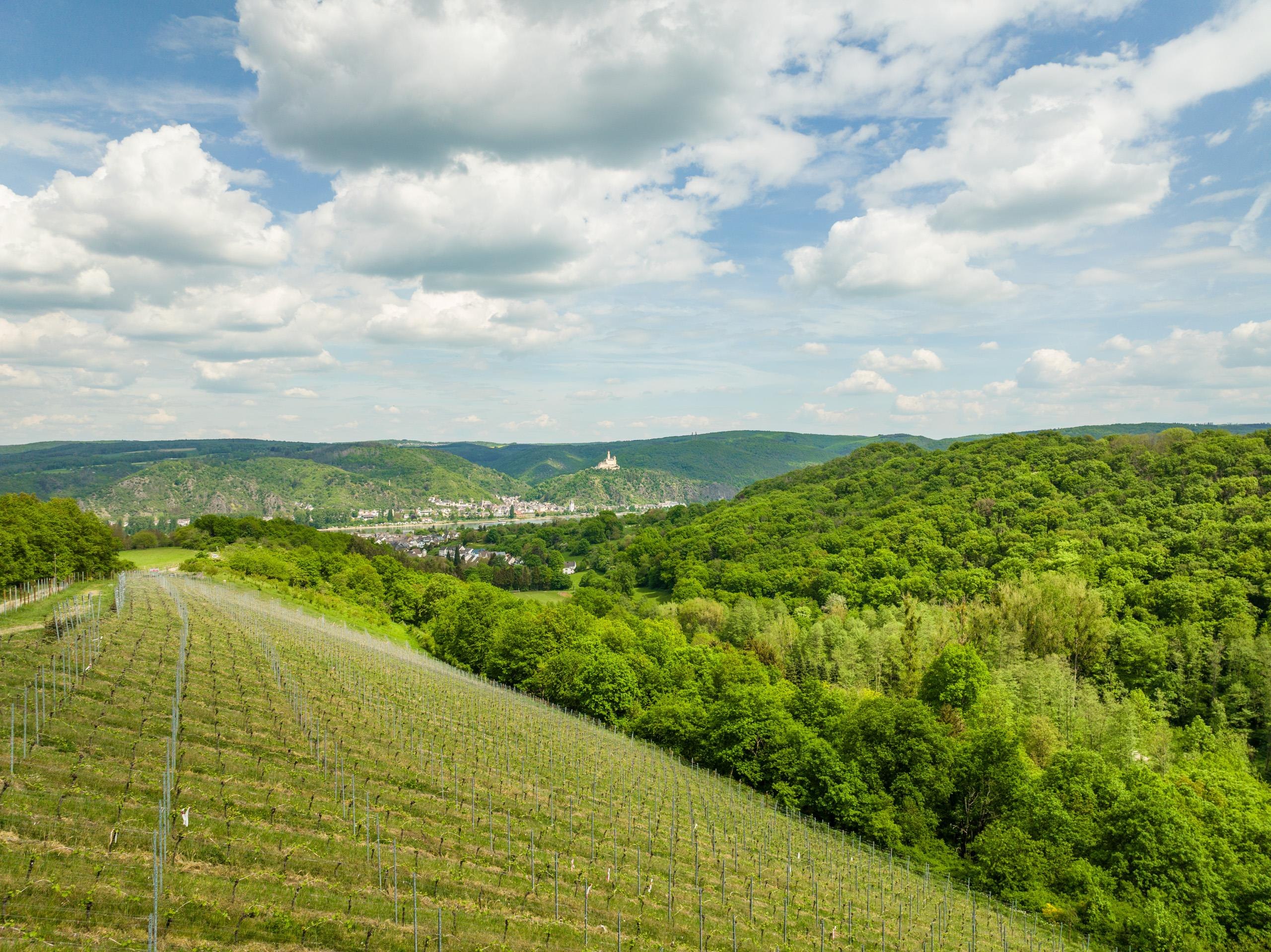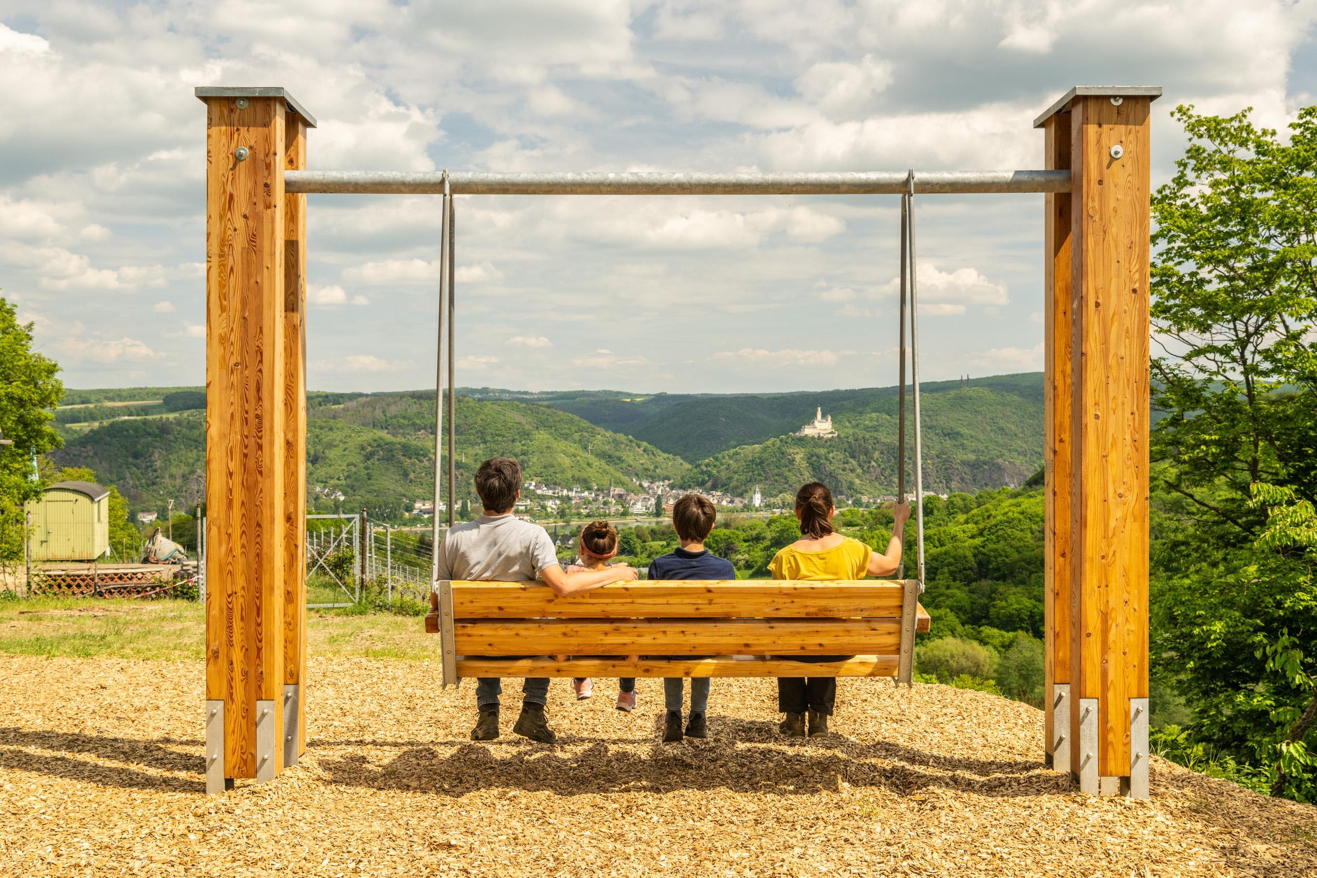 Die Weinbergschaukel mit Rückenlehne bietet eine entspannende Rastmöglichkeit mit fantastischem Blick auf den Rhein, den Weinberge und auf die Marksburg. In der Nähe der Schaukel befindet sich ebenso eine Holz-Relaxliege mit Platz für zwei Personen.