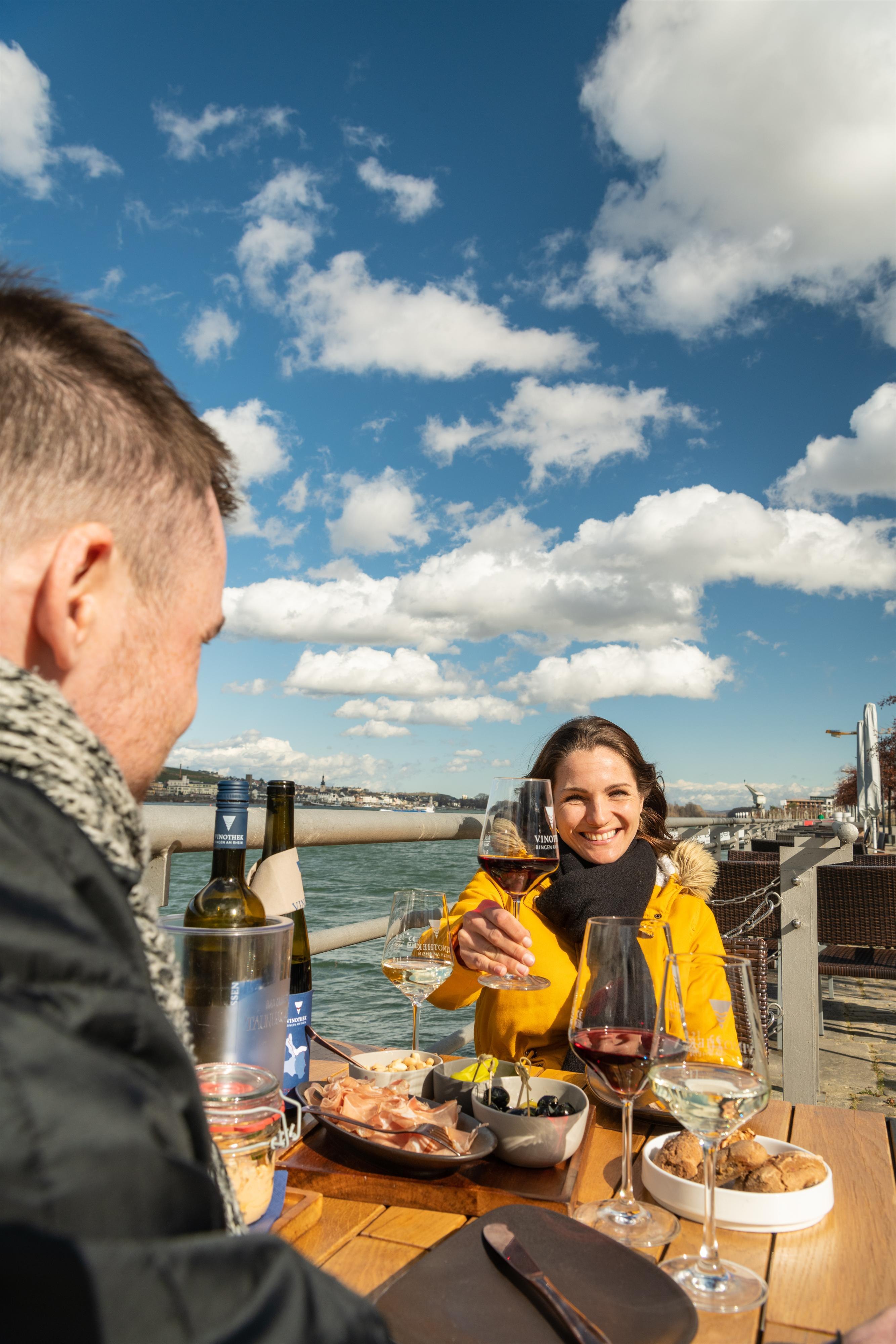Wer Binger Weine in ihrer Vielfalt probieren möchte, ist in der Binger Vinothek bestens aufgehoben. Zusätzlich präsentieren immer wieder interessante Gastwinzer ihre Weine. Darüber hinaus locken rund um das Weinjahr kulinarische Köstlichkeiten und Veranstaltungen. Im Sommer sind die begehrtesten Plätze die auf der Terrasse und direkt am Rheinufer, mit Blick auf den Mäuseturm, die Ruine Ehrenfels und das Niederwalddenkmal.