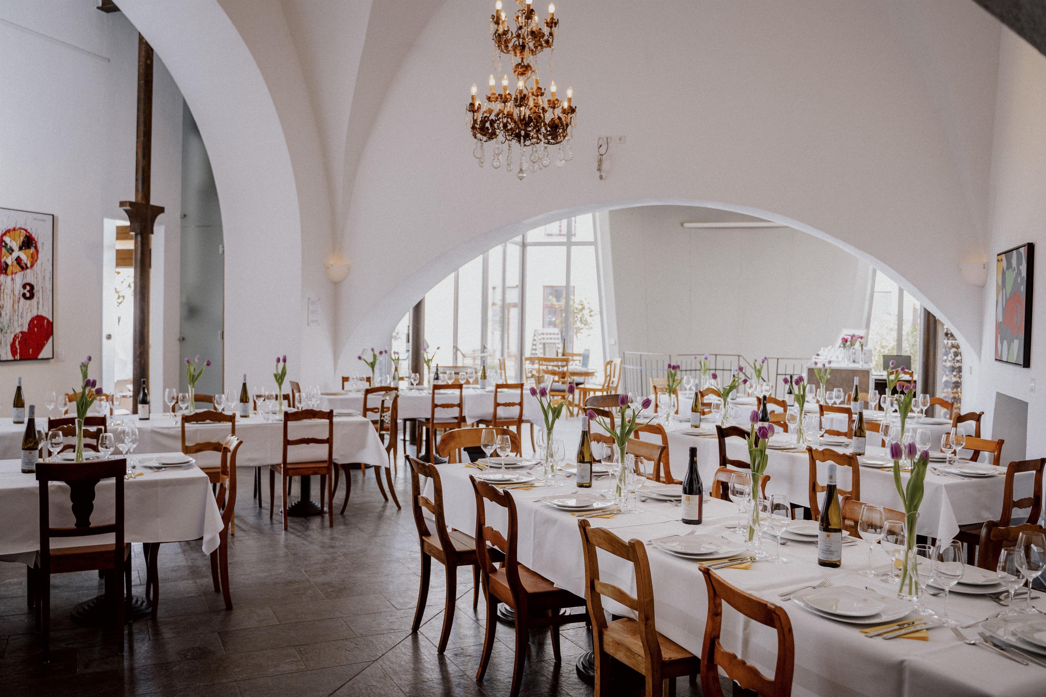 Unser Kunstkeller und der Veranstaltungsraum im "historischen Riesenfasskeller" mit seinem sechs Meter hohen Gewölbe bietet sich für Tagungen und Veranstaltungen jeglicher Art an. Gerne planen und organisieren wir Firmenveranstaltungen oder private Feiern und freuen uns, Euch beraten zu dürfen - vom Catering bis zur passenden Auswahl der Weine.