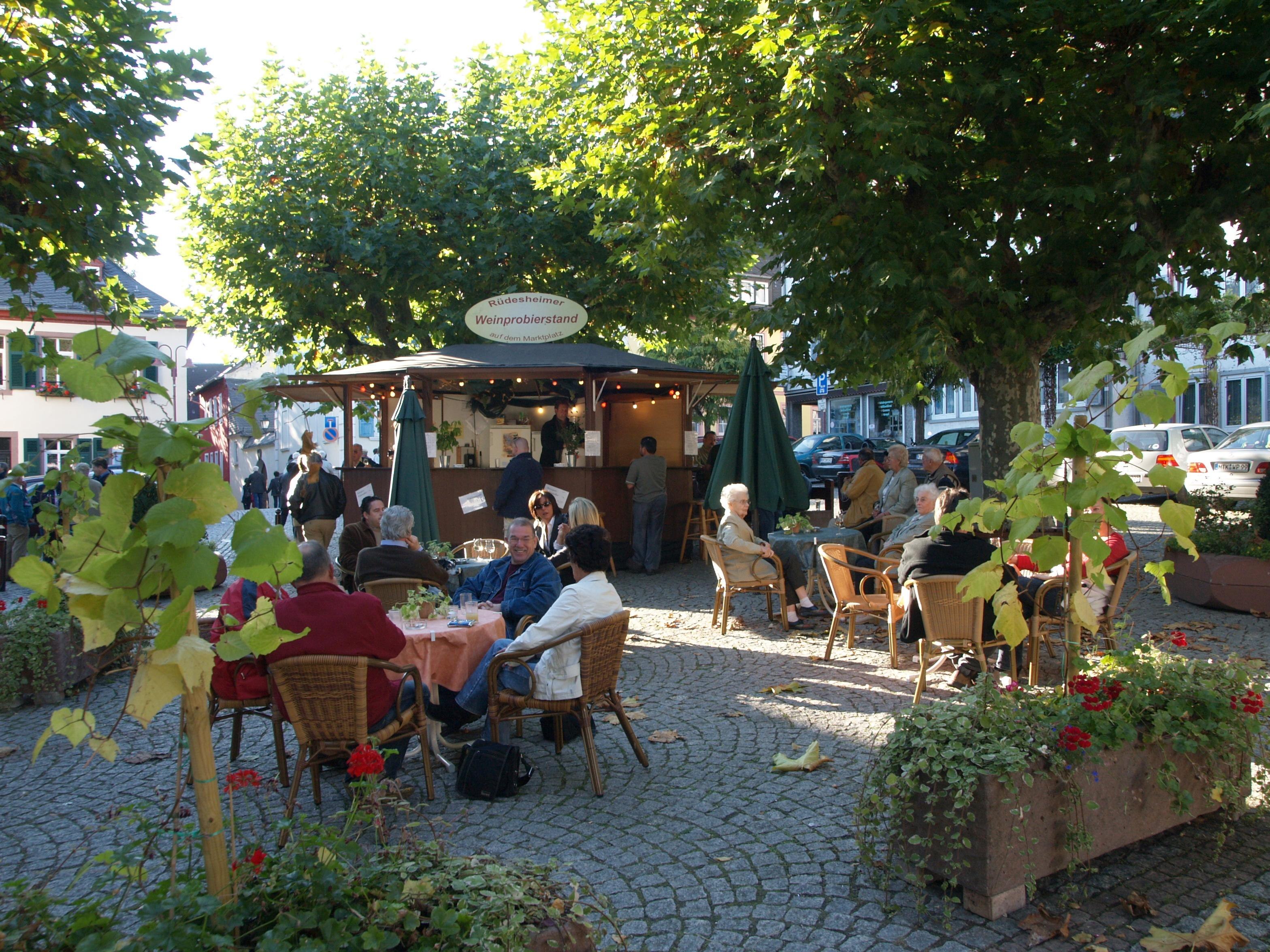 Jedes Jahr von Ende März bis Mitte Oktober begrüßen wir Euch täglich auf dem idyllischen Marktplatz in Rüdesheim an unserem gemütlichen Weinstand.