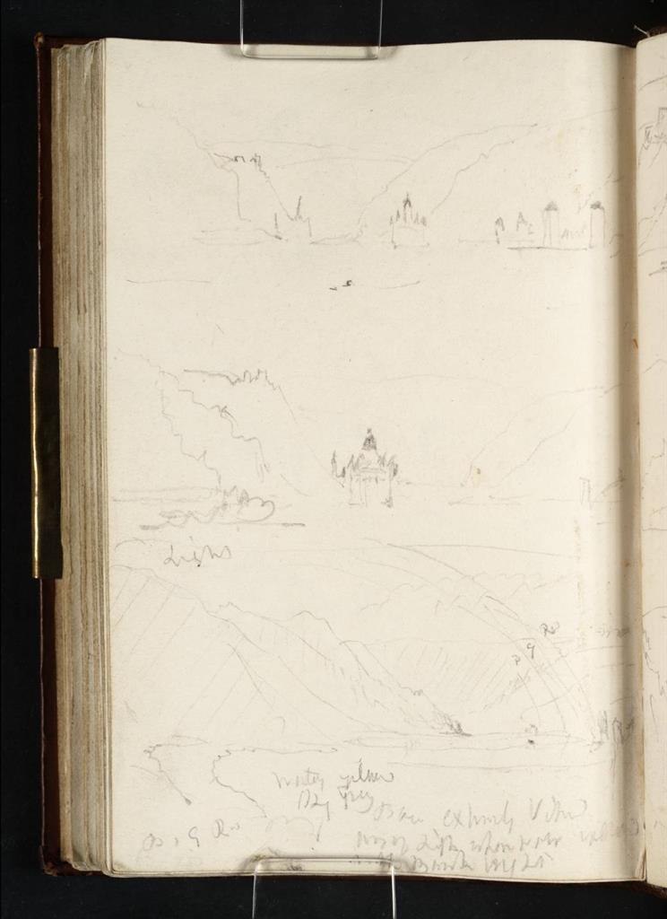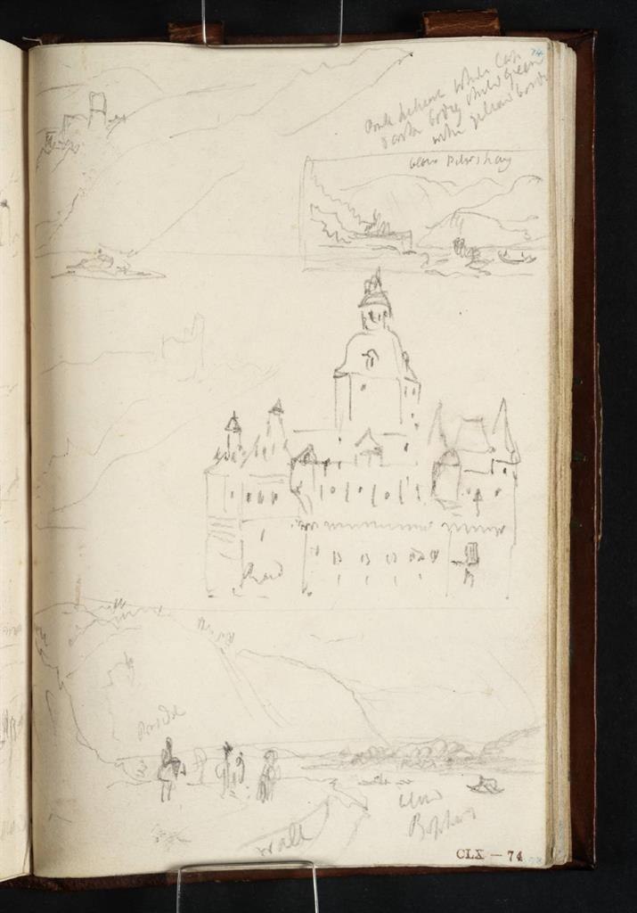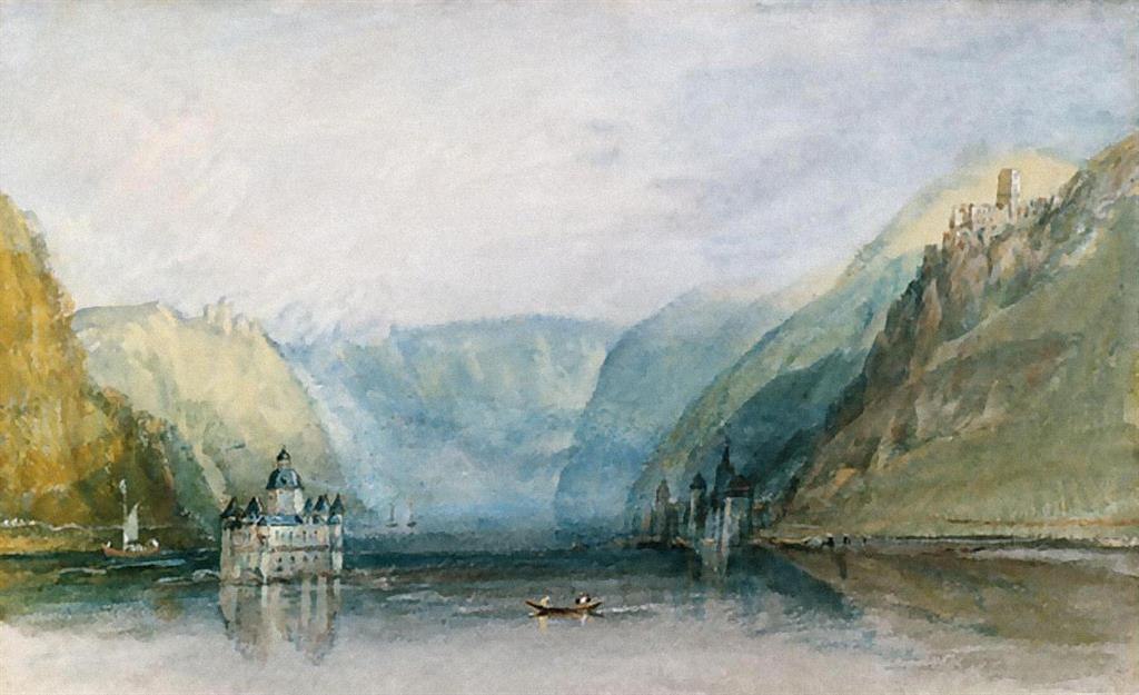 Diese Ansicht der »Pfalz bei Kaub« bot sich Turner erst auf seiner Rückreise von Mainz nach Köln am 27. August 1817. Vom Schiff aus skizziert er die ehemalige Zollburg auf der kleinen Flussinsel mit Burg Gutenfels auf der rechten Anhöhe. Die vielen Zeichnungen, die Turner auch schon während seines Fußmarschs angefertigt hatte, zeigen seine Faszination für dieses außergewöhnliche Bauwerk. In diesem Motiv kombiniert er mehrere Bleistiftskizzen zu einer heiteren Gesamtkomposition. Es ist eine der wenigen Burganlagen des Mittelrheintals, die nicht von der napoleonischen Armee zerstört wurde. Die Pfalzgrafenstein ist heute im Besitz des Landes Rheinland-Pfalz und kann besichtigt werden.