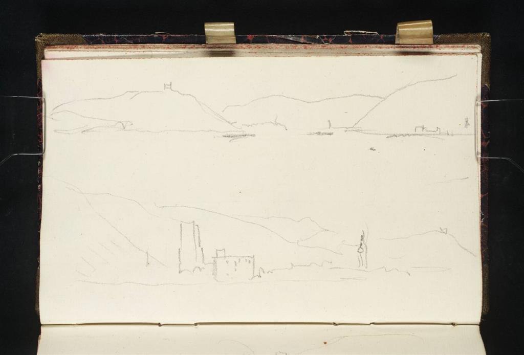Vom Reinufer aus blickt Turner am späten Nachmittag des 25. August 1817 zurück ins »Binger Loch«. Das Aquarell zeigt im Vordergrund ein Schiff, wie sie typisch für die damalige Zeit waren. Rechtsrheinisch ist die Stadt Rüdesheim auszumachen, dessen Gebäude sich im Fluss spiegeln. Linksrheinisch ist Bingen, bewacht von Burg Klopp, noch zu erahnen. . Burg Ehrenfels ist nur angedeutet. In weiter Ferne erahnt man den Mäuseturm, der ursprünglich als Zollwachturm auf einer kleinen Rheininsel erbaut wurde. Turners Gemälde deutet durch die tiefschwarzen, bedrohlichen Wolken über der Flussenge am Binger Loch das gefährliche Fahrwasser an. Im Vordergrund jedoch liegen auf ruhigem Gewässer Boote mit bewegungslosen Segeln und Fahnen. Von Bingen aus setzt Turner seine weitere Reise mit dem Schiff in Richtung Mainz fort. Der Mäuseturm ist nur zu ausgewählten Terminen zu besichtigen.