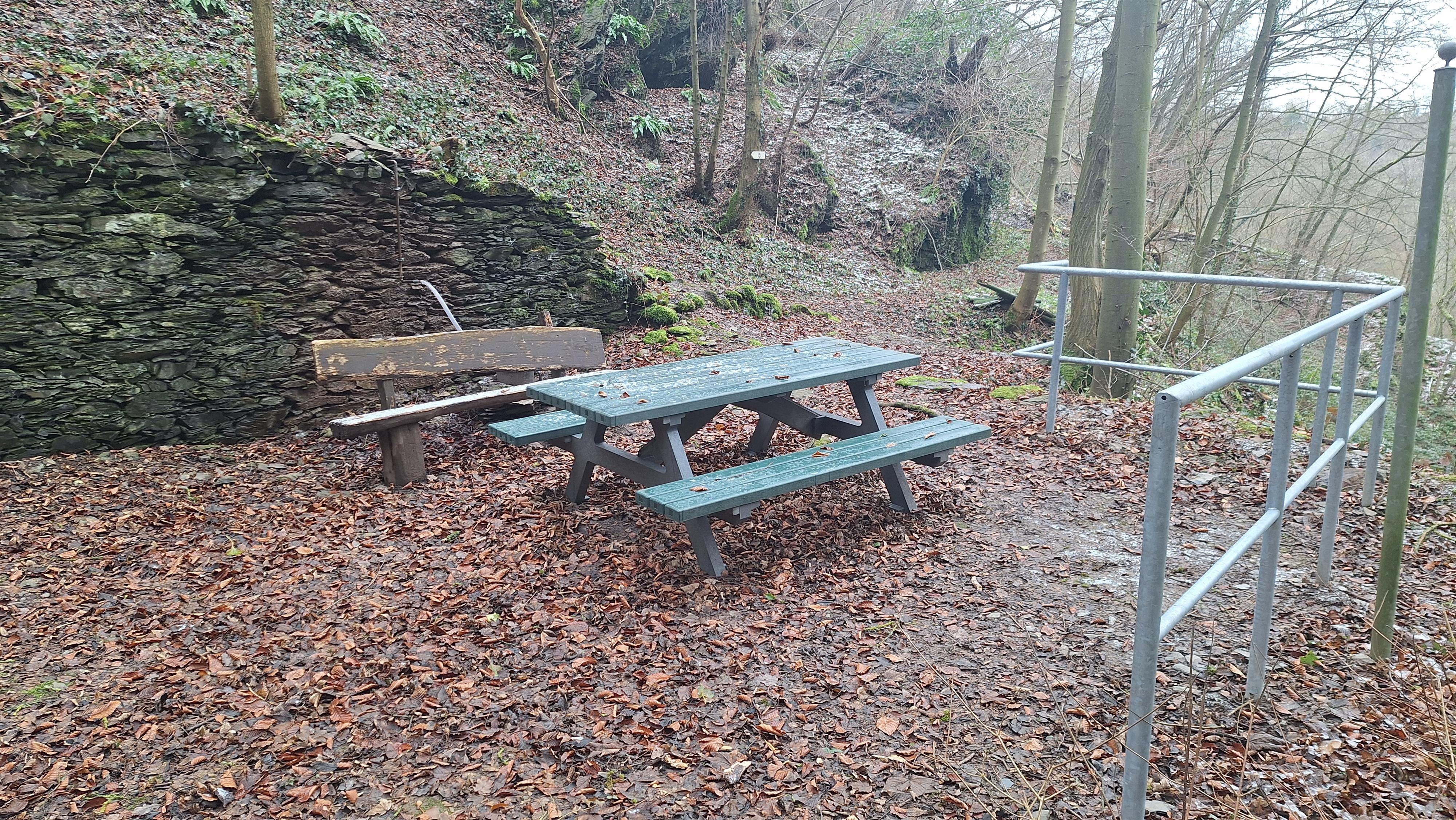 Old mill ruin along the hiking trail "Werlauer-Pilz" in the Heimbachtal with picnic bench.