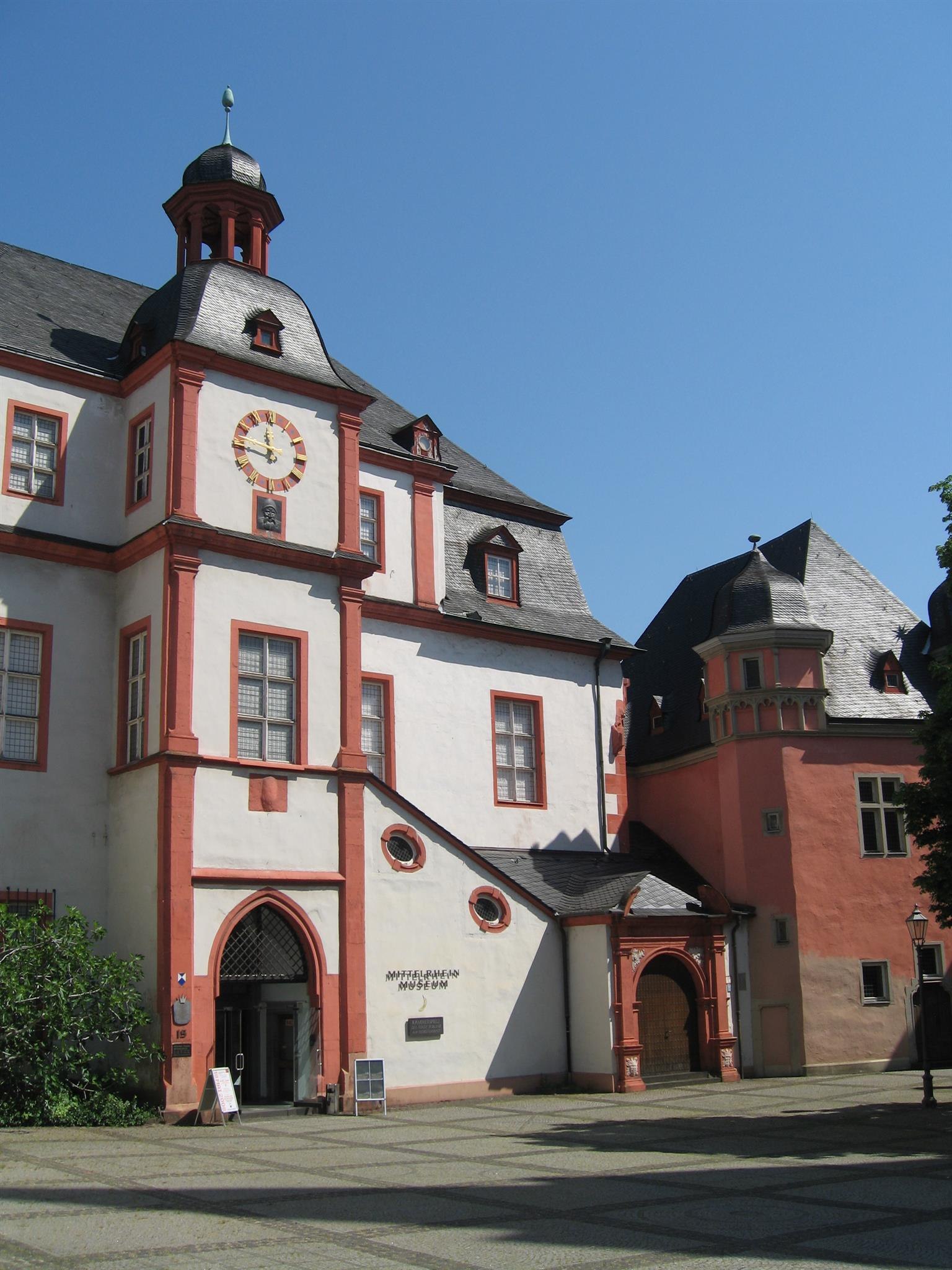 The old "Kauf- und Danzhaus" was built in 1419 in Gothic style and rebuilt in the 17th/18th centuries. In the process it received baroque elements. The building burnt down in 1944 and was rebuilt in 1961/62. The old Kauf- und Danzhaus housed the Middle Rhine Museum until 2012 (since 2013 in the Forum Confluentes). Under the tower clock, which was installed in 1724, you can see the "eye roller", who moves his eyes back and forth in time with the clock's pendulum and sticks out his tongue every full and half hour. It commemorates the robber baron Johann Lutter von Kobern, who was executed on 14 October 1536 at the Florinsmarkt. According to legend, he rolled his eyes on the scaffold and stuck out his tongue at the spectators. Other sources show that the grimacing head was already to be seen on the town's seal in 1290, as a threatening gesture against the siege of the town by the Bishop of Vinstingen. The Gothic Schöffenhaus (Aldermen's House) was built right next to the old department stores' in 1530. This is where the aldermen of the town court met, whose task was to supervise the coins and weights. Until the 18th century, the town pillory stood in front of the aldermen's house. In 1965 the house, which was destroyed in the war, was reconstructed. To the left of the Old Department Store is the Bürresheimer Hof, built in 1659, which owes its name to its then (1714) owners, the von Breitbach-Bürresheim family. In September 2013, the GÖRLITZ Foundation acquired all the municipal buildings around the square. The ensemble at Florinsmarkt is to become a cultural and guest house across all buildings.