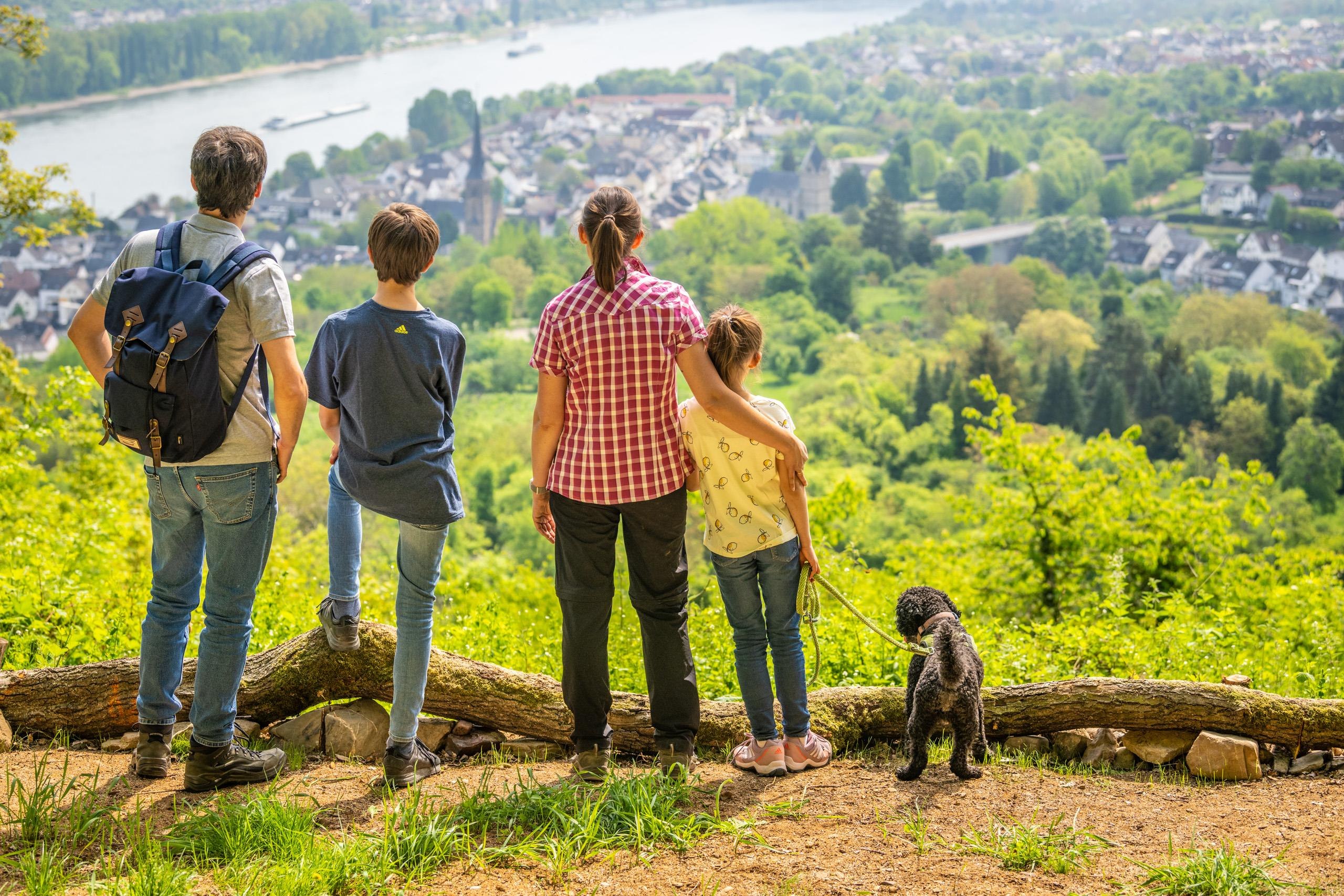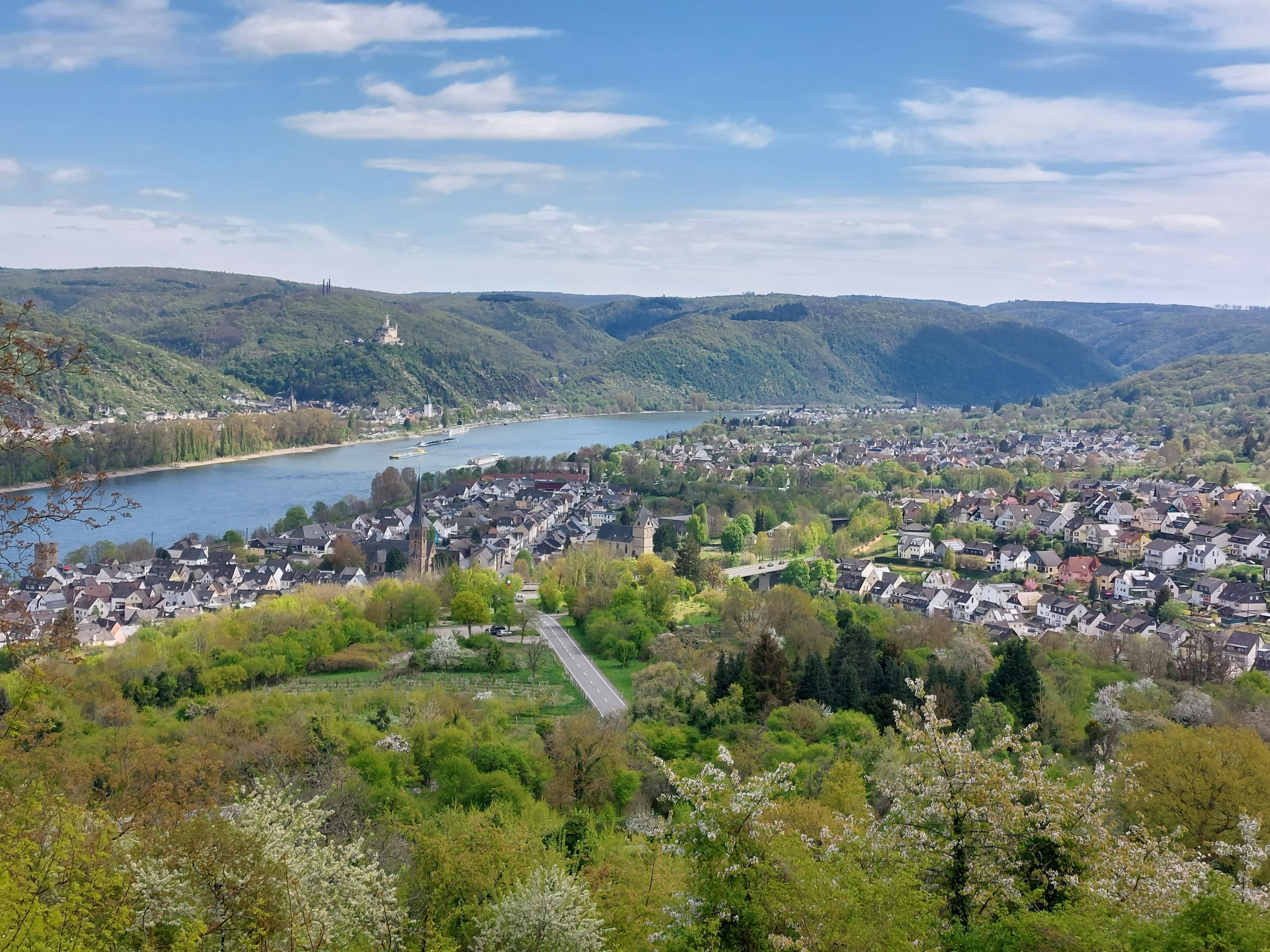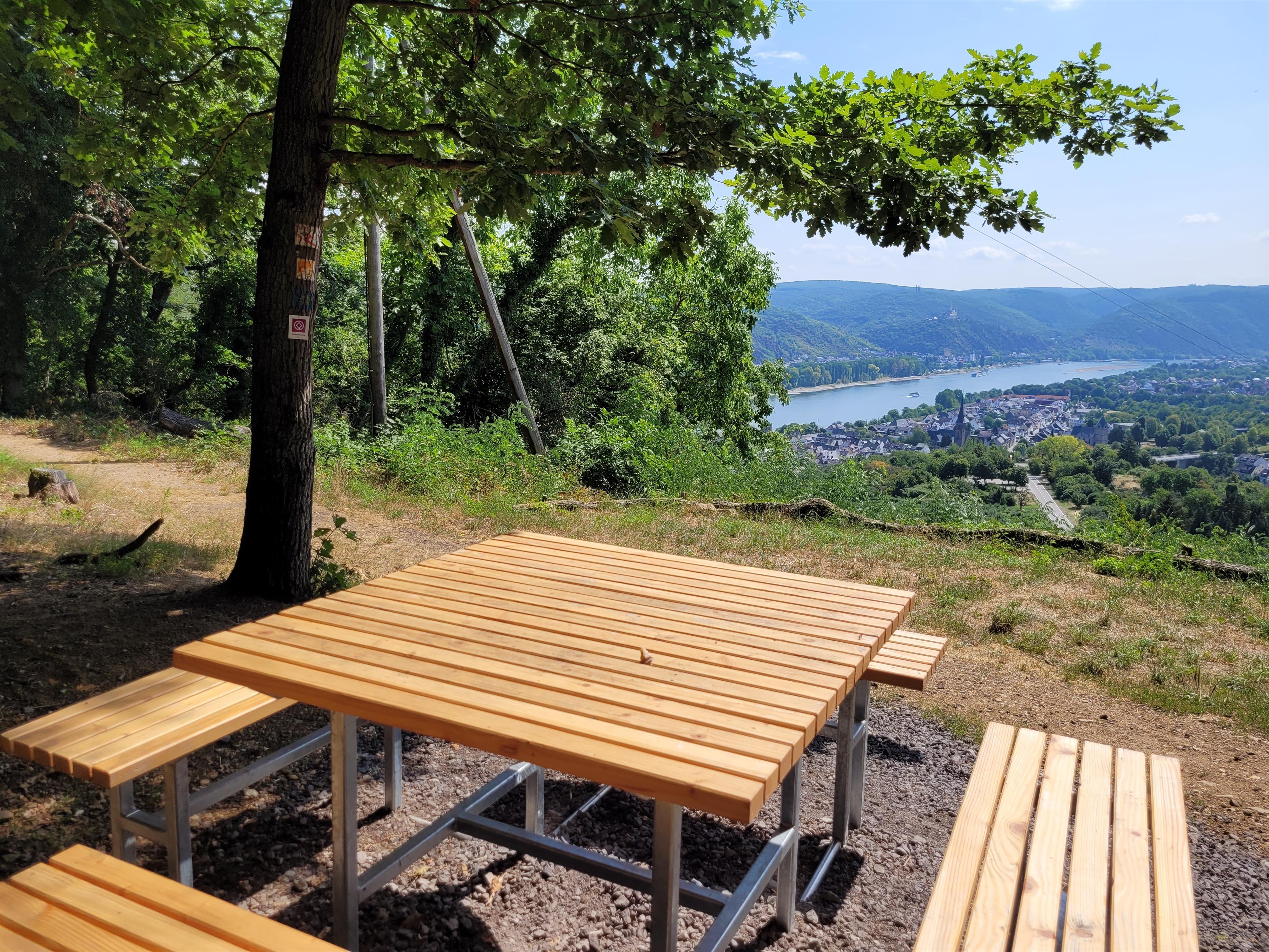 The viewpoint "Panoramablick Lützelforst" with a standing table and fantastic views of the Königsstuhl, Rhens, the Rhine Valley, and the Marksburg is located on the premium hiking trail "Traumpfad Wolfsdelle," in close proximity to the transmission mast.