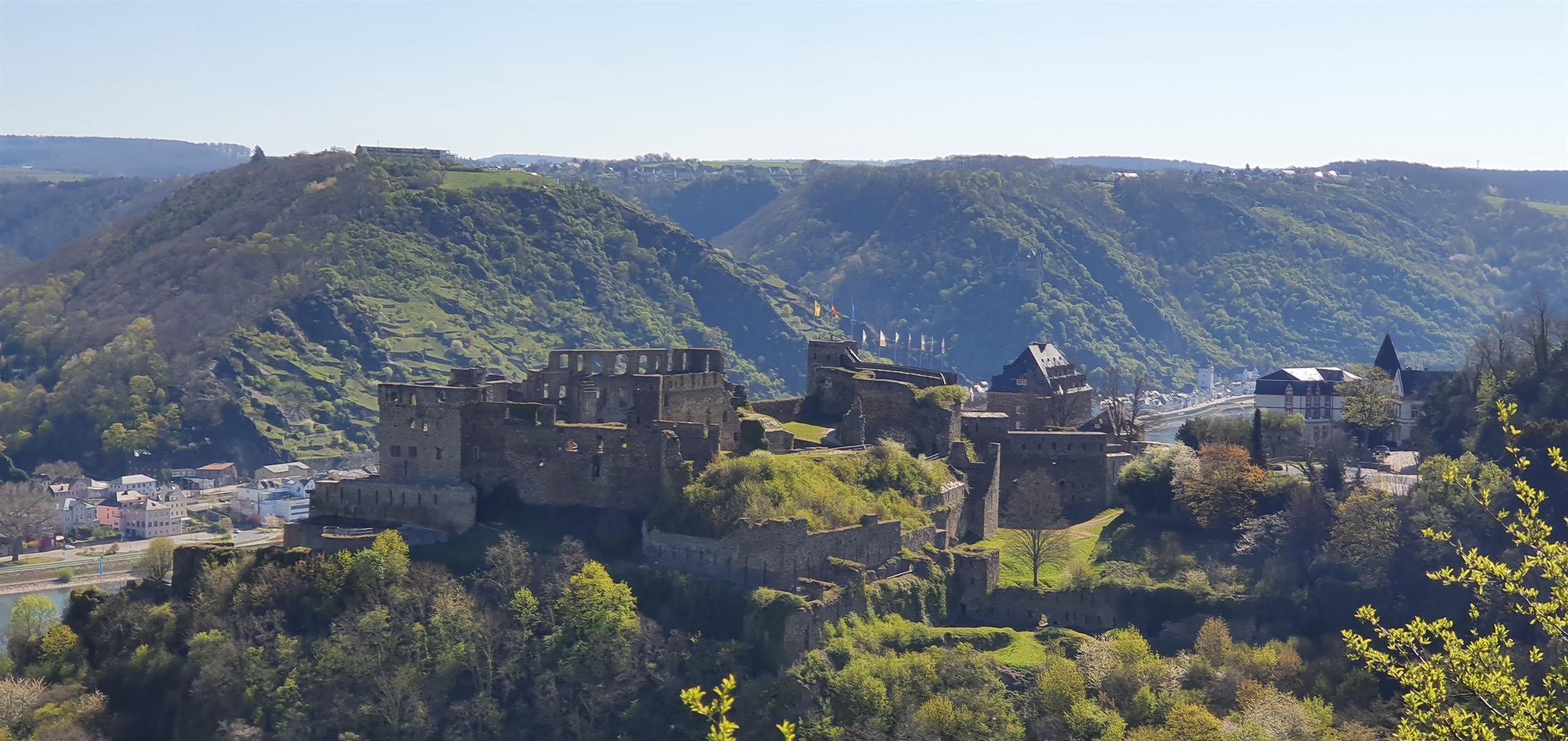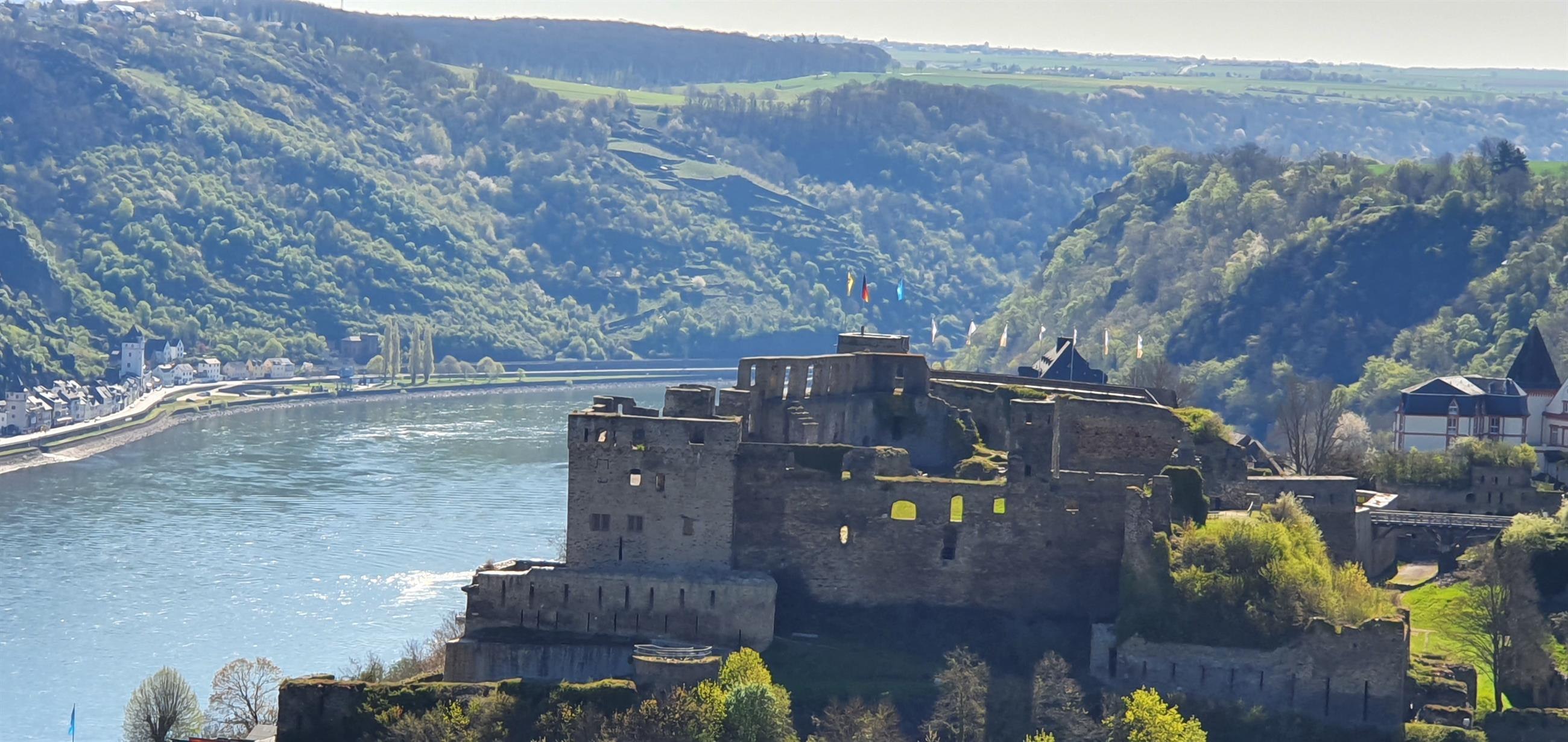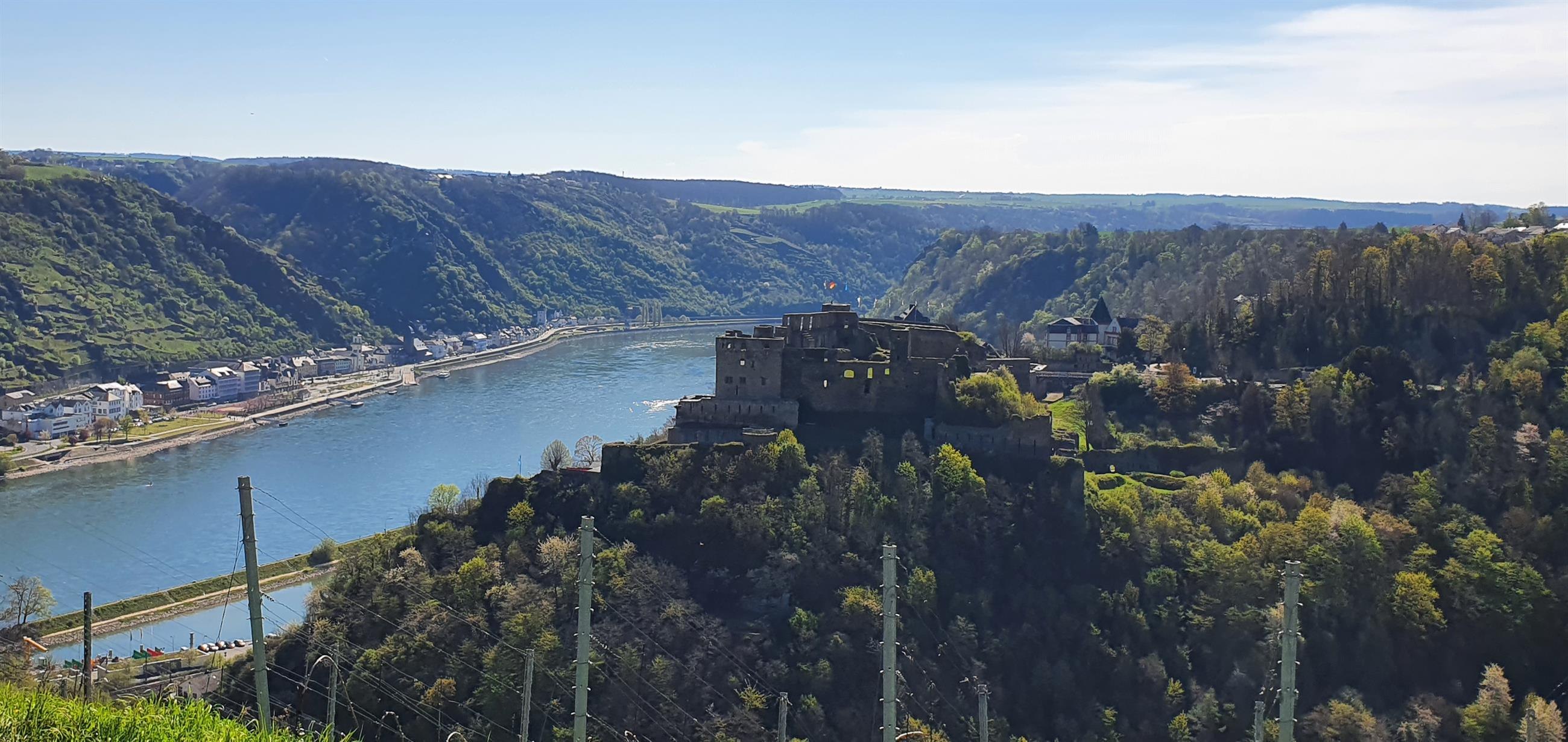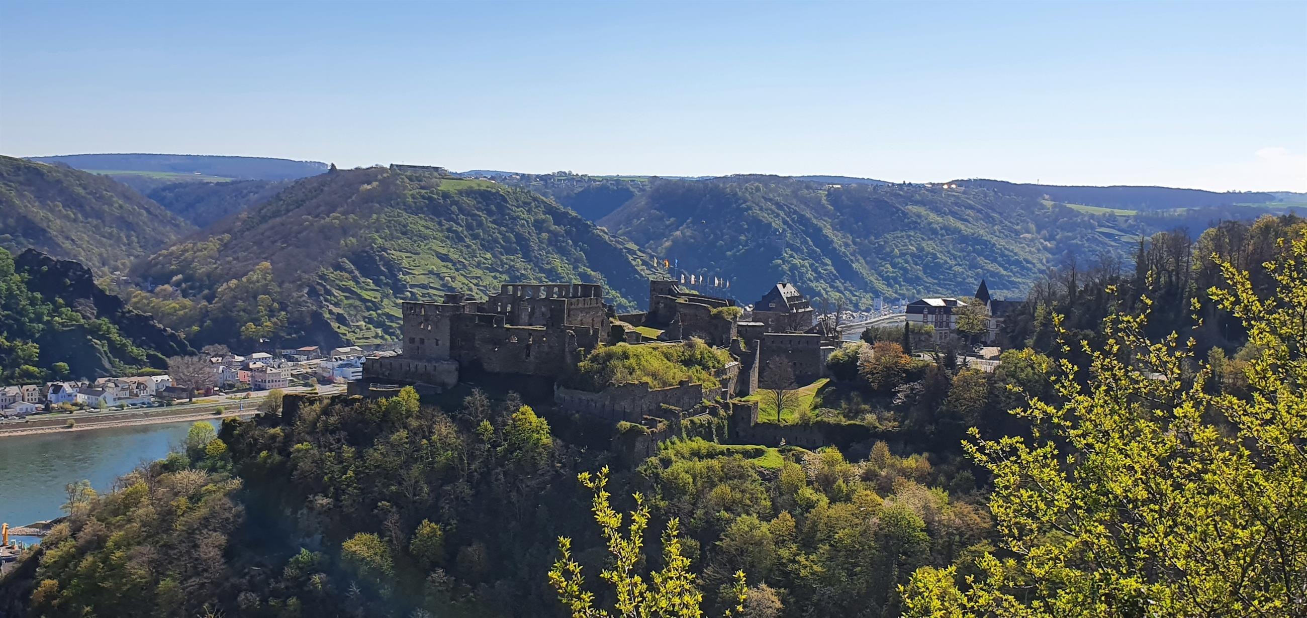 Viewpoint "Rheinfelsblick" opposite the Rheingoldbad in Werlau, with a great view of the castle and the Middle Rhine Valley.