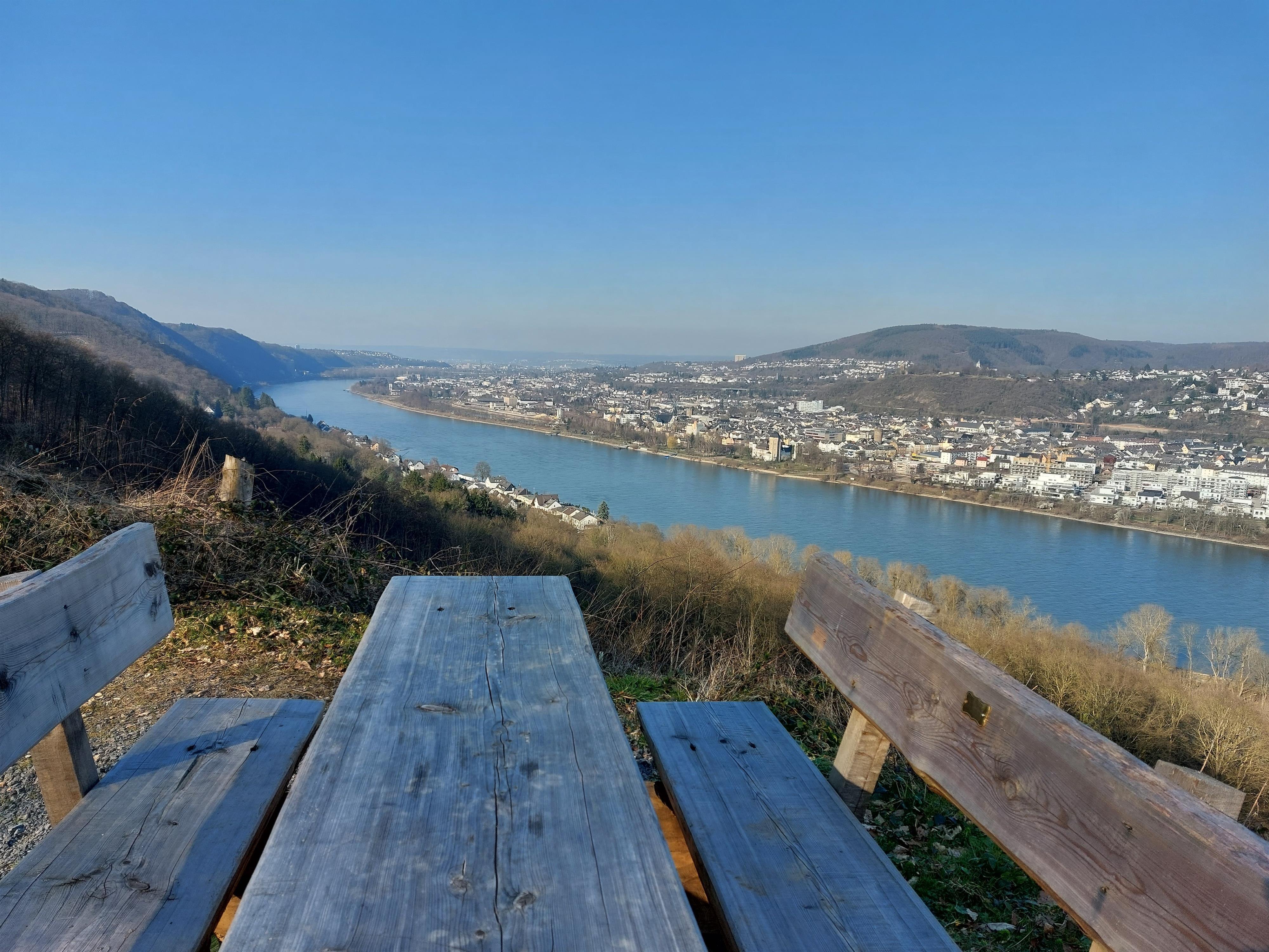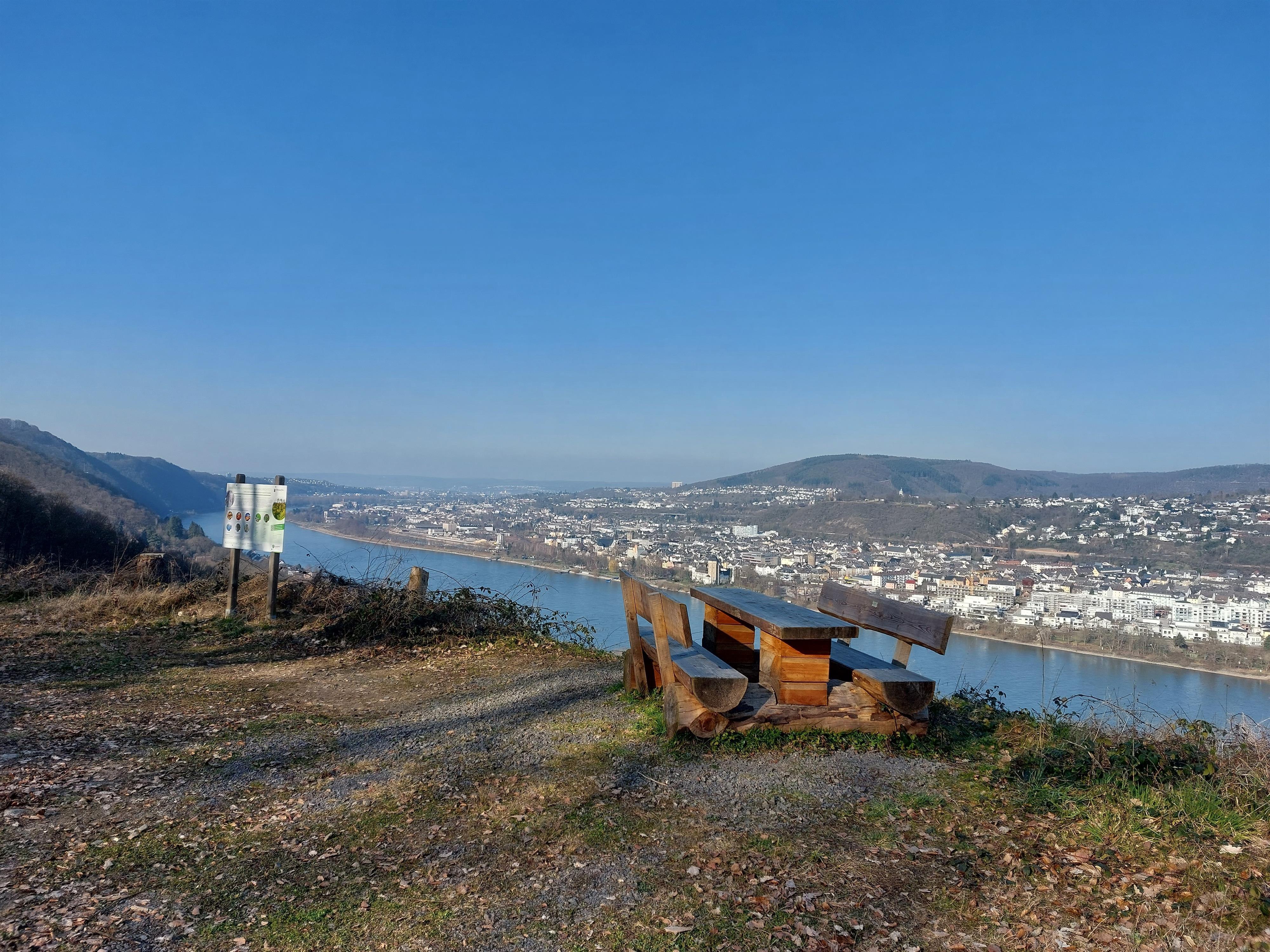 From up there, you have a fantastic view of the Rhine and the Rhine Valley. A wide panoramic view from Koblenz over Lahnstein to Braubach and the Marksburg. This viewpoint is reached at the end of the path, about 100 meters behind the St. Antonius Chapel. A table and benches invite you to linger and enjoy the view.