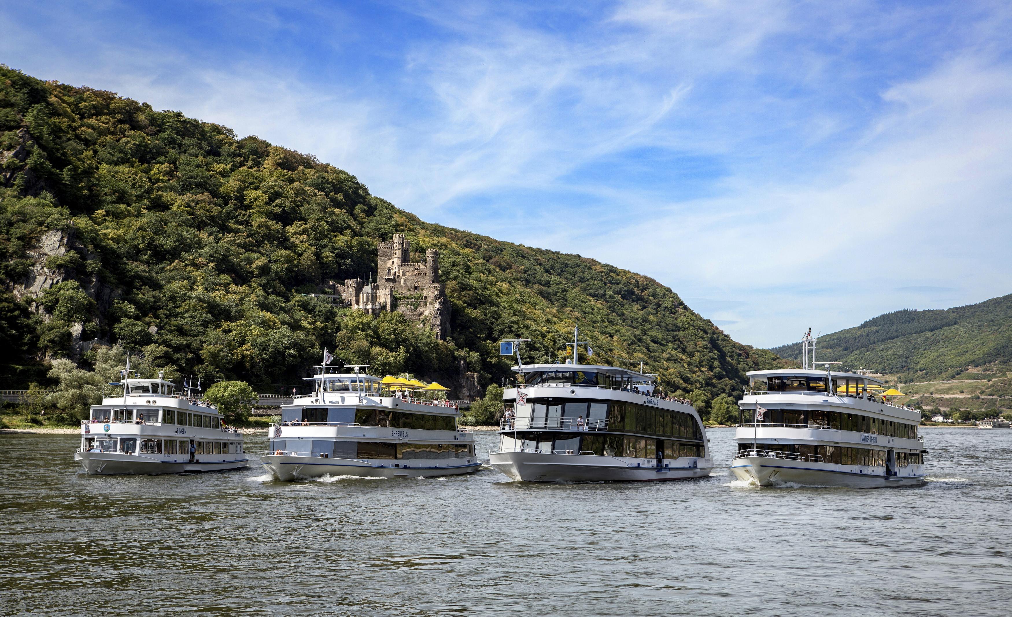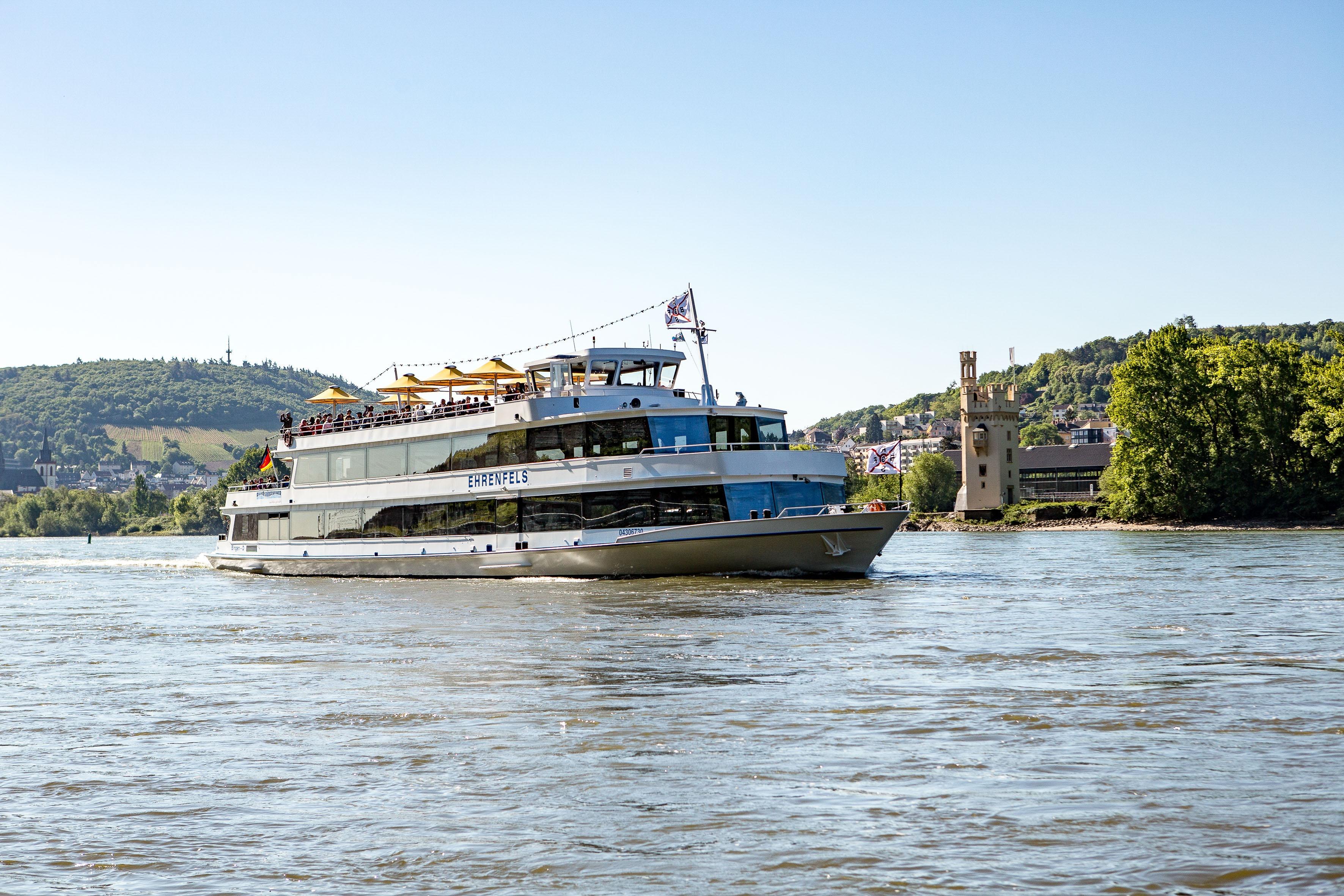 2-, 3-, or 5-hour trips around the Binger Loch, past the Mouse Tower, the ruins of Ehrenfels, Rheinstein Castle, and Reichenstein, to St. Goarshausen, Kaub, and Bacharach have been and continue to be included in the schedule.