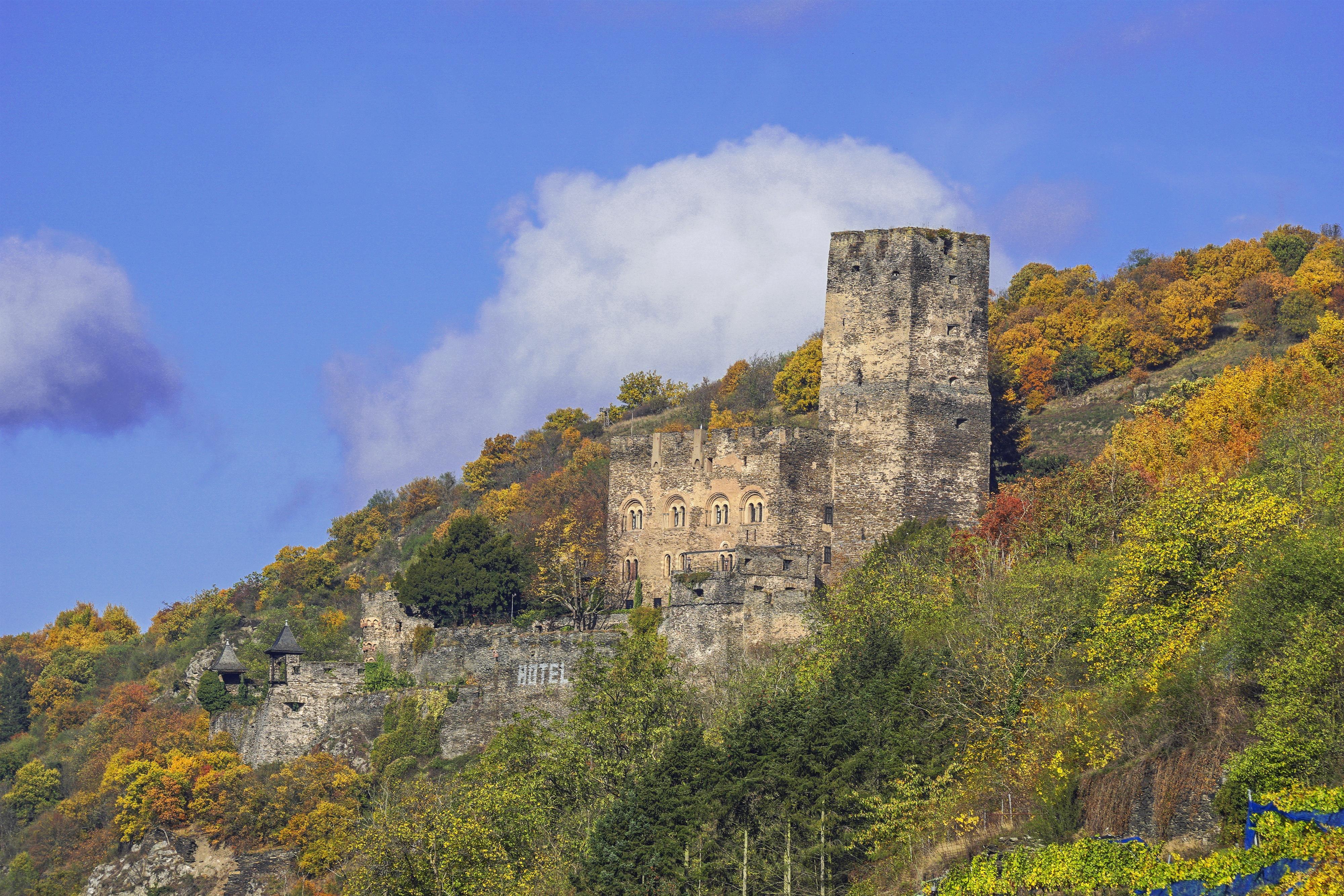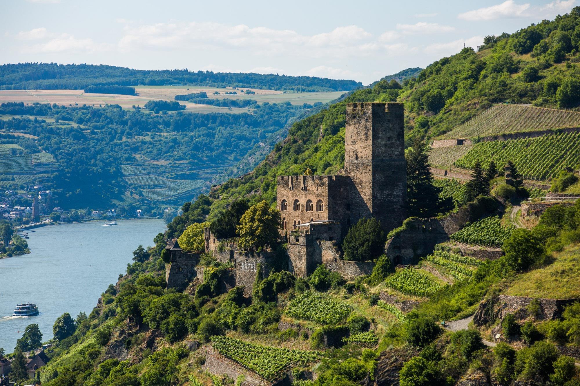 Surrounded by vineyards, the castle hotel is located above Kaub.