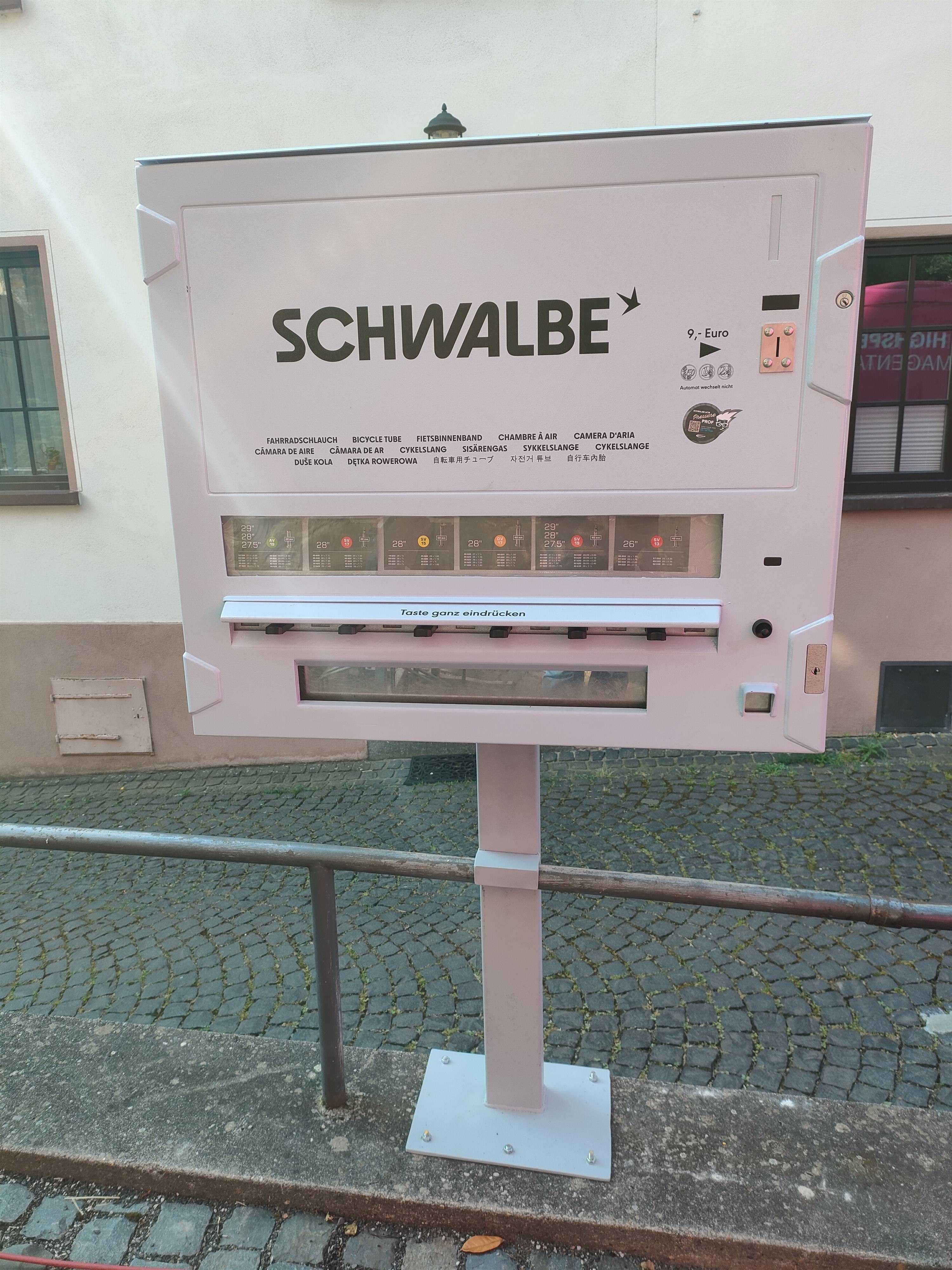 The bike repair station is complemented by a tube vending machine where tubes in various sizes can be purchased. The vending machine is operated by the company Radsport Kipp from Simmern, phone +49-6761-9299996.