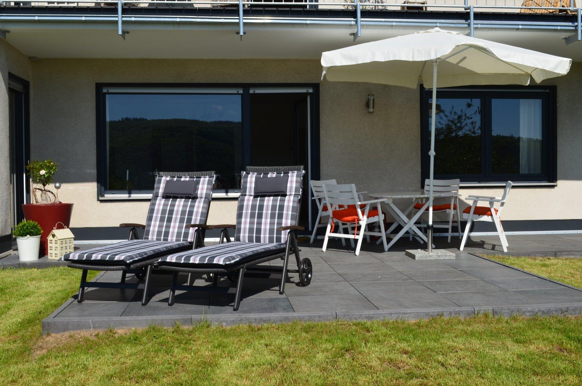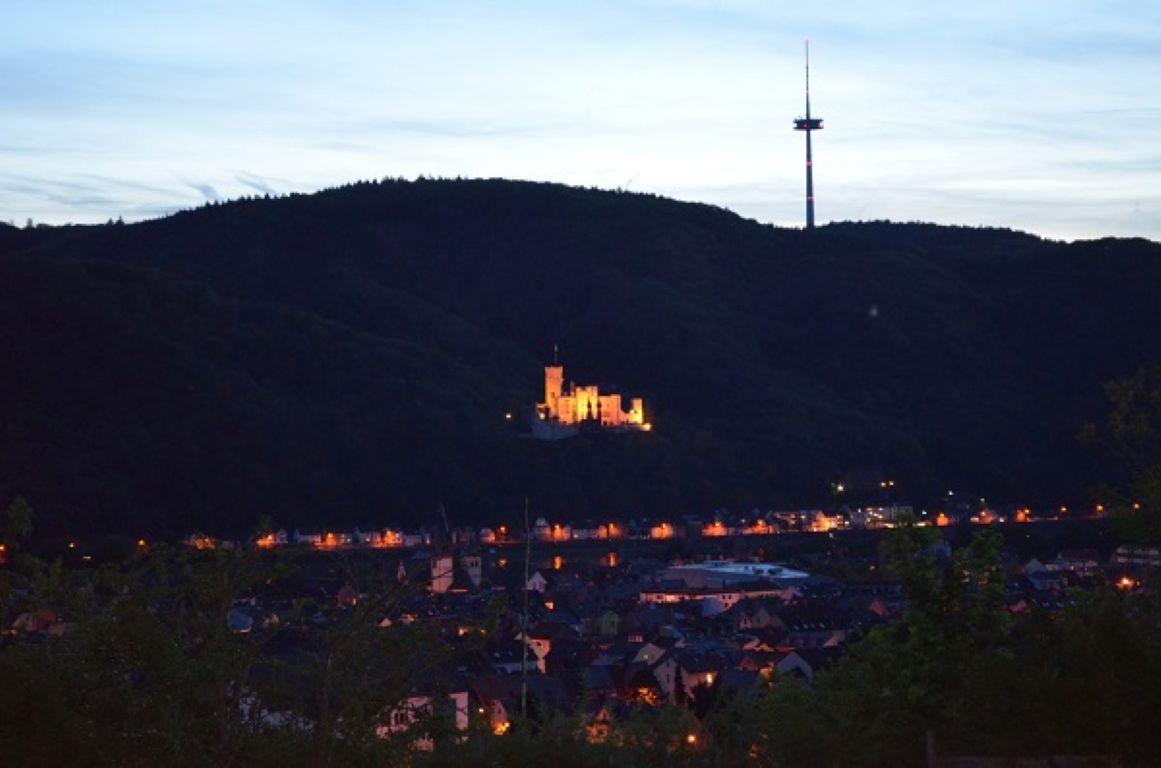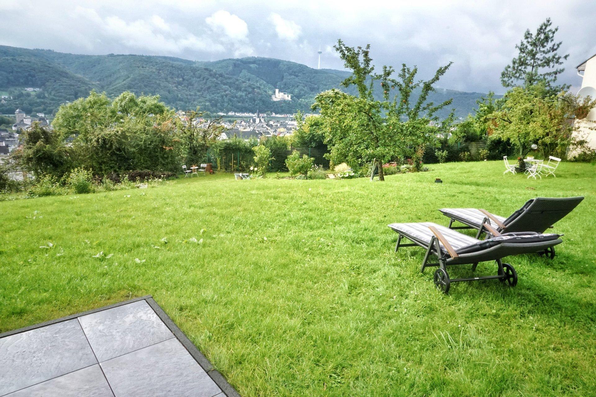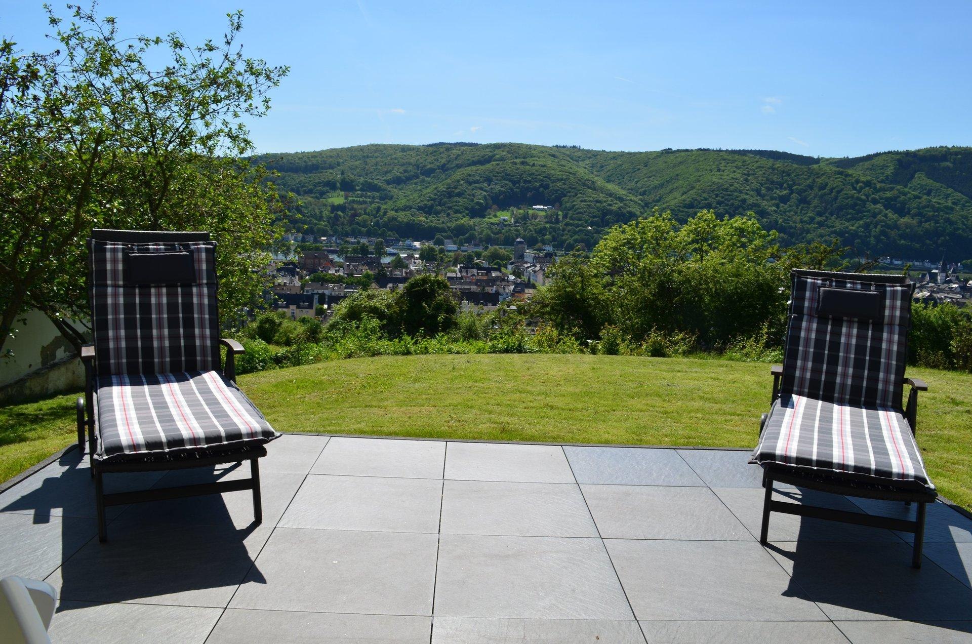 105 sqm holiday apartment for up to 4 people in a hillside location in Lahnstein, 2 bedrooms, living/dining room, kitchen, bathroom, 28 sqm southwest terrace with a magnificent view of the Rhine Valley and Stolzenfels Castle.