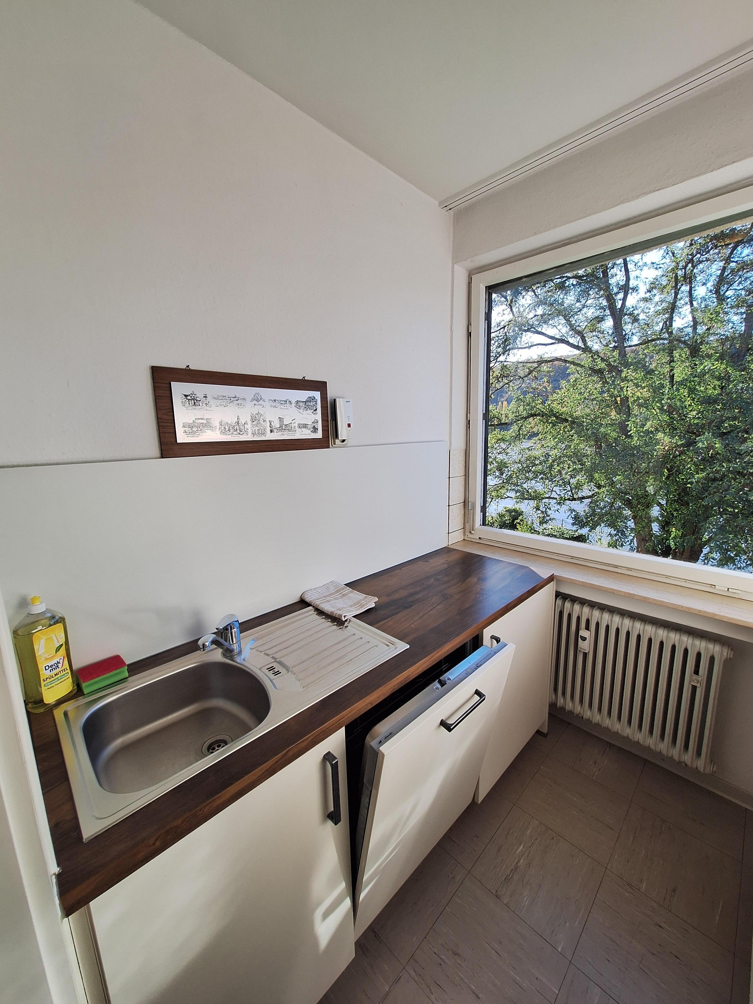 In a 3-story multi-family dwelling (10), the apartment is located on the 1st floor on the west side; thus offering evening sun and views of the Rhine/Hunsrück from the loggia. The apartment features an open bedroom adjacent to the bright living space, where you will sleep in a French bed measuring 1.60 x 2.00 m. With the balcony door open, you can hear the soothing sounds of the Rhine. In the lockable bicycle cellar, you can securely store your bikes, or you can make use of the city bikes available for rent on-site.