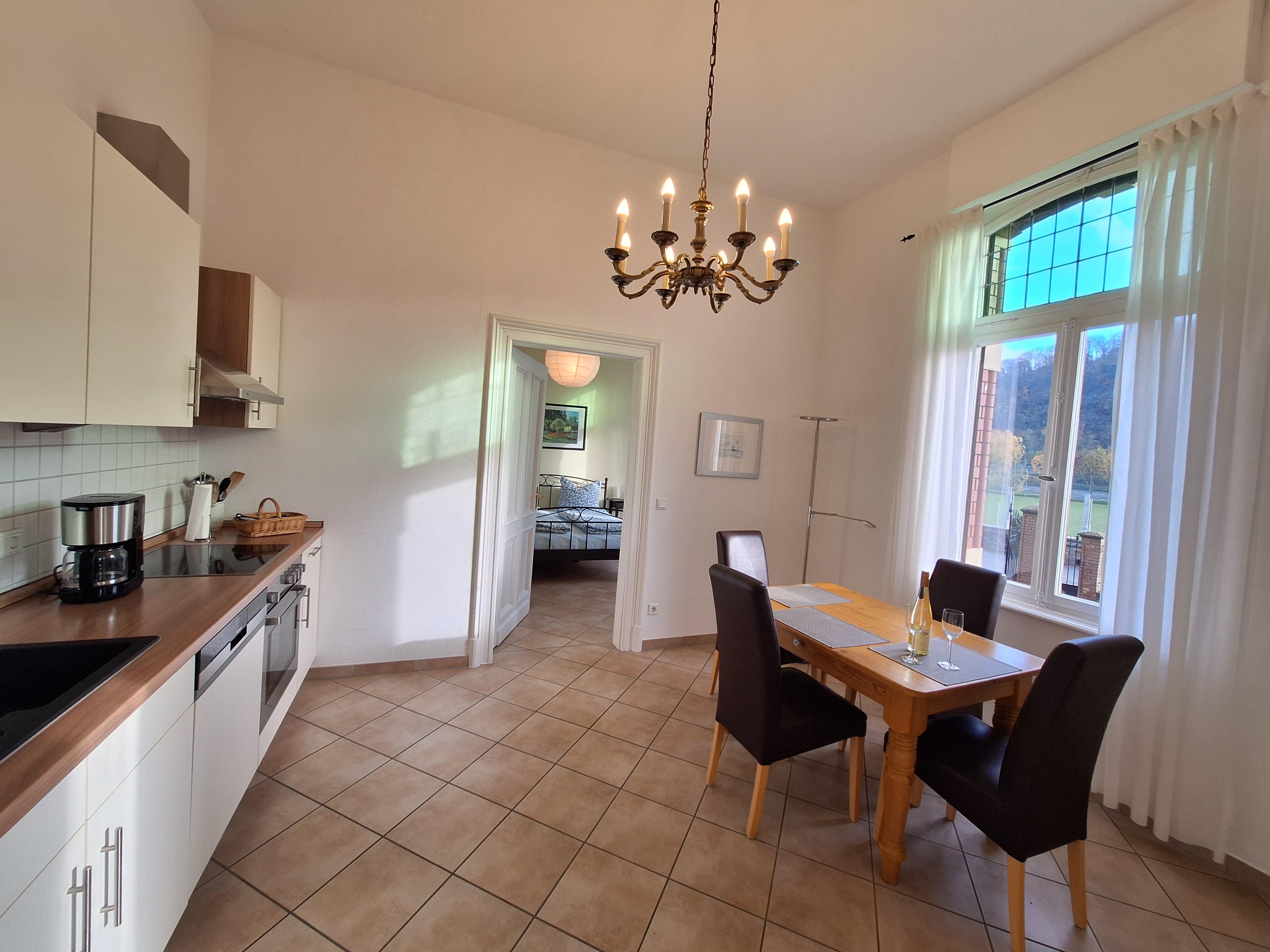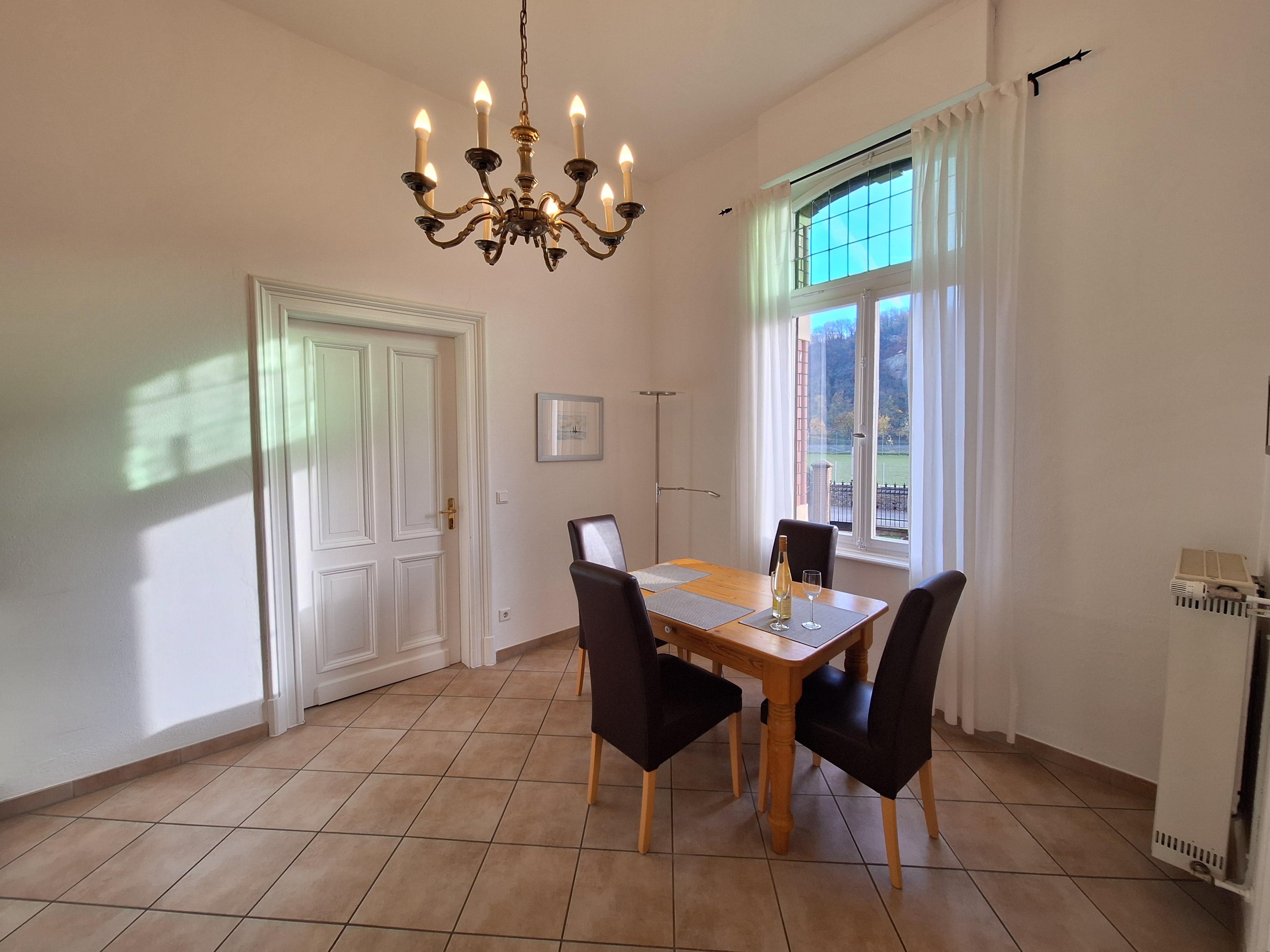 The beautiful 75 m² non-smoking apartment is fully equipped and features a living room with a bay window and a view of the Rhine as well as the Ehrenbreitstein Fortress, satellite TV, stereo system, dining room/kitchen with a complete kitchenette and a dining area with a view of the Rhine, a bedroom for 2 persons with a Rhine view, as well as a spacious daylight bathroom facing the garden with a comfort shower. The hallway/wardrobe is furnished with a Jugendstil window and additional seating.