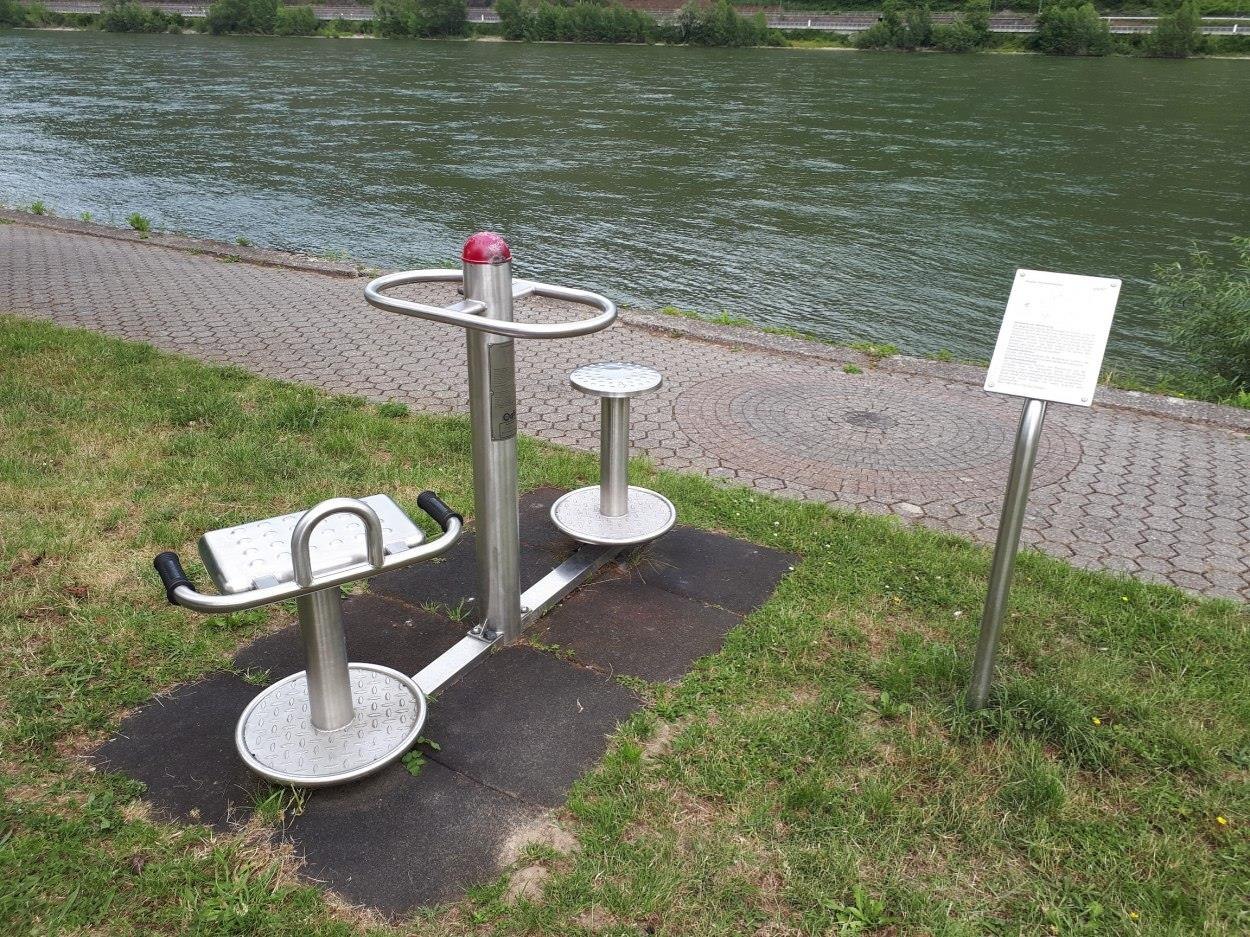 Fitness course with four fitness devices along the banks of the Rhine.