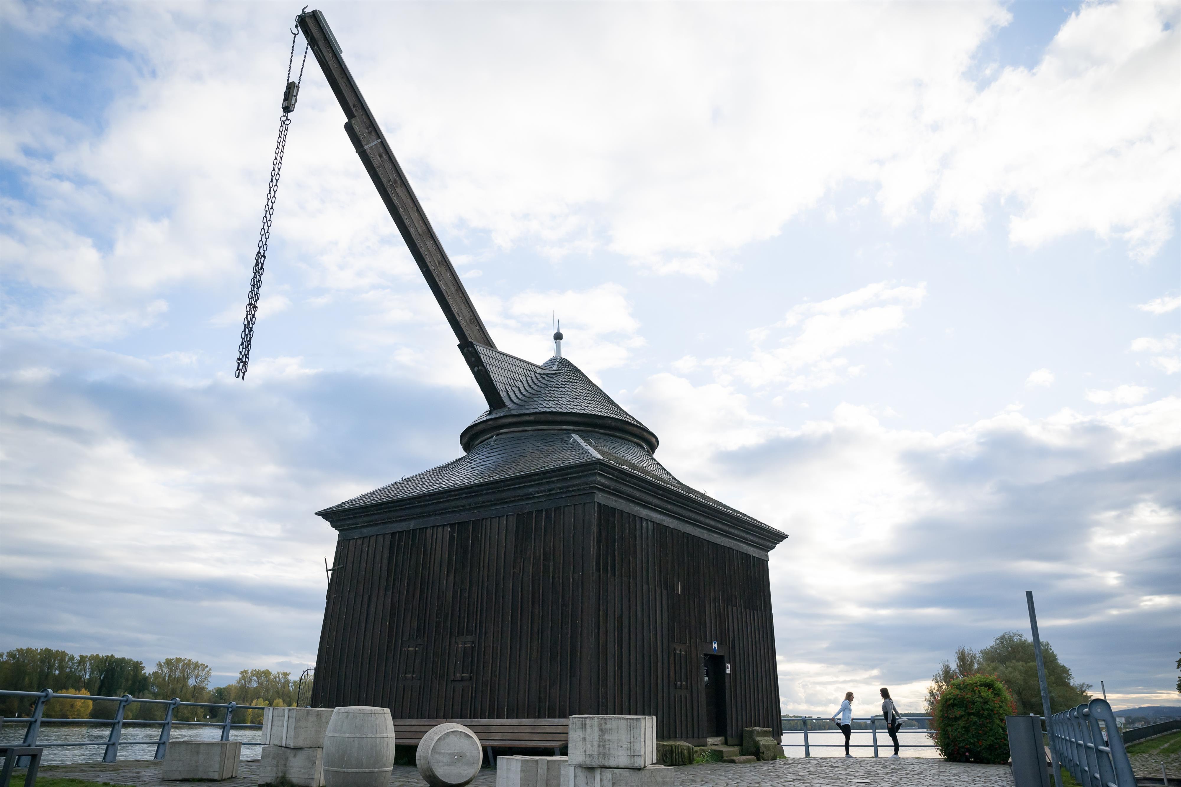 The town's landmark is the historic Rhine crane built in 1743/44. The crane is a timber-frame construction with a base area of approx. 8 x 8 meters. Its roof top is rotatably mounted together with the wooden jib. Prisoners were usually used to drive the pulley by means of large treadwheels inside the crane (even today the "treadmill" is synonymous with unpleasant, uniform work). The quay wall was built at the same time as the crane from stone blocks of the former Mainz castle. Of course, mainly wine barrels were loaded here.