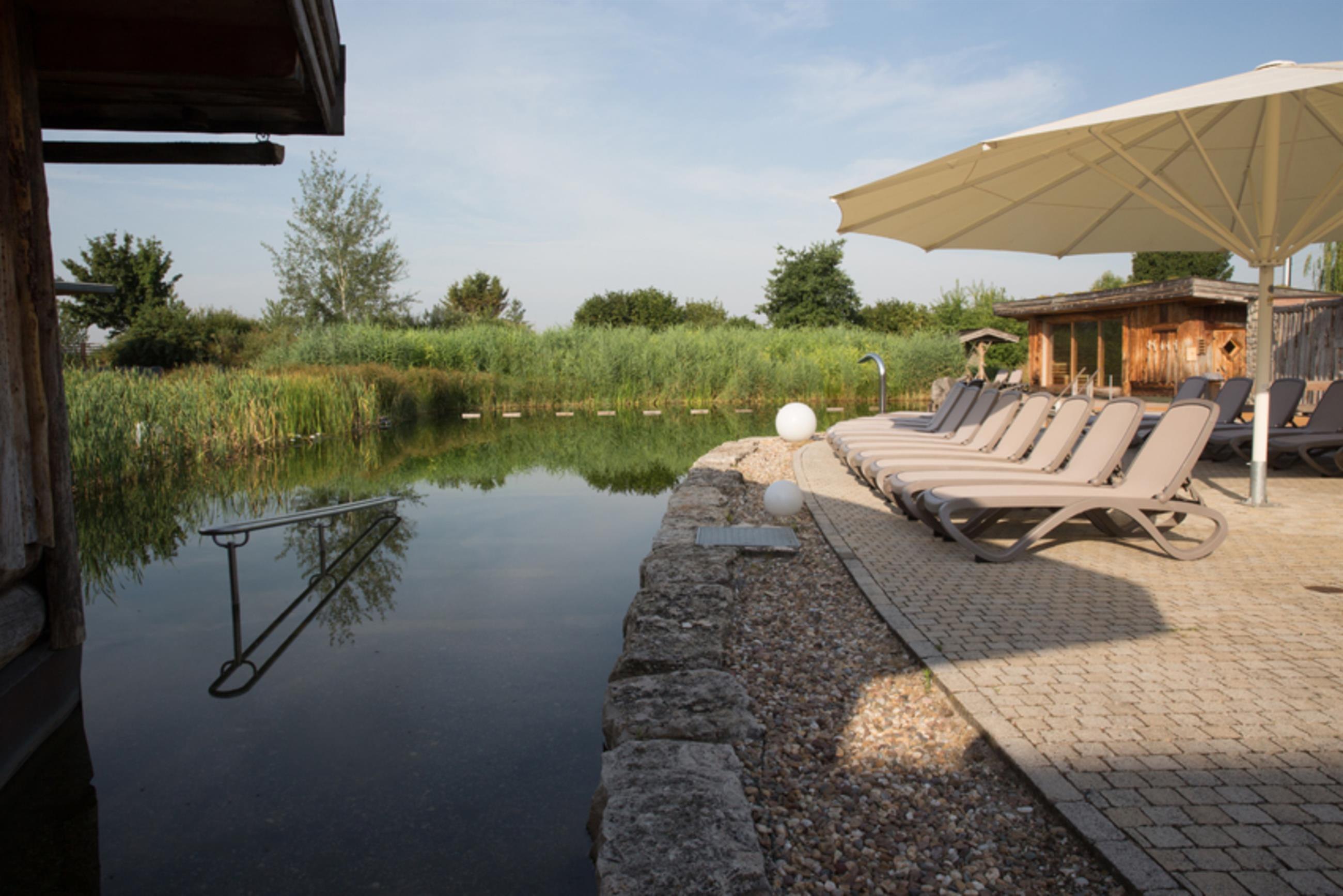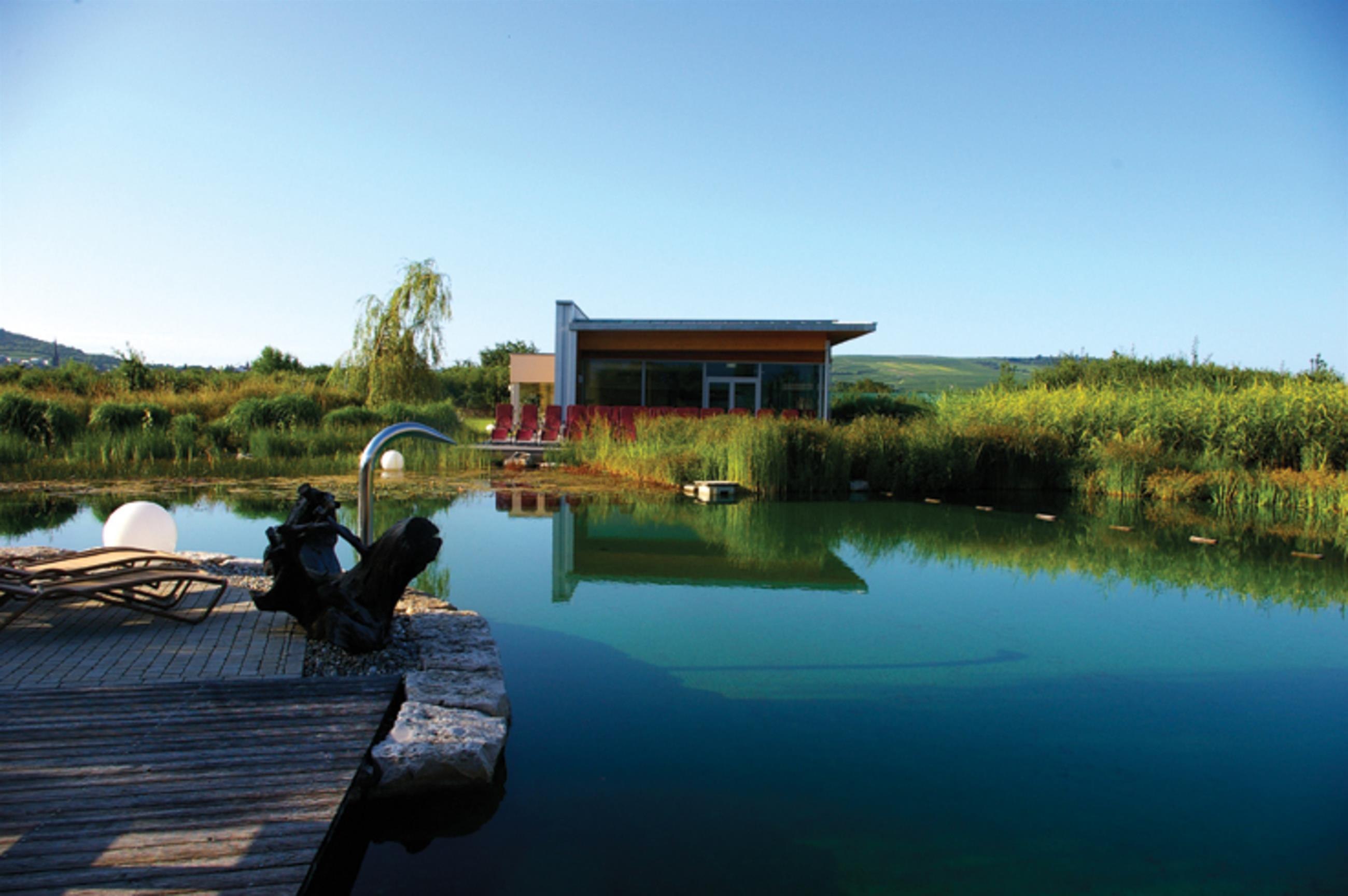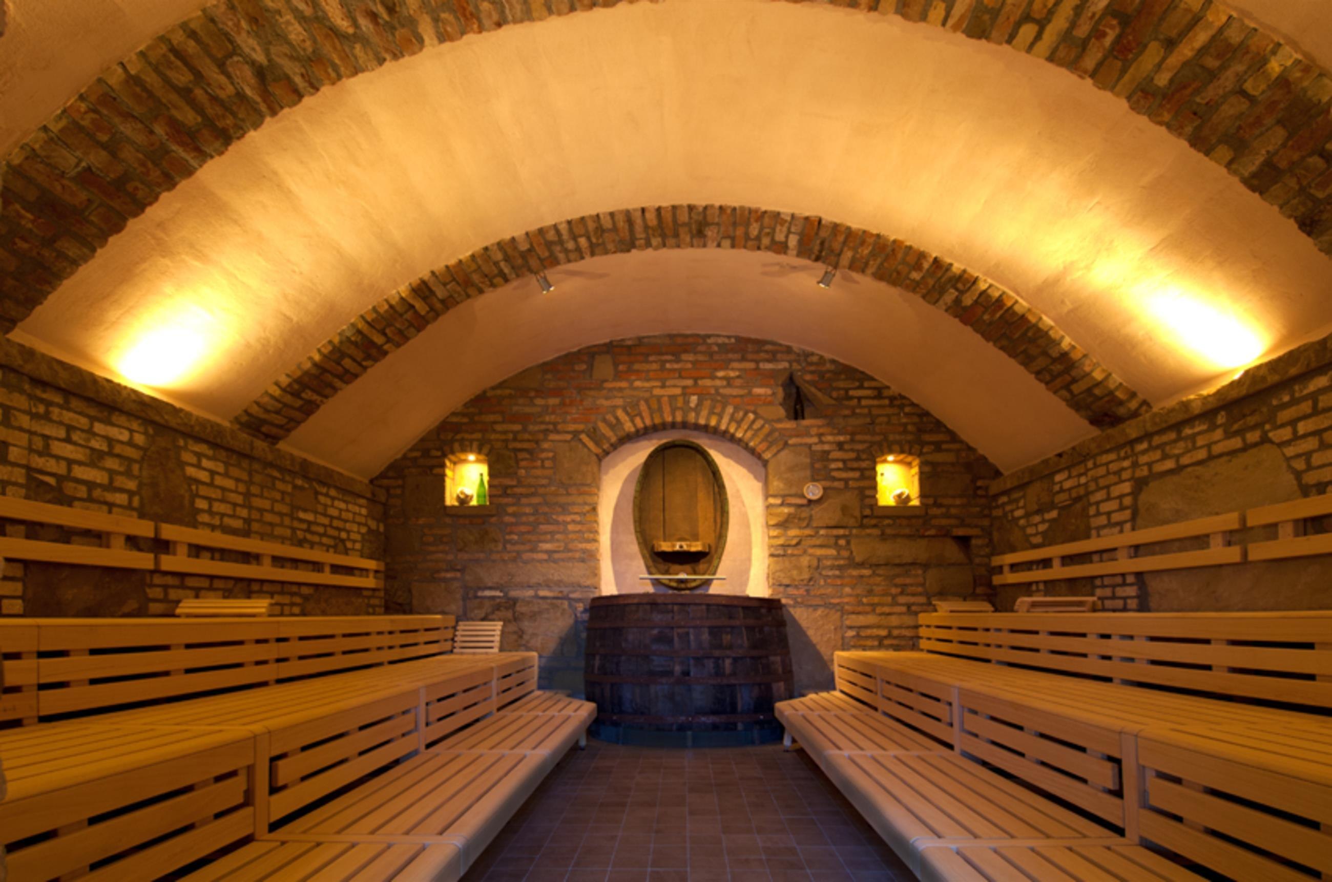 In the outdoor area of the wellness world, there are five different saunas. Here, the naturally designed bathing pond, where guests can take a dip, provides a refreshing experience. Unique is the wine cellar sauna: constructed with natural materials, the vaulted ceiling and original wine barrels create an experience reminiscent of a winemaker. The Kelo sauna house offers a special sauna experience, and in addition, visitors can expect a 100-degree infusion sauna, an 85-degree panorama sauna, and a 70-degree meditation sauna.