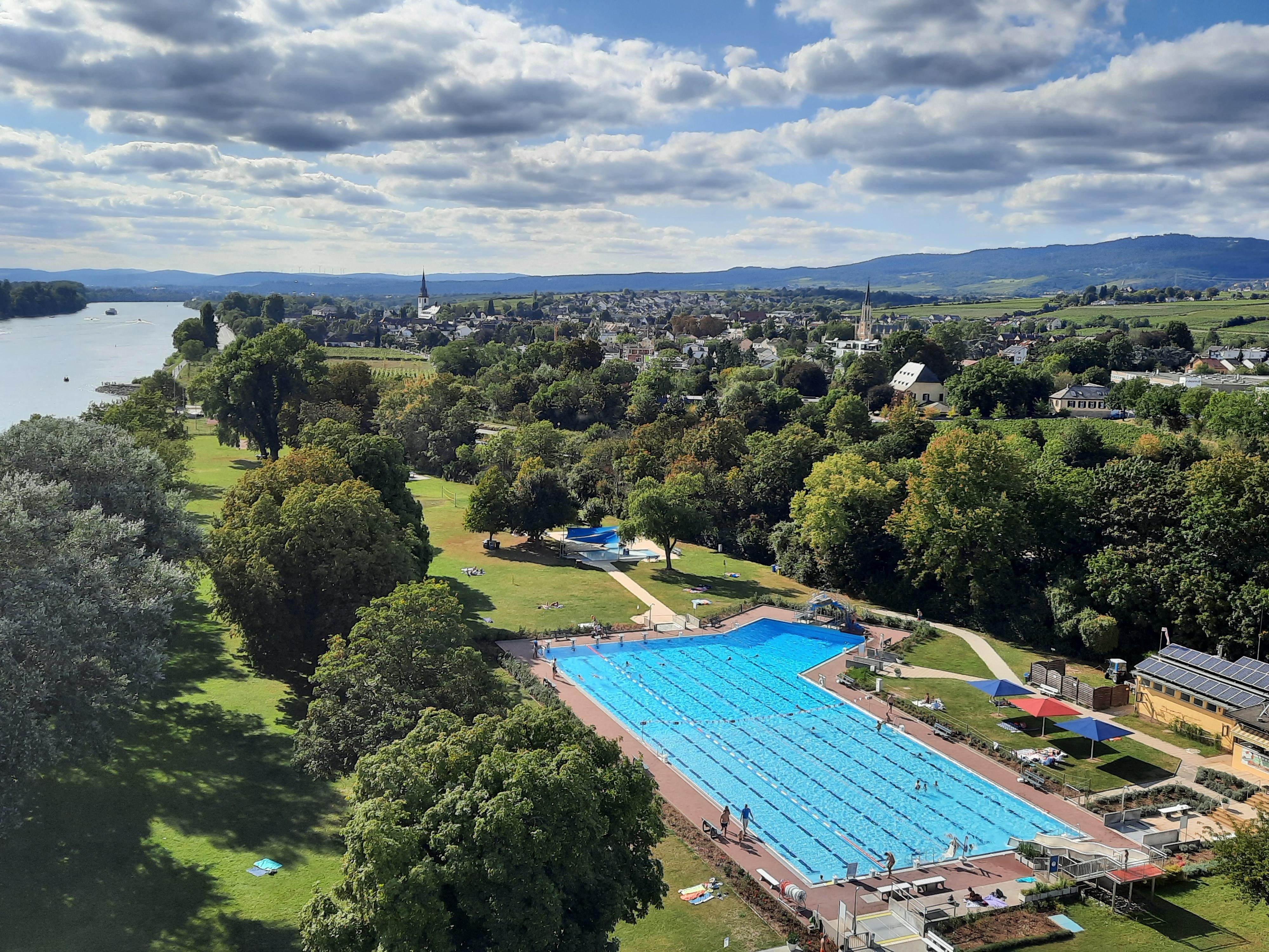 The heated, municipal outdoor pool has a large 50-meter pool with a non-swimmer and a swimmer's area, a large slide, a diving tower and starting blocks for competitions. There is also a children's pool, a beach volleyball court and a huge sunbathing area with a direct view of the Rhine. The main pool is surrounded by roses in summer. Drinks and snacks, such as ice cream or chips, can be purchased at the outdoor pool.