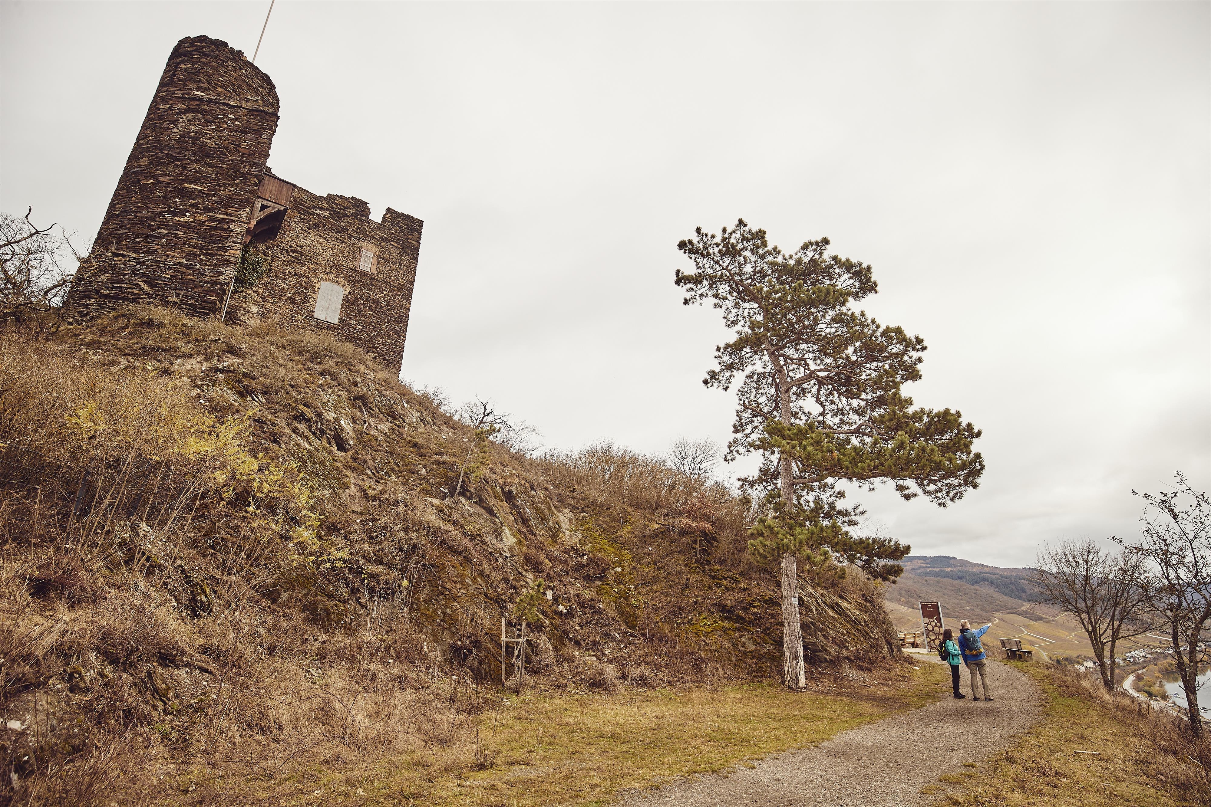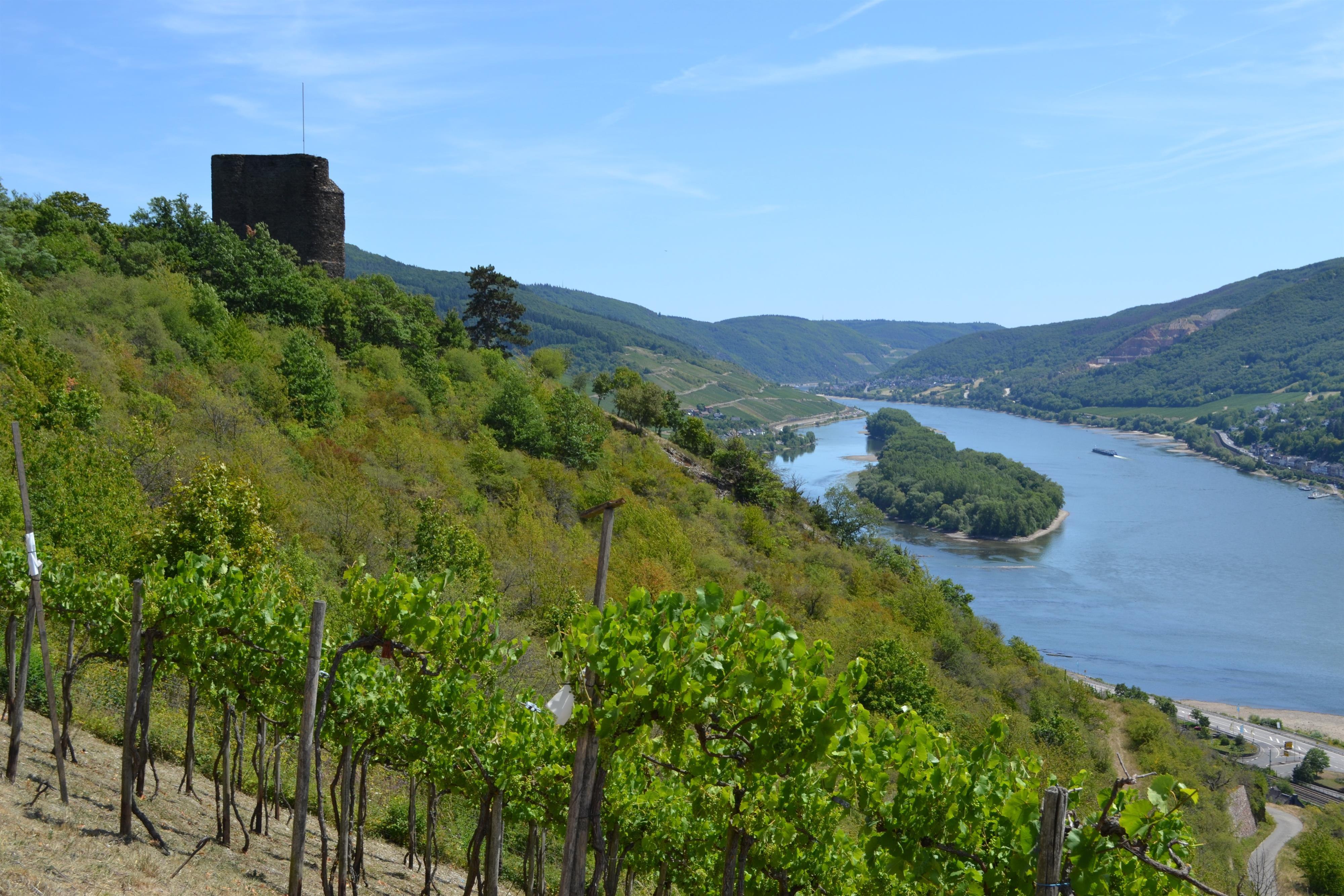 Is there any connection between Nollig Castle and the “Devil’s Ladder of Lorch”? According to this legend, the knight Sabo suffered for his peculiar inhospitable nature with the kidnapping of his daughter by dwarves. The fortification consisted of the free-standing tower and was protected by a shield wall on the mountain side. The term used for this is more a castle watch (watchtower) and less a castle. Nollig Castle was probably constructed at the beginning of the 14th century and secured the hilltop. This made it possible for the city of Lorch to protect itself from attacks from above. What is certain however – as is discernible up to today on the inner side of the preserved remains of the walls – is that a predecessor building made of wood must have existed. This had been covered by stonework at a later stage – a decidedly unusual way of construction. The Nollig ruin is in private ownership today and cannot be entered by visitors. However, the Rheinsteig trail which runs underneath permits a view of the monument.