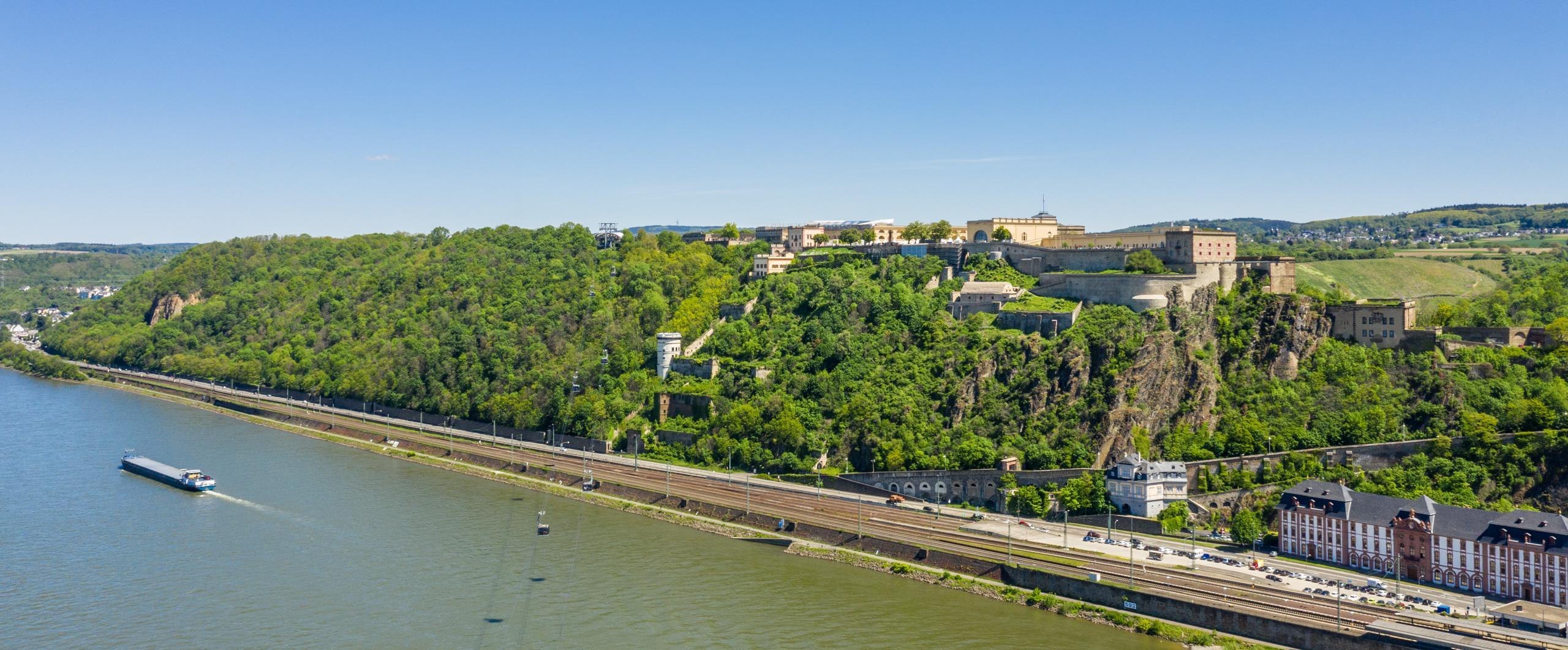 A unique experience high above the Rhine: The Koblenz Cable Car has been connecting the old town with Ehrenbreitstein Fortress since 2011 and is one of the most modern cable car systems in Europe. With its spacious panoramic cabins, visitors glide silently over the Rhine, enjoying breathtaking views of the UNESCO World Heritage Site Upper Middle Rhine Valley, the Deutsches Eck, and the historic old town of Koblenz.