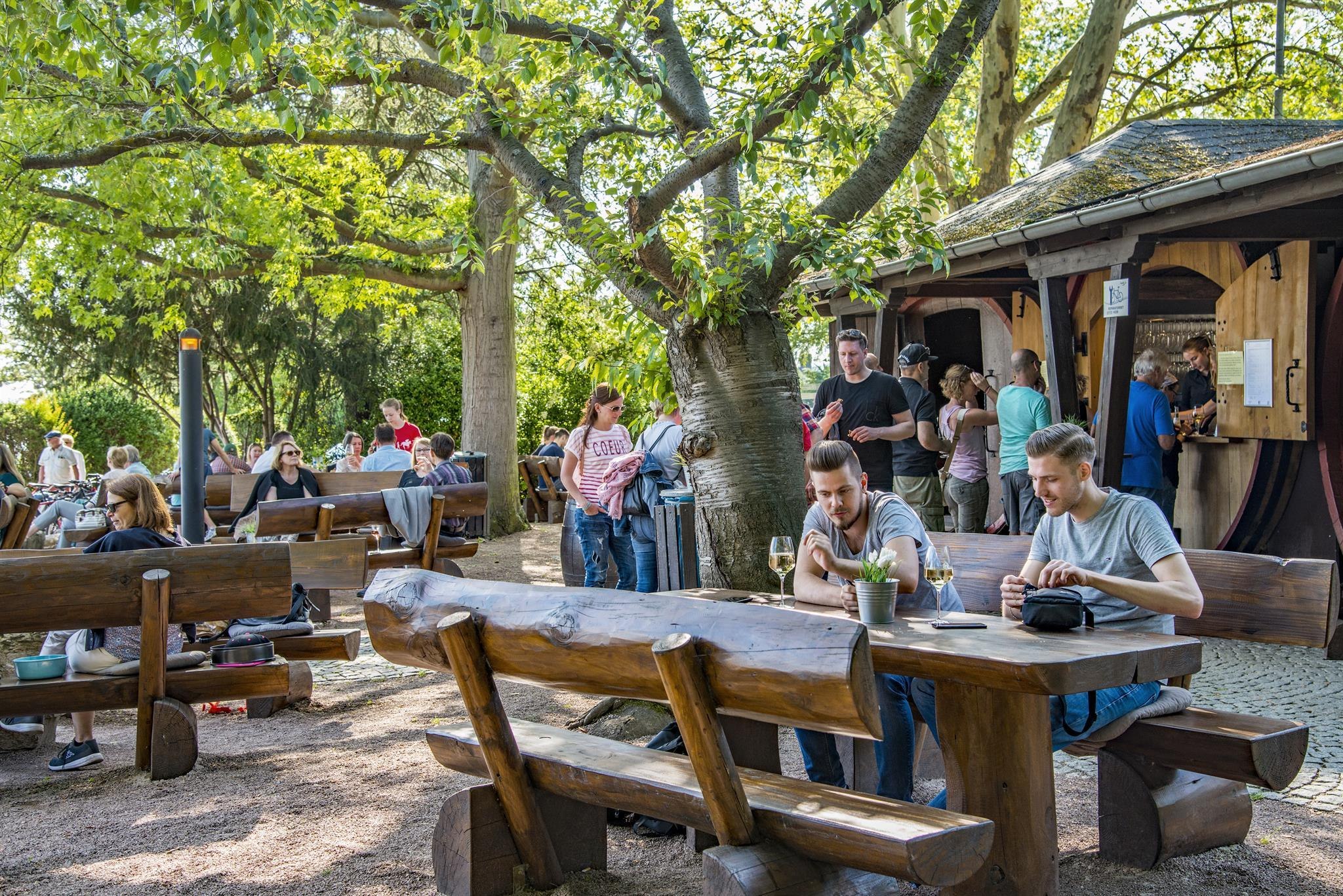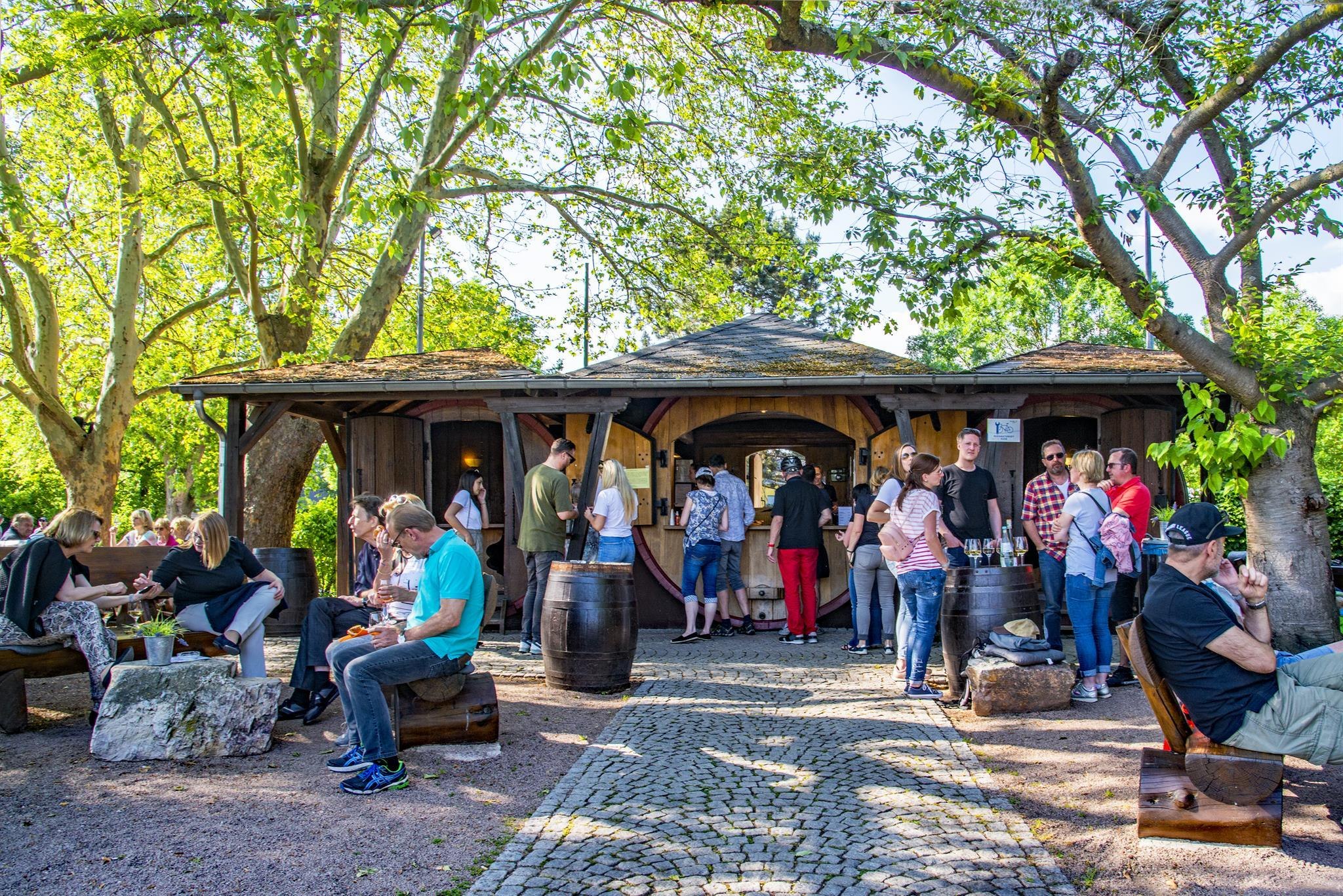 Only a large meadow separates you from the picturesque banks of the Rhine. Rustic seating invites you to linger, and if the weather doesn't cooperate, you can comfortably fit up to 10 people in two barrels. Due to the unique location, the Hattenheim barrels are among the most beautiful wine tasting stands in Germany.