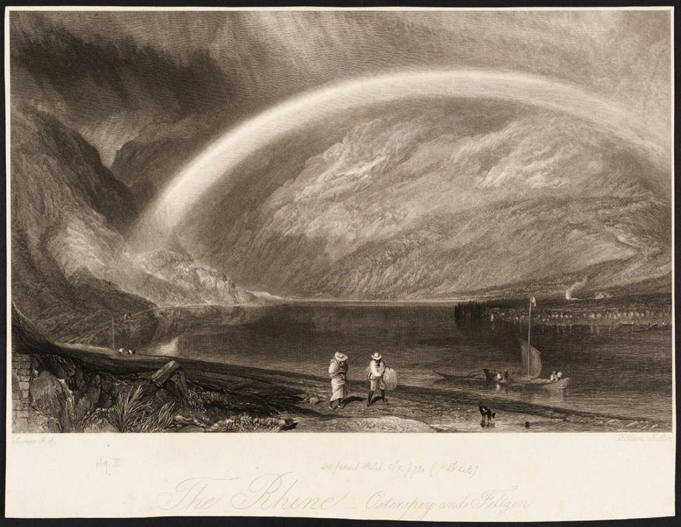 At Braubach, Turner crossed back to the left bank of the Rhine on August 23, 1817. Just before the town of Boppard, Turner looks back at the expansive loop of the Rhine. The play of light with the rainbow makes this watercolor one of the most charming representations from the series of Middle Rhine motifs. Originally, this watercolor (along with 35 other views) was intended for the publisher B. Cooke. He later decided against the project, which did not prevent Turner from executing the sketches anyway.