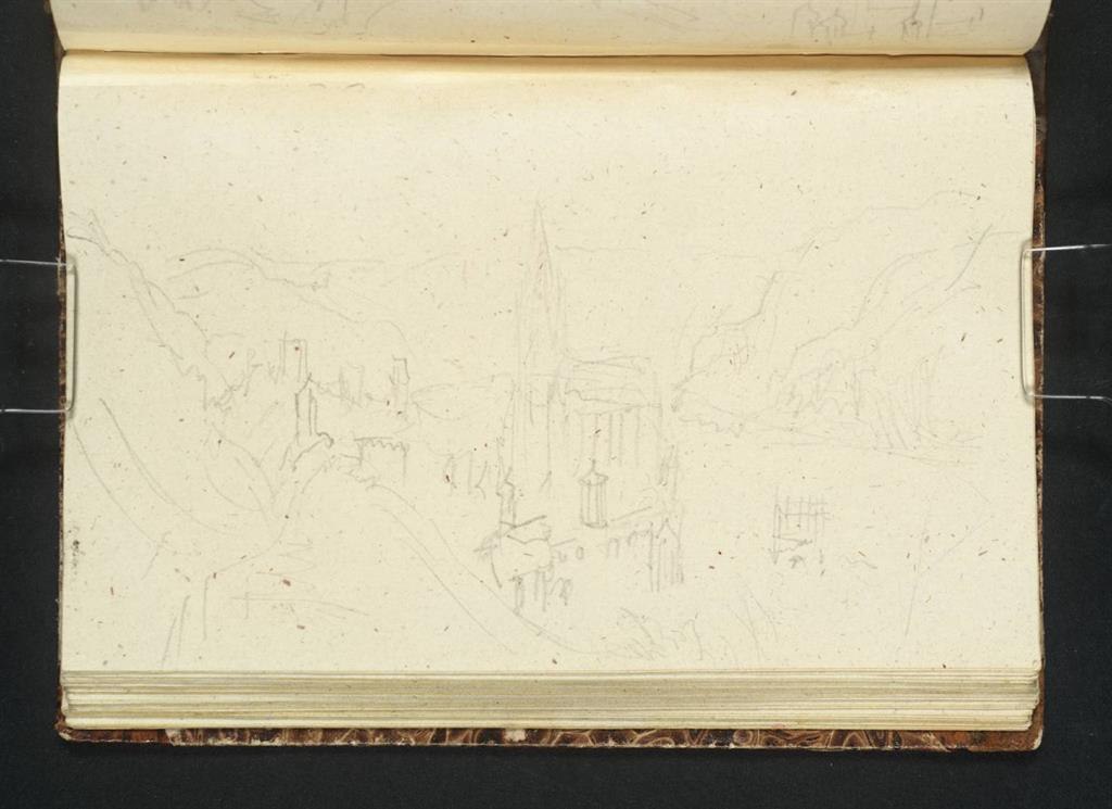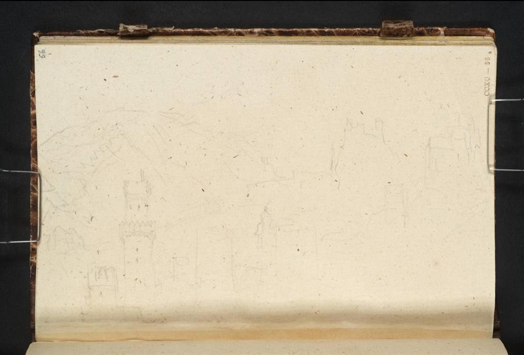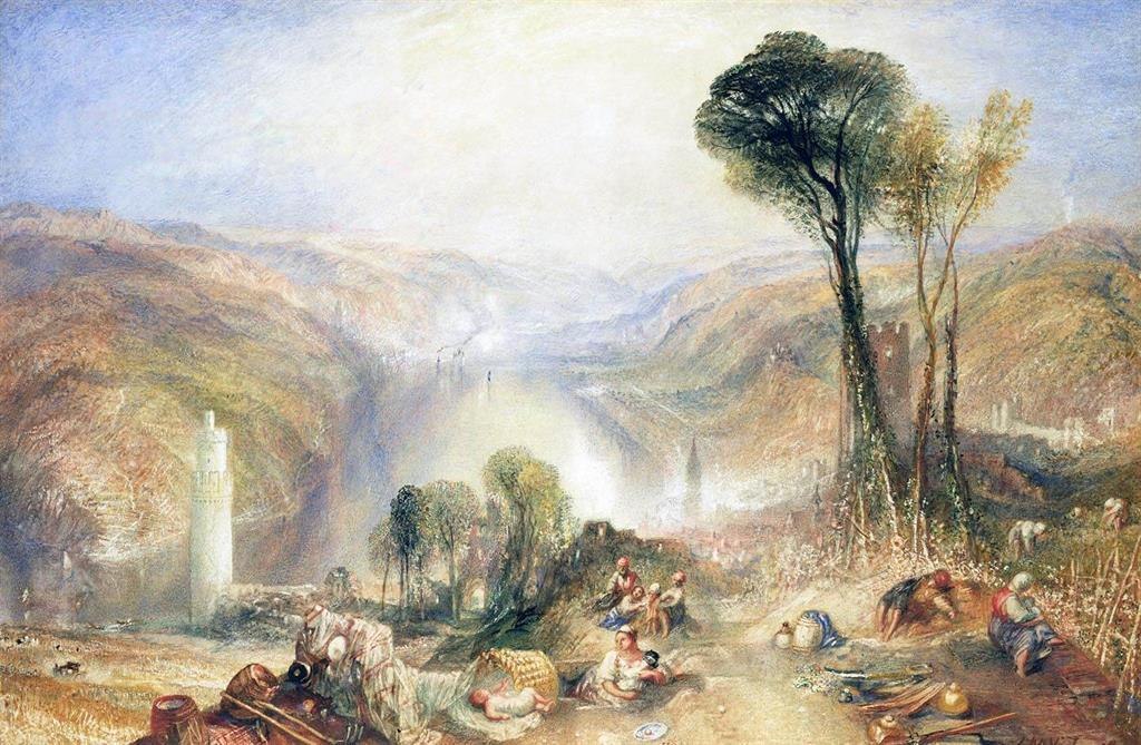 This watercolour combines at least four different perspectives. Turner assembled them to form a single painting using his sketches for reference. The main view of the Rhine Valley originates from an elevated location, from the direction of Urbar. The view of the ruined tower behind the trees and parts of the foreground also depict impressions that Turner sketched while walking towards Urbar. The »Ox Tower« was inserted into the picture as a separate element. According to this view, the tower would have been over 100 metres high. Turner made these adjustments for reasons of compositional harmony. The work became widely known in 2007 when it was put up for auction at Sotheby’s for just under 4 million Euros. This is an unusually large-format watercolour in which the brush strokes of vibrant yellow and red convey shimmering heat.