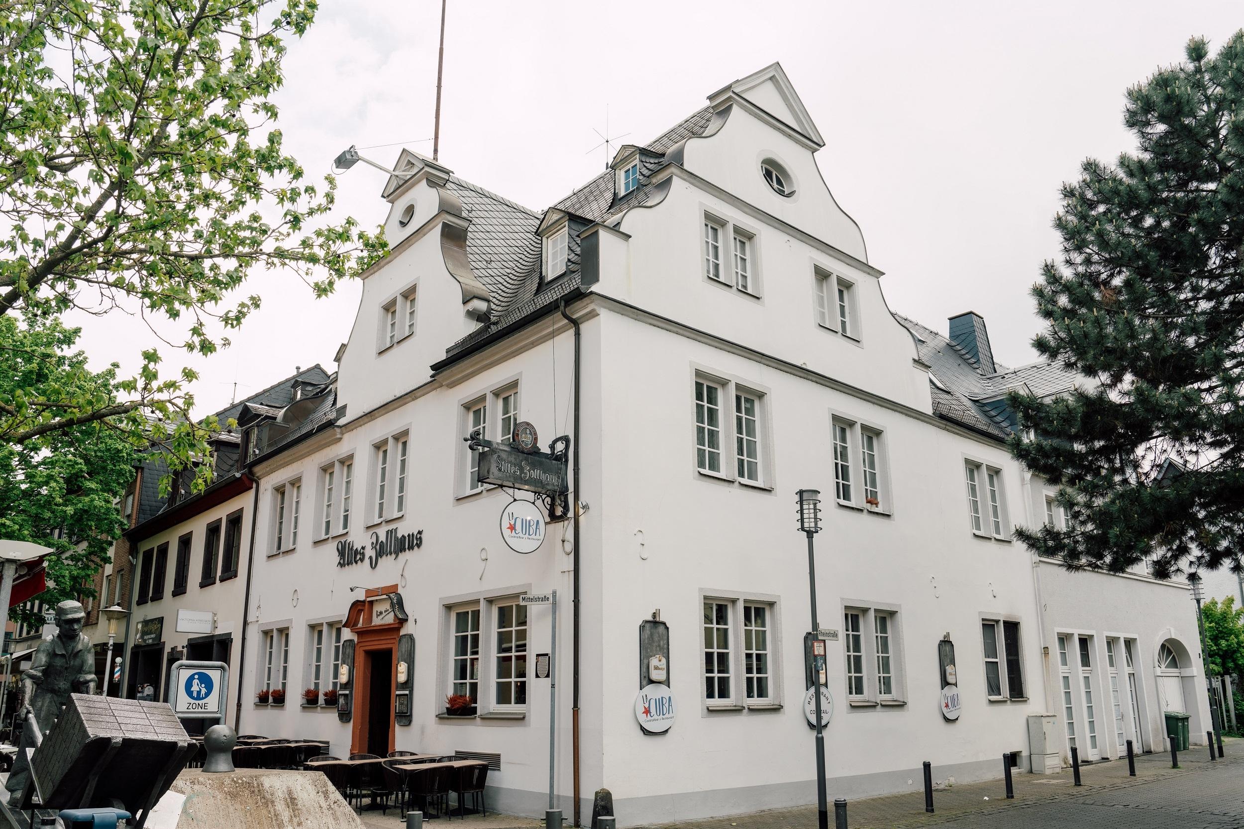 At the corner of Rhein and Mittelstraße stands the Baroque house that housed the Neuwied customs office until the 1960s. Built in 1696, the house stands out externally with its high, curved decorative gables and numerous double windows, but also internally with its castle-like thick walls, heavy beams, vaults, and spiral staircase, in contrast to the generally lighter constructed half-timbered houses of the townspeople. It was probably built by the count's government after the city's pillaging in 1694 on the site of an older house that had been burnt down, and was used as a salt magazine, as evidenced by the salt-infused wall stones and the beams inside still containing salt. As the sovereign, the count held the salt monopoly. In the house, located near the Rhine, the salt cargo imported by ship was cleared through customs, stored, and sold at a fixed price with tax markup. In 1827, the Prussian state converted the former count's salt customs and storage house into the general main customs office, which has been the customs office for the southern part of the Neuwied district since 1925; traffic congestion in the old town and the shift of customs liable goods from ship to road and rail necessitated the relocation of the customs office in 1969.